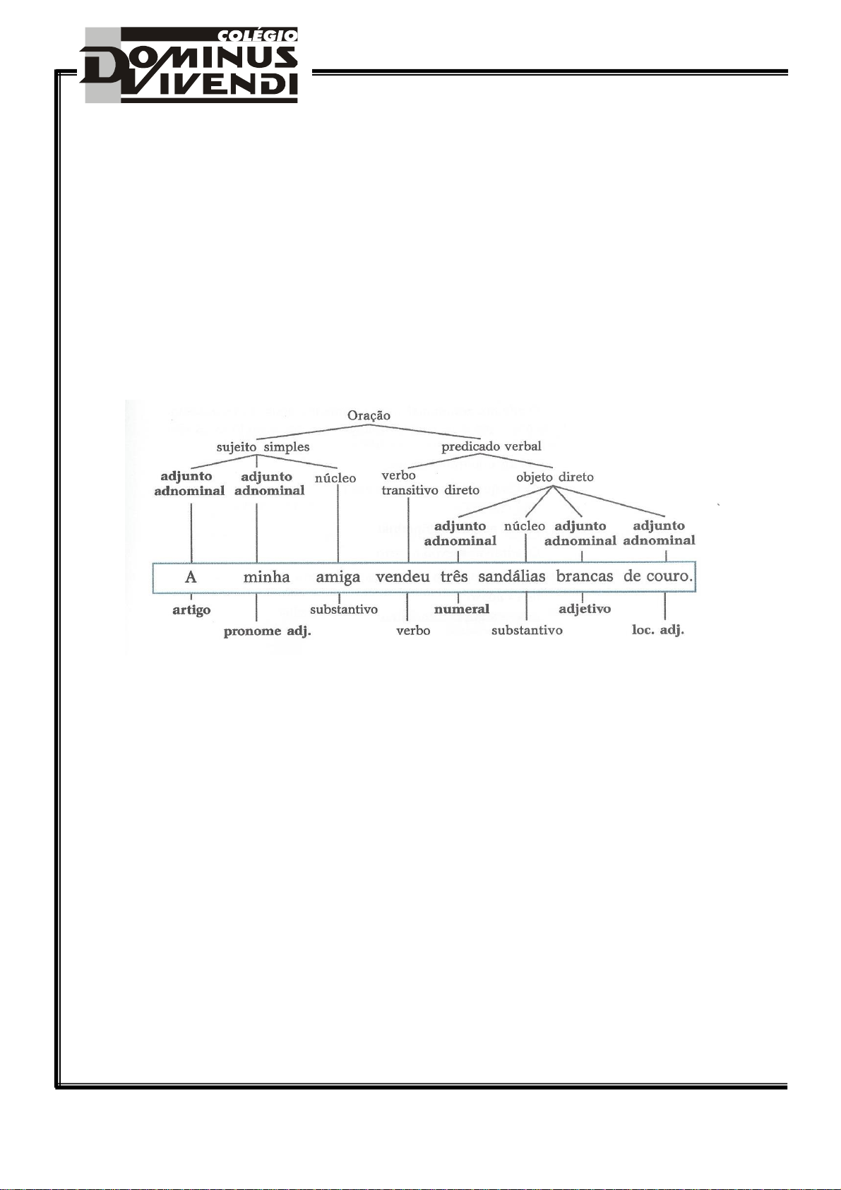 Educação Infantil - Ensino Fundamental - Ensino Médio Unidade I: Av. Mascote, 913 - Vila Mascote - S.P. - Fone/Fax: 5564 3466 - CEP: 04363-001 Dominus Junior: R. Palacete das Águias, 666 - Vl. Alexandria - S.P. - Fone: 5031 7108 - CEP: 04365-023 TERMOS ACESSÓRIOS DA ORAÇÃO ADJUNTO ADNOMINAL E ADJUNTO ADVERBIAL TERMOS ACESSÓRIOS DA ORAÇÃO Existem termos que, apesar de dispensáveis na estrutura básica da oração, são importantes para a compreensão do enunciado porque acrescentam informações novas: especificam um nome ou indicam uma circunstância do verbo. ADJUNTO ADNOMINAL É o termo que acompanha o nome (substantivo) procurando caracterizá-lo, determiná-lo ou individualizá-lo. O adjunto adnominal é representado na oração pelas seguintes classes gramaticais: artigo: o, a, um, uma... numeral: dois, três, quatro, primeiro, segundo, terceiro... adjetivo: estranha, brancas, pequeno... pronome adjetivo: meu, teu, seu, esta, essa, aquela, algum, nenhum... (pronome adjetivo é a palavra variável que, como o artigo e o numeral, acompanha o substantivo) locução adjetiva: de couro, de pano, da 6ª série, com febre... ADJUNTO ADVERBIAL É o termo que se refere ao verbo, ao adjetivo ou a outro advérbio, indicando-lhe uma circunstância. O adjunto adverbial pode ser constituído de: advérbios, locuções ou expressões adverbiais. Educação Infantil - Ensino Fundamental - Ensino Médio Unidade I: Av. Mascote, 913 - Vila Mascote - S.P. - Fone/Fax: 5564 3466 - CEP: 04363-001 Dominus Junior: R. Palacete das Águias, 666 - Vl. Alexandria - S.P. - Fone: 5031 7108 - CEP: 04365-023 Classificação do adjunto adverbial Os adjuntos adverbiais classificam-se de acordo com a circunstância que expressam. São muitos, portanto, os tipos de adjunto adverbial: Advérbios Afirmação sim, deveras, certamente, efetivamente, incontestavelmente, realmente Dúvida Talvez, decerto, porventura, acaso, quiçá, provavelmente, possivelmente Intensidade Muito, pouco, bastante, mais, menos, demais, tanto, tão, quão, meio, todo, excessivamente, demasiadamente Lugar (onde?) Aqui, ali, aí, cá, lá, atrás, perto, longe, abaixo, acima, adiante, dentro, fora, além Modo (como?) Bem, mal, assim, apenas, depressa, devagar e a maior parte dos que terminam em –mente: calmamente, tristemente, educadamente, propositadamente, rapidamente Negação Não, absolutamente, nunca, jamais, tampouco Tempo (quando?) Hoje, amanhã, ontem, breve, logo, antes, depois, agora, já, sempre, nunca, jamais, cedo, tarde, outrora, diariamente, anualmente, antigamente, novamente Educação Infantil - Ensino Fundamental - Ensino Médio Unidade I: Av. Mascote, 913 - Vila Mascote - S.P. - Fone/Fax: 5564 3466 - CEP: 04363-001 Dominus Junior: R. Palacete das Águias, 666 - Vl. Alexandria - S.P. - Fone: 5031 7108 - CEP: 04365-023 Locução adverbial Afirmação com certeza, sem dúvida, de fato Dúvida por certo, quem sabe Intensidade por completo, de muito, de pouco, de todo, em demasia, em excesso Lugar (onde?) à distância de, de longe, em cima, em volta, à direita, à esquerda, ao lado, para dentro Modo (como?) a pé, às cegas, às claras, à vontade, à toa, às pressas, ao léu, passo a passo, às escondidas, aos poucos, desse jeito, frente a frente, lado a lado, de cor, em vão Negação de forma alguma, de jeito nenhum, de modo algum, Tempo (quando?) de repente, à noite, à tarde, de manhã, de vez em quando, hoje em dia, às vezes, de quando em quando, a qualquer momento, de tempos em tempos, em breve