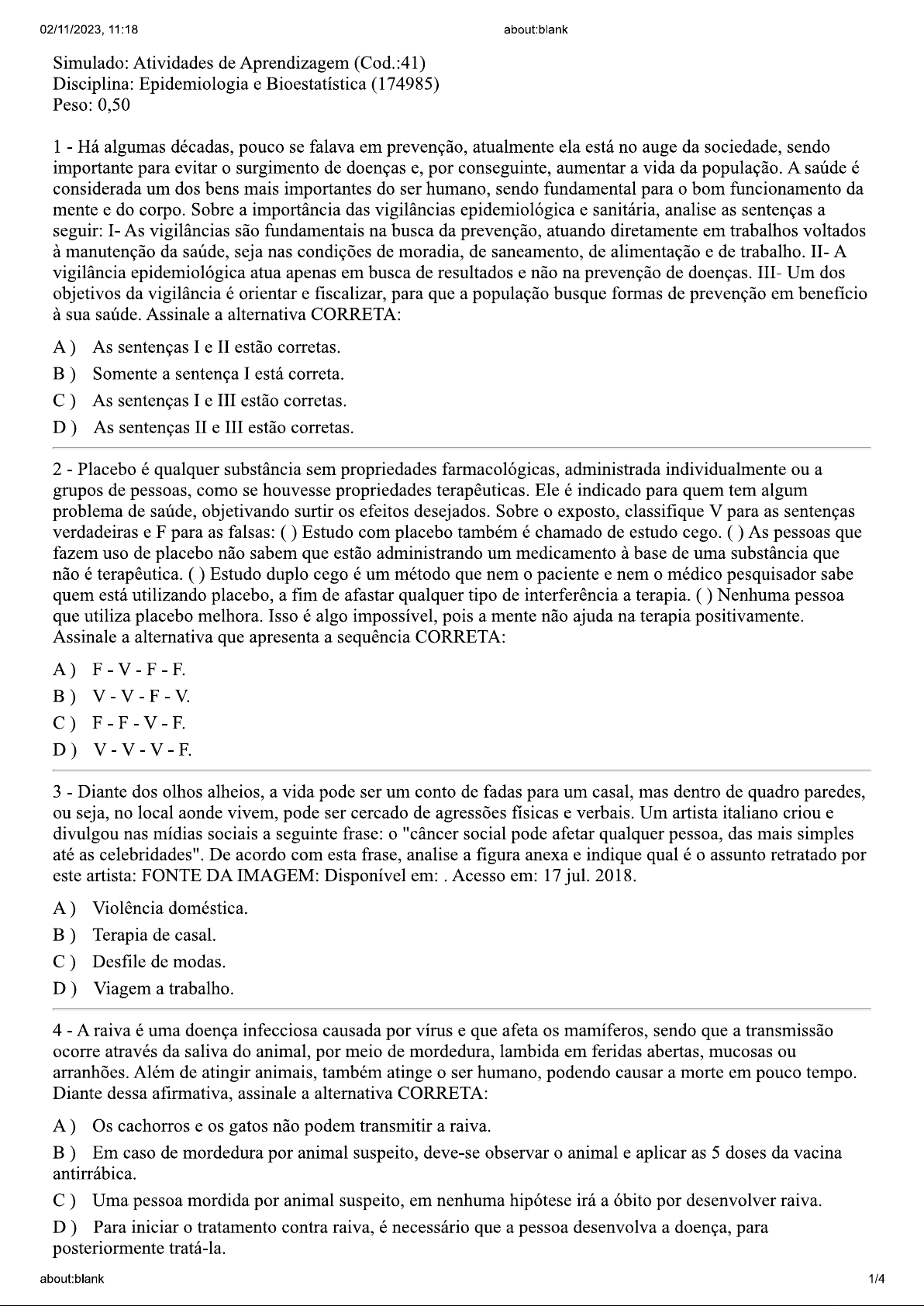 02/11/2023, 11:18 about:blank Simulado: Atividades de Aprendizagem (Cod.:41) Disciplina: Epidemiologia e Bioestatística (174985) Peso: 0,50 1 Há algumas décadas, pouco se falava em prevenção, atualmente ela está no auge da sociedade, sendo importante para evitar o surgimento de doenças e, por conseguinte, aumentar a vida da população. A saúde é considerada um dos bens mais importantes do ser humano, sendo fundamental para o bom funcionamento da mente e do corpo. Sobre a importância das vigilâncias epidemiológica e sanitária, analise as sentenças a seguir: I- As vigilâncias são fundamentais na busca da prevenção, atuando diretamente em trabalhos voltados à manutenção da saúde, seja nas condições de moradia, de saneamento, de alimentação e de trabalho. II- A vigilância epidemiológica atua apenas em busca de resultados e não na prevenção de doenças. III- Um dos objetivos da vigilância é orientar e fiscalizar, para que a população busque formas de prevenção em benefício à sua saúde. Assinale a alternativa CORRETA: A) As sentenças I e II estão corretas. B) Somente a sentença I está correta. C) As sentenças I e III estão corretas. D) As sentenças II e III estão corretas. 2 Placebo é qualquer substância sem propriedades farmacológicas, administrada individualmente ou a grupos de pessoas, como se houvesse propriedades terapêuticas. Ele é indicado para quem tem algum problema de saúde, objetivando surtir os efeitos desejados. Sobre o exposto, classifique V para as sentenças verdadeiras e F para as falsas: () Estudo com placebo também é chamado de estudo cego. () As pessoas que fazem uso de placebo não sabem que estão administrando um medicamento à base de uma substância que não é terapêutica. () Estudo duplo cego é um método que nem o paciente e nem o médico pesquisador sabe quem está utilizando placebo, a fim de afastar qualquer tipo de interferência a terapia. () Nenhuma pessoa que utiliza placebo melhora. Isso é algo impossível, pois a mente não ajuda na terapia positivamente. Assinale a alternativa que apresenta a sequência CORRETA: A) F-V-F-F. B) V V F V. D) 3 Diante dos olhos alheios, a vida pode ser um conto de fadas para um casal, mas dentro de quadro paredes, ou seja, no local aonde vivem, pode ser cercado de agressões físicas e verbais. Um artista italiano criou e divulgou nas mídias sociais a seguinte frase: o "câncer social pode afetar qualquer pessoa, das mais simples até as celebridades". De acordo com esta frase, analise a figura anexa e indique qual é o assunto retratado por este artista: FONTE DA IMAGEM: Disponível em: Acesso em: 17 jul. 2018. A) Violência doméstica. B) Terapia de casal. C) Desfile de modas. D) Viagem a trabalho. 4 A raiva é uma doença infecciosa causada por vírus e que afeta os mamíferos, sendo que a transmissão ocorre através da saliva do animal, por meio de mordedura, lambida em feridas abertas, mucosas ou arranhões. Além de atingir animais, também atinge o ser humano, podendo causar a morte em pouco tempo. Diante dessa afirmativa, assinale a alternativa CORRETA: A) Os cachorros e os gatos não podem transmitir a raiva. B) Em caso de mordedura por animal suspeito, deve-se observar o animal e aplicar as 5 doses da vacina antirrábica. C) Uma pessoa mordida por animal suspeito, em nenhuma hipótese irá a óbito por desenvolver raiva. D) Para iniciar o tratamento contra raiva, é necessário que a pessoa desenvolva a doença, para posteriormente tratá-la. about:blank 1/402/11/2023, 11:18 about:blank 5 Uma das subdivisões dos estudos epidemiológicos são os estudos transversais, que se caracterizam pela observação direta de determinada quantidade planejada de indivíduos, em uma única oportunidade. Para iniciar um estudo transversal, o investigador deve, primeiramente, definir a questão a responder, depois, definir a população, o método de escolha da amostra e, por último, definir os fenômenos a estudar. Sobre o exposto, classifique V para as sentenças verdadeiras e F para as falsas: () Estudos transversais são também conhecidos por estudos seccionais. () Medem a exposição de uma pessoa, em um espaço de tempo, a um efeito. () São pesquisas complexas que requerem aparelhos sofisticados e de alta tecnologia. () São importantes para o estudo de patologias de evolução lenta. Assinale a alternativa que apresenta a sequência CORRETA: 6 São doenças que já foram controladas no passado, mas voltaram a incidir sobre a população, como é o caso da cólera e da dengue. De que doenças estamos falando? A) Reemergentes. B) Integradas. C) Emergentes. D) Descendentes. 7 O HIV/AIDS é também conhecido como doença emergente, uma vez a pessoa sendo soropositiva para esta doença, necessitará dos serviços de saúde para receber cuidados contínuos. Sobre os cuidados que podem ser inclusos nos hábitos de vida de pacientes portadores de HIV, classifique V para as sentenças verdadeiras e F para as falsas: () Fazer uso de medicamentos relacionados ao HIV. () Proibição de manter vida social. () Fazer acompanhamento da carga viral. () Participar de grupos de apoio. Agora, assinale a alternativa que apresenta a sequência CORRETA: A) B) V-F-V-F. 8 Para que se possa realizar o cálculo da frequência com que as doenças ou problemas de saúde acometem a população, são utilizadas algumas medidas de frequência como a incidência e prevalência. Assinale a alternativa CORRETA que apresenta uma afirmativa sobre a Incidência: about:blank 2/402/11/2023, 11:18 about:blank A) É a frequência de novos casos de uma determinada doença ou problema de saúde num determinado período de tempo, oriundo de uma população sob risco de adoecer no início da observação. B) É uma medida da gravidade da doença. Expressa o poder que uma doença ou agravo à saúde tem de provocar a morte nas pessoas acometidas. C) É uma medida estática que representa a aferição do núm