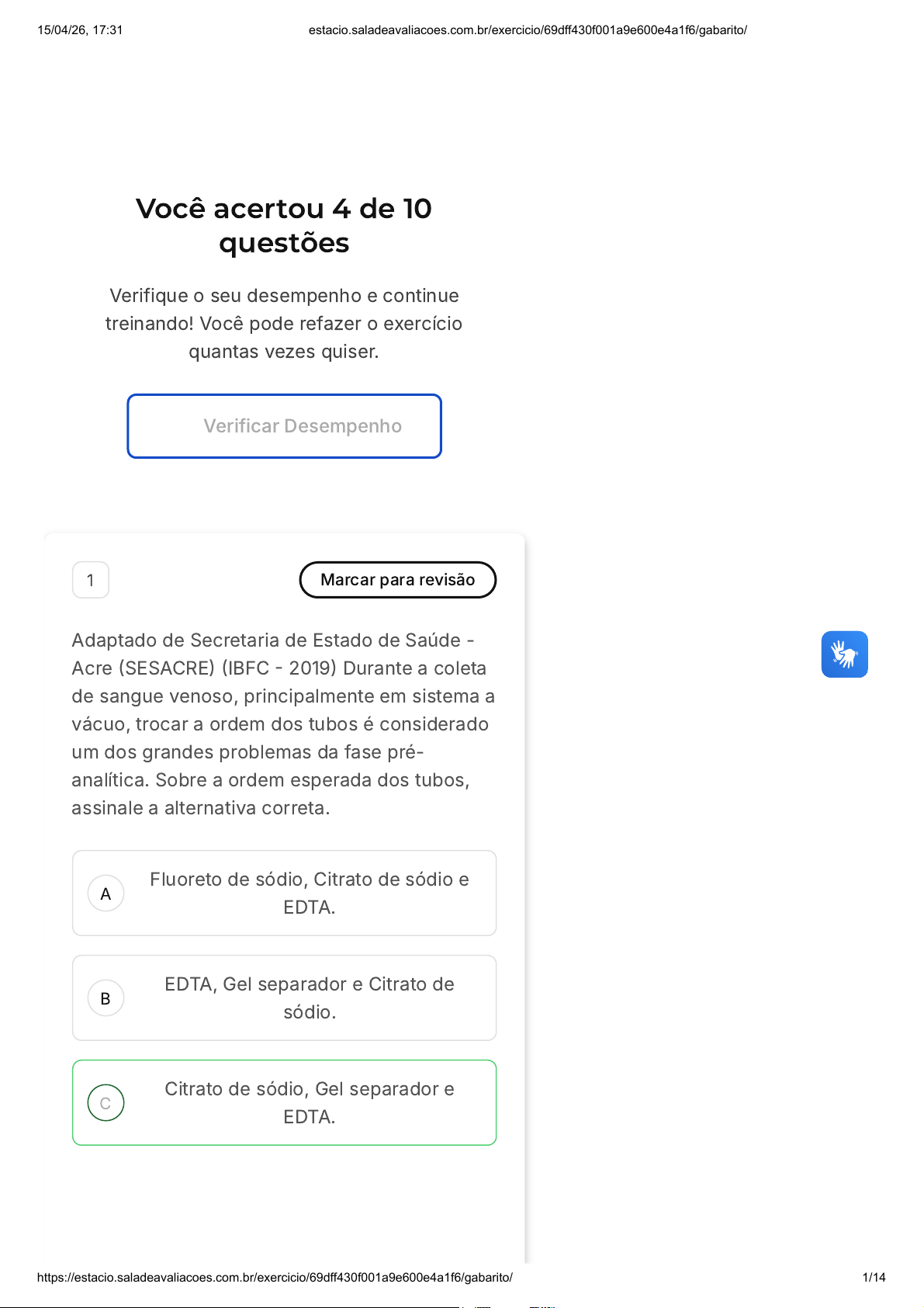 Você acertou 4 de 10 questões Verifique o seu desempenho e continue treinando! Você pode refazer o exercício quantas vezes quiser. Verificar Desempenho A B C 1 Marcar para revisão Adaptado de Secretaria de Estado de Saúde - Acre (SESACRE) (IBFC - 2019) Durante a coleta de sangue venoso, principalmente em sistema a vácuo, trocar a ordem dos tubos é considerado um dos grandes problemas da fase pré- analítica. Sobre a ordem esperada dos tubos, assinale a alternativa correta. Fluoreto de sódio, Citrato de sódio e EDTA. EDTA, Gel separador e Citrato de sódio. Citrato de sódio, Gel separador e EDTA. 15/04/26, 17:31 estacio.saladeavaliacoes.com.br/exercicio/69dff430f001a9e600e4a1f6/gabarito/ https://estacio.saladeavaliacoes.com.br/exercicio/69dff430f001a9e600e4a1f6/gabarito/ 1/14 D E Gel separador, Fluoreto de sódio e Citrato de sódio. EDTA, Fluoreto de sódio e gel separador. Resposta correta Parabéns, você selecionou a alternativa correta. Confira o gabarito comentado! Gabarito Comentado A alternativa correta é a letra C, que indica a sequência correta de tubos na coleta de sangue venoso em sistema a vácuo: Citrato de sódio, Gel separador e EDTA. A ordem dos tubos é crucial para evitar contaminação cruzada entre os aditivos presentes em cada tubo, o que poderia comprometer a qualidade da amostra e a precisão dos resultados dos testes. Portanto, é essencial seguir a ordem correta para garantir a confiabilidade dos resultados analíticos. 2 Marcar para revisão "A Lei de Lambert-Beer (também designada por Lei de Lambert-Beer-Bouguer) estabelece uma relação entre a absorvância (também chamada absorbância ou absorvência) de uma solução e a sua concentração, quando atravessada por uma radiação luminosa monocromática colimada (raios luminosos paralelos)". Fonte: Lima, L.S. A lei de Lambert-Beer. Rev. Ciência Elem., v.1. part. 1. p. 47. 2013. Questão 3 de 10 Corretas (4) Incorretas (6) Em branco (0) 1 2 3 4 5 6 7 8 9 10 Lista de exercícios Introdução … Sair 15/04/26, 17:31 estacio.saladeavaliacoes.com.br/exercicio/69dff430f001a9e600e4a1f6/gabarito/ https://estacio.saladeavaliacoes.com.br/exercicio/69dff430f001a9e600e4a1f6/gabarito/ 2/14 A B C D E Sobre a Lei de Lambert-Beer, assinale a opção correta. Ao aumentar a espessura da cubeta, a intensidade de luz detectada aumenta exponencialmente. Ao aumentar a concentração da amostra, a intensidade de luz detectada aumenta proporcionalmente. O tamanho da cubeta não influencia diretamente na intensidade de luz detectada. Ao aumentar a espessura da cubeta, a intensidade de luz detectada diminui exponencialmente. Quanto maior a concentração da amostra, maior a intensidade de luz detectada. Resposta correta Parabéns, você selecionou a alternativa correta. Confira o gabarito comentado! Gabarito Comentado A quantidade de intensidade de luz detectada diminui exponencialmente em algumas situações, como: Ao aumentar a espessura da cubeta com a solução, constituindo o que conhecemos como Lei de Lambert. 15/04/26, 17:31 estacio.saladeavaliacoes.com.br/exercicio/69dff430f001a9e600e4a1f6/gabarito/ https://estacio.saladeavaliacoes.com.br/exercicio/69dff430f001a9e600e4a1f6/gabarito/ 3/14 A B C D E Ao aumentar a concentração ou intensidade de cor da solução, constituindo o que conhecemos como Lei de Beer. 3 Marcar para revisão Prefeitura Municipal de Ji-Paraná (IBADE - 2018) O Controle de Qualidade Interno (CQI) e Controle de Qualidade Externo (CQE) são instrumentos de validação importantes para o bom andamento do laboratório clínico. Portanto, pode-se afirmar corretamente que: O CQI tem frequência de realização diária e necessita de regras para avaliação dos resultados. O CQI tem frequência de realização mensal e não necessita de regras para avaliação dos resultados. O CQE tem frequência de realização mensal e não necessita de ações corretivas das inadequações. O CQE tem frequência de realização mensal e não é obrigatório para todos os laboratórios clínicos. Nenhum dos processos CQI e CQE necessita de ações corretivas das inadequações. Resposta correta 15/04/26, 17:31 estacio.saladeavaliacoes.com.br/exercicio/69dff430f001a9e600e4a1f6/gabarito/ https://estacio.saladeavaliacoes.com.br/exercicio/69dff430f001a9e600e4a1f6/gabarito/ 4/14 Parabéns, você selecionou a alternativa correta. Confira o gabarito comentado! Gabarito Comentado A alternativa correta é a letra A, que afirma que o Controle de Qualidade Interno (CQI) tem frequência de realização diária e necessita de regras para avaliação dos resultados. Isso ocorre porque o CQI é um processo contínuo que visa garantir a precisão e a confiabilidade dos resultados do laboratório. Para isso, é necessário que haja regras claras para a avaliação dos resultados, permitindo a identificação e a correção de possíveis erros ou desvios. Portanto, a frequência diária e a necessidade de regras para avaliação dos resultados são características fundamentais do CQI. 4 Marcar para revisão Adaptado de Prefeitura Municipal de Seringueiras (IBADE-2019) Os programas de Controle Interno da Qualidade (CIQ) e Controle Externo da Qualidade (CEQ) no laboratório devem ser documentados, contemplando: lista de analitos; forma de controle e frequência de utilização; limites e critérios de aceitabilidade para os resultados dos controles; avaliação e registro dos resultados dos controles. A seguir estão listados uma série de recomendações sobre o controle de qualidade laboratorial. Assinale a alternativa que não apresenta uma recomendação aos laboratórios. 15/04/26, 17:31 estacio.saladeavaliacoes.com.br/exercicio/69dff430f001a9e600e4a1f6/gabarito/ https://estacio.saladeavaliacoes.com.br/exercicio/69dff430f001a9e600e4a1f6/gabarito/ 5/14 A B C D E O laboratório clínico deve participar de Ensaios de Proficiência para todos os exames realizados na sua rotina. As amostras-controle devem ser analisadas da mesma