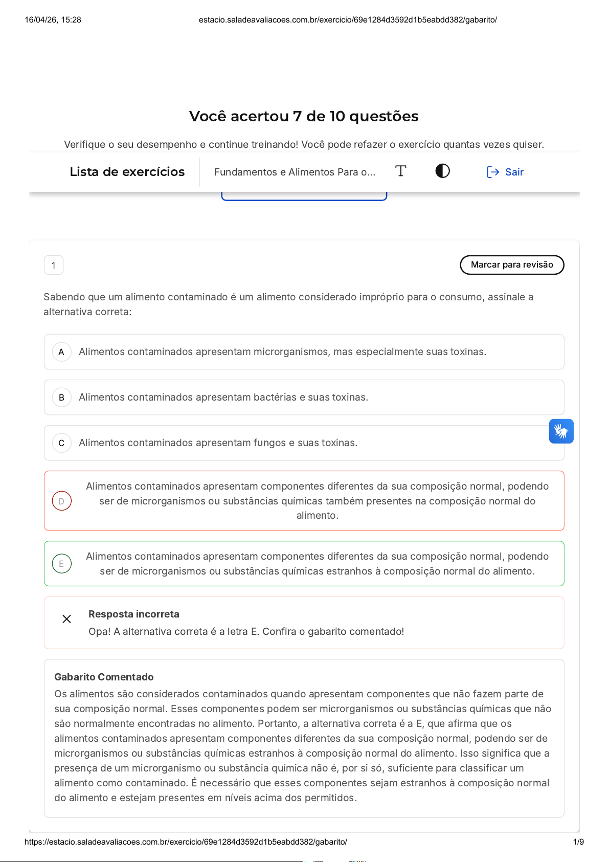 Você acertou 7 de 10 questões Verifique o seu desempenho e continue treinando! Você pode refazer o exercício quantas vezes quiser. Verificar Desempenho A B C D E 1 Marcar para revisão Sabendo que um alimento contaminado é um alimento considerado impróprio para o consumo, assinale a alternativa correta: Alimentos contaminados apresentam microrganismos, mas especialmente suas toxinas. Alimentos contaminados apresentam bactérias e suas toxinas. Alimentos contaminados apresentam fungos e suas toxinas. Alimentos contaminados apresentam componentes diferentes da sua composição normal, podendo ser de microrganismos ou substâncias químicas também presentes na composição normal do alimento. Alimentos contaminados apresentam componentes diferentes da sua composição normal, podendo ser de microrganismos ou substâncias químicas estranhos à composição normal do alimento. Resposta incorreta Opa! A alternativa correta é a letra E. Confira o gabarito comentado! Gabarito Comentado Os alimentos são considerados contaminados quando apresentam componentes que não fazem parte de sua composição normal. Esses componentes podem ser microrganismos ou substâncias químicas que não são normalmente encontradas no alimento. Portanto, a alternativa correta é a E, que afirma que os alimentos contaminados apresentam componentes diferentes da sua composição normal, podendo ser de microrganismos ou substâncias químicas estranhos à composição normal do alimento. Isso significa que a presença de um microrganismo ou substância química não é, por si só, suficiente para classificar um alimento como contaminado. É necessário que esses componentes sejam estranhos à composição normal do alimento e estejam presentes em níveis acima dos permitidos. Lista de exercícios Fundamentos e Alimentos Para o… Sair 16/04/26, 15:28 estacio.saladeavaliacoes.com.br/exercicio/69e1284d3592d1b5eabdd382/gabarito/ https://estacio.saladeavaliacoes.com.br/exercicio/69e1284d3592d1b5eabdd382/gabarito/ 1/9 A B C D E 2 Marcar para revisão Considerando os alimentos impróprios para o consumo, é possível identificar exemplos de um agente causador da alteração de origem biológica em: Contaminação com microrganismos patogênicos ou suas toxinas, bem como na presença de pelos de animais. Contaminação com microrganismos patogênicos ou suas toxinas, bem como na presença de qualquer parte de animais. Contaminação com microrganismos patogênicos e suas toxinas, bem como na presença de qualquer fungo. Presença de microrganismos e toxinas microbianas. Presença de microrganismos patogênicos e toxinas microbianas. Resposta incorreta Opa! A alternativa correta é a letra E. Confira o gabarito comentado! Gabarito Comentado Existem vários agentes que podem causar alterações de origem biológica nos alimentos, tornando-os impróprios para o consumo. Entre esses agentes, estão os microrganismos patogênicos e suas toxinas microbianas, que são potencialmente perigosos para a saúde do consumidor. No entanto, é importante ressaltar que nem todos os microrganismos são prejudiciais. Além disso, a presença de partes de animais em alimentos não é necessariamente prejudicial à saúde, pois carnes de aves, peixes e bovinos são componentes comuns em muitos alimentos. Portanto, a alternativa correta é a "E", que menciona a presença de microrganismos patogênicos e toxinas microbianas como agentes causadores de alterações de origem biológica em alimentos. 3 Marcar para revisão (UFMT 2013 - Banca IADES) Os alimentos são classificados e divididos em alimentos simples, compostos, aptos para o consumo, não aptos para o consumo, contaminados, alterados, falsificados e adulterados. A respeito desse tema, é correto afirmar que alimentos simples são: 16/04/26, 15:28 estacio.saladeavaliacoes.com.br/exercicio/69e1284d3592d1b5eabdd382/gabarito/ https://estacio.saladeavaliacoes.com.br/exercicio/69e1284d3592d1b5eabdd382/gabarito/ 2/9 A B C D E A B C Os alimentos diretos, ou seja, são substâncias metabolizadas depois de sua absorção. Aqueles que estão de acordo com as exigências das leis vigentes. Aquelas substâncias que, por ação de enzimas dos sucos digestivos, são transformadas em metabólitos. Substâncias de composição química variada e complexa, de origem animal ou vegetal, ou formadas por uma mistura de alimentos simples. Todas as substâncias que o homem ou o animal conseguem ingerir. Resposta correta Parabéns, você selecionou a alternativa correta. Confira o gabarito comentado! Gabarito Comentado Os alimentos simples, conforme definido pela bromatologia, são aqueles que são facilmente absorvidos pelo organismo. Isso ocorre porque esses alimentos são transformados em substâncias mais simples através do metabolismo, especificamente pela ação das enzimas presentes nos sucos digestivos. As demais alternativas não estão corretas. Os alimentos diretos ou metabólitos são absorvidos diretamente após o metabolismo, como é o caso dos aminoácidos. A conformidade com as leis vigentes não é um critério para classificar um alimento como simples. Alimentos de composição química variada são classificados como complexos. Além disso, nem todas as substâncias que podem ser ingeridas por humanos ou animais são consideradas alimentos simples. 4 Marcar para revisão Os alimentos impróprios para o consumo podem ser classificados de acordo com a característica que os define como impróprios. Nesse sentido, qual alternativa define as características dos alimentos falsificados? Possuem exatamente as mesmas propriedades dos alimentos genuínos, mas são produzidos por fabricante não autorizado. Possuem as mesmas propriedades gerais dos alimentos genuínos, mas são produzidos por fabricantes autorizados. Possuem as mesmas propriedades gerais dos alimentos genuínos, mas são produzidos por fabricante não autorizado. 16/04/26, 15:28 estacio.saladeavaliacoes.com.br/exercicio/69e12