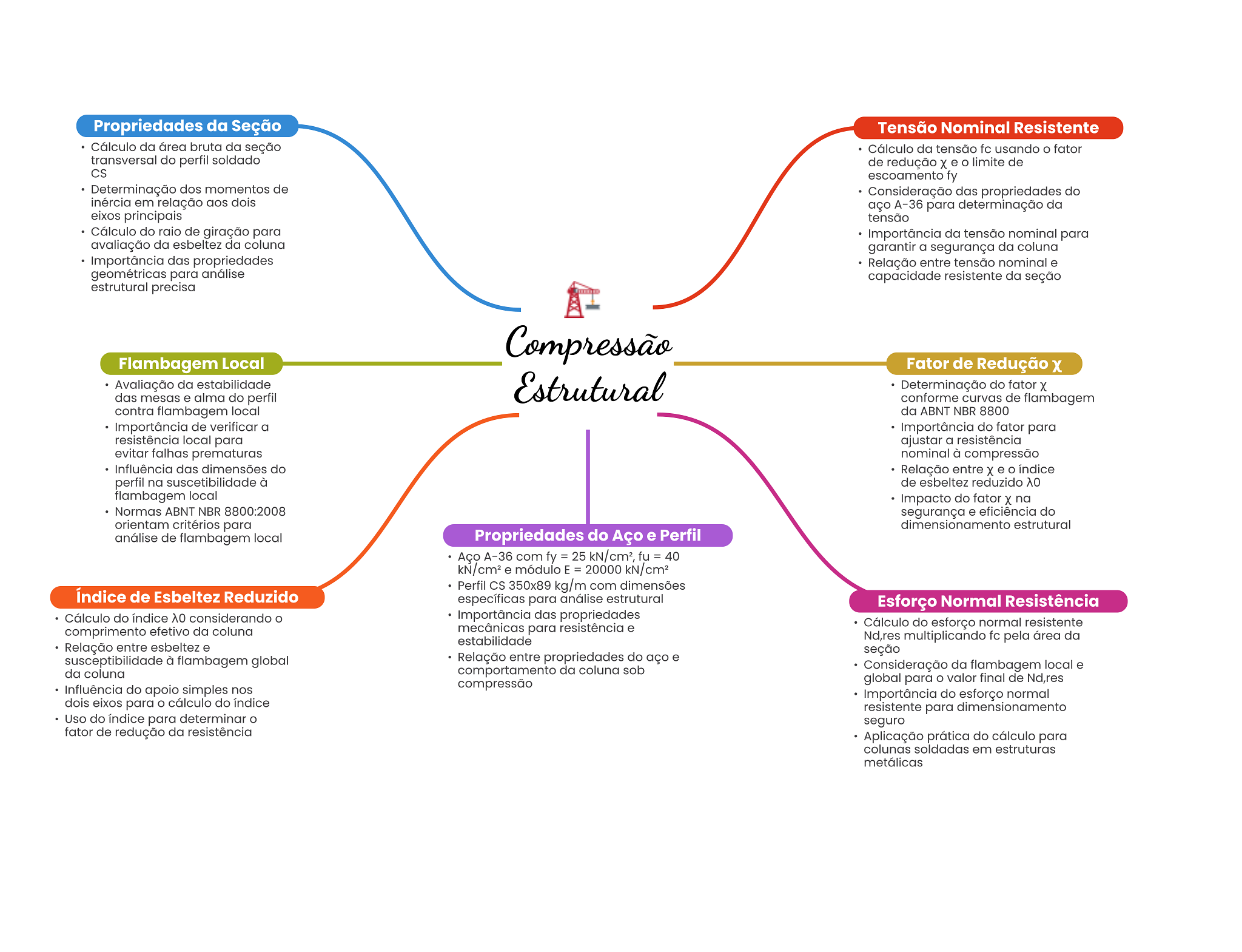 Propriedades da Seção Tensão Nominal Resistente Cálculo da área bruta da seção Cálculo da tensão fc usando fator transversal do perfil soldado de redução X e limite de CS escoamento fy Determinação dos momentos de Consideração das propriedades do inércia em relação aos dois aço A-36 para determinação da eixos principais tensão Cálculo do raio de giração para Importância da tensão nominal para avaliação da esbeltez da coluna garantir a segurança da coluna Importância das propriedades Relação entre tensão nominal e geométricas para análise capacidade resistente da seção estrutural precisa Compressão Flambagem Local Fator de Redução Avaliação da estabilidade Estrutural Determinação do fator X das mesas e alma do perfil conforme curvas de flambagem contra flambagem local da ABNT NBR 8800 Importância de verificar a Importância do fator para resistência local para ajustar a resistência evitar falhas prematuras nominal à compressão Influência das dimensões do Relação entre X e índice perfil na suscetibilidade à de esbeltez reduzido flambagem local Impacto do fator X na Normas ABNT NBR 8800:2008 segurança e eficiência do orientam critérios para dimensionamento estrutural análise de flambagem local Propriedades do Aço e Perfil Aço A-36 com fy = 25 fu = 40 e módulo E = 20000 Perfil CS 350x89 kg/m com dimensões Indice de Esbeltez Reduzido específicas para análise estrutural Esforço Normal Resistência Cálculo do índice considerando Importância das propriedades comprimento efetivo da coluna mecânicas para resistência e Cálculo do esforço normal resistente estabilidade Nd,res multiplicando fc pela área da Relação entre esbeltez e seção susceptibilidade à flambagem global Relação entre propriedades do aço e comportamento da coluna sob Consideração da flambagem local e da coluna Influência do apoio simples nos compressão global para O valor final de Nd,res Importância do esforço normal dois eixos para cálculo do índice resistente para dimensionamento Uso do índice para determinar seguro fator de redução da resistência Aplicação prática do cálculo para colunas soldadas em estruturas metálicas