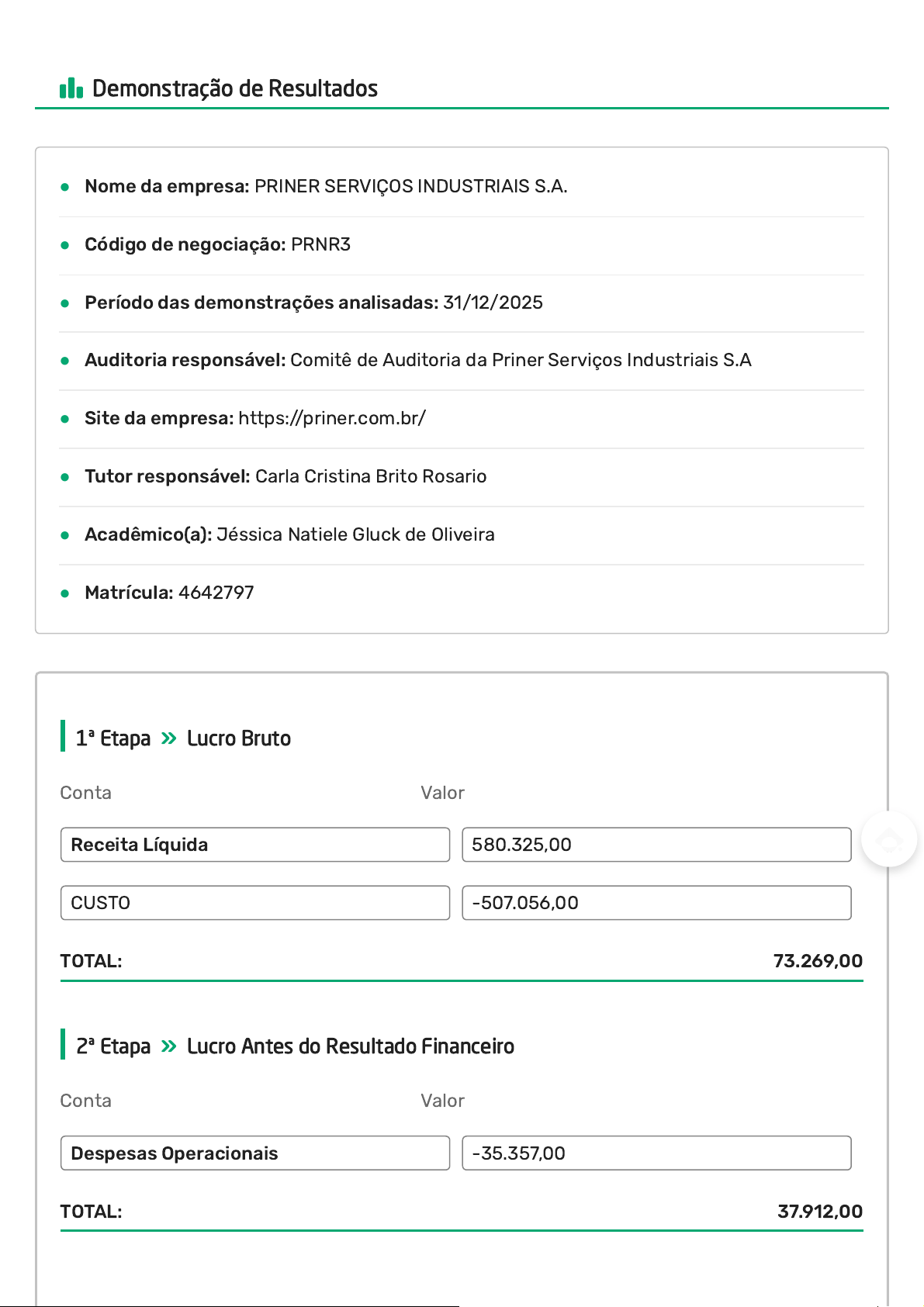 Demonstração de Resultados Nome da empresa: PRINER SERVIÇOS INDUSTRIAIS S.A.● Código de negociação: PRNR3● Período das demonstrações analisadas: 31/12/2025● Auditoria responsável: Comitê de Auditoria da Priner Serviços Industriais S.A● Site da empresa: https://priner.com.br/● Tutor responsável: Carla Cristina Brito Rosario● Acadêmico(a): Jéssica Natiele Gluck de Oliveira● Matrícula: 4642797● 1ª Etapa » Lucro Bruto Conta Valor Receita Líquida 580.325,00 CUSTO -507.056,00 TOTAL: 73.269,00 2ª Etapa » Lucro Antes do Resultado Financeiro Conta Valor Despesas Operacionais -35.357,00 TOTAL: 37.912,00 3ª Etapa » Lucro Antes do IR e CS Conta Valor Receitas Financeiras -83.623,00 TOTAL: -45.711,00 4ª Etapa » Lucro Líquido Conta Valor Despesas com IR e CS 33.900,00 TOTAL: -11.811,00
