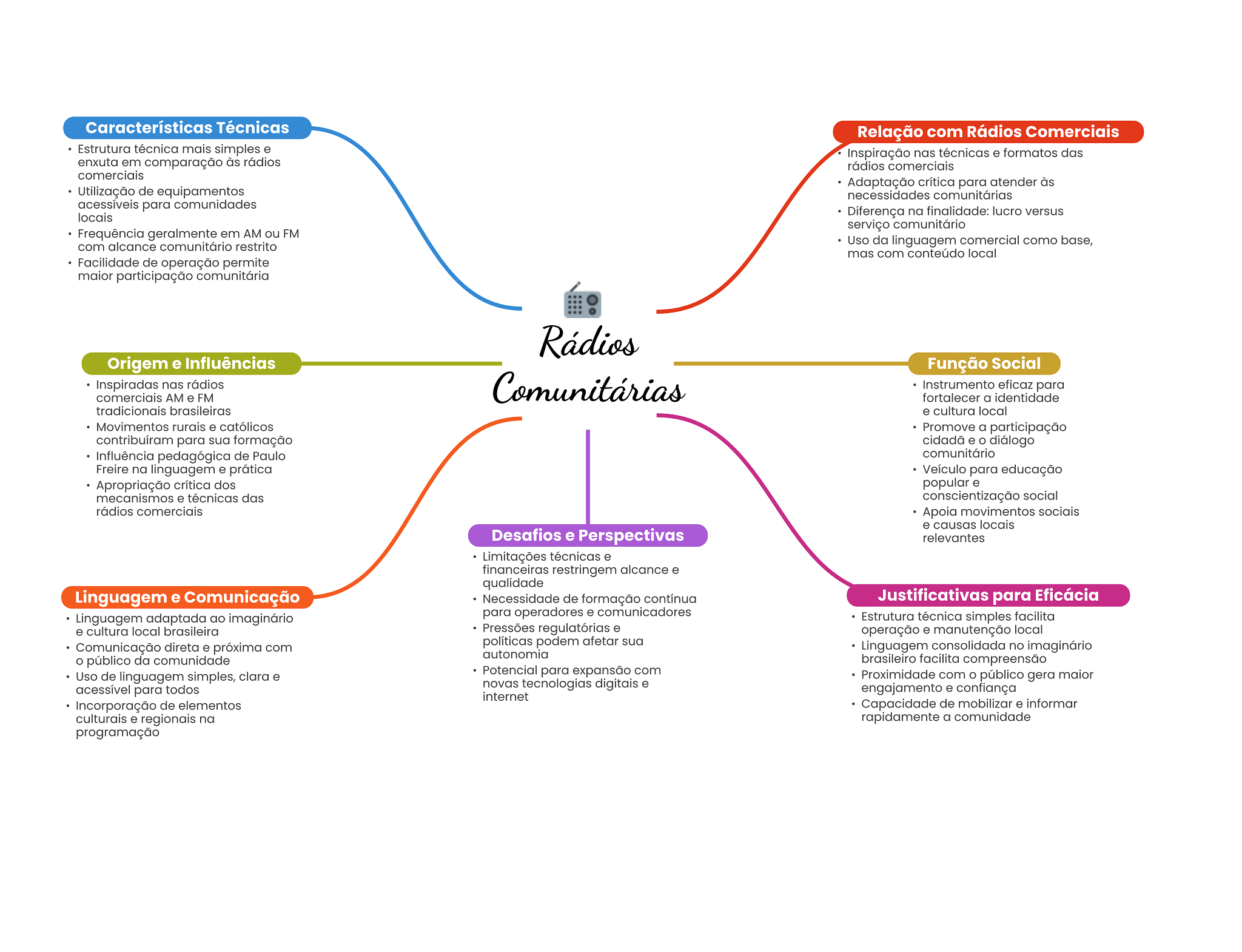 Características Técnicas Relação com Rádios Comerciais Estrutura técnica mais simples e Inspiração nas técnicas e formatos das enxuta em comparação às rádios rádios comerciais comerciais Adaptação crítica para atender às Utilização de equipamentos necessidades comunitárias acessíveis para comunidades locais Diferença na finalidade: lucro versus serviço comunitário Frequência geralmente em AM ou FM com alcance comunitário restrito Uso da linguagem comercial como base, mas com conteúdo local Facilidade de operação permite maior participação comunitária Rádios Origem e Influências Função Social Inspiradas nas rádios comerciais AM e FM Comunitárias Instrumento eficaz para fortalecer a identidade tradicionais brasileiras e cultura local Movimentos rurais e católicos Promove a participação contribuíram para sua formação cidadã e diálogo Influência pedagógica de Paulo comunitário Freire na linguagem e prática Veículo para educação Apropriação crítica dos popular e mecanismos e técnicas das conscientização social rádios comerciais Apoia movimentos sociais e causas locais Desafios e Perspectivas relevantes Limitações técnicas e financeiras restringem alcance e qualidade Linguagem e Comunicação Necessidade de formação contínua Justificativas para Eficácia Linguagem adaptada ao imaginário para operadores e comunicadores Estrutura técnica simples facilita e cultura local brasileira Pressões regulatórias e operação e manutenção local Comunicação direta e próxima com políticas podem afetar sua Linguagem consolidada no imaginário autonomia público da comunidade brasileiro facilita compreensão Uso de linguagem simples, clara e Potencial para expansão com Proximidade com público gera maior acessível para todos novas tecnologias digitais e engajamento e confiança internet Incorporação de elementos Capacidade de mobilizar e informar culturais e regionais na rapidamente a comunidade programação