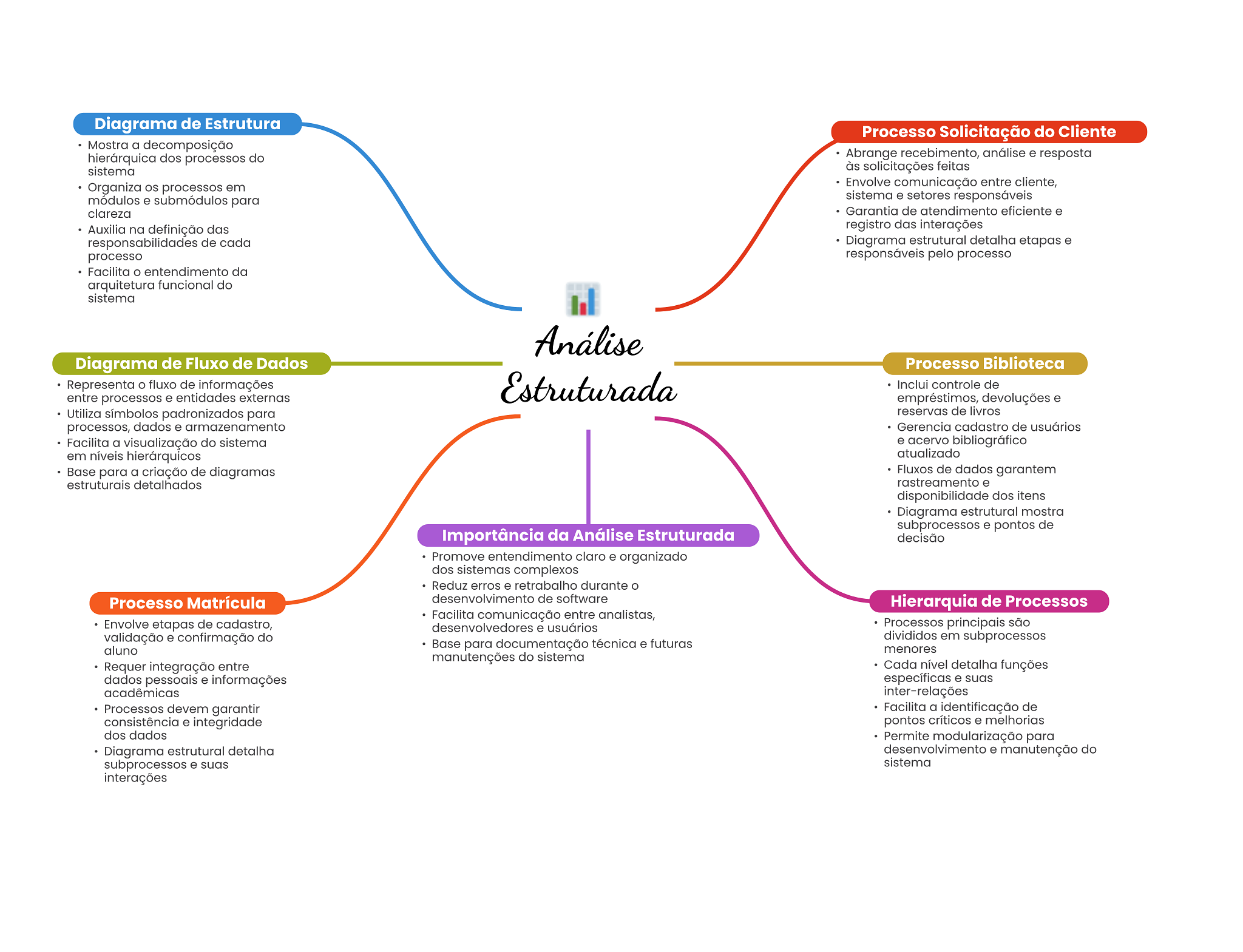 Diagrama de Estrutura Processo Solicitação do Cliente Mostra a decomposição hierárquica dos processos do Abrange recebimento, análise e resposta sistema às solicitações feitas Organiza processos em Envolve comunicação entre cliente, módulos e submódulos para sistema e setores responsáveis clareza Garantia de atendimento eficiente e Auxilia na definição das registro das interações responsabilidades de cada Diagrama estrutural detalha etapas e processo responsáveis pelo processo Facilita entendimento da arquitetura funcional do sistema Análise Diagrama de Fluxo de Dados Processo Biblioteca Representa fluxo de informações Estruturada Inclui controle de entre processos e entidades externas empréstimos, devoluções e Utiliza símbolos padronizados para reservas de livros processos, dados e armazenamento Gerencia cadastro de usuários Facilita a visualização do sistema e acervo bibliográfico em níveis hierárquicos atualizado Base para a criação de diagramas Fluxos de dados garantem estruturais detalhados rastreamento e disponibilidade dos itens Diagrama estrutural mostra subprocessos e pontos de Importância da Análise Estruturada decisão Promove entendimento claro e organizado dos sistemas complexos Reduz erros e retrabalho durante Processo Matrícula desenvolvimento de software Hierarquia de Processos Facilita comunicação entre analistas, Envolve etapas de cadastro, desenvolvedores e usuários Processos principais são validação e confirmação do divididos em subprocessos aluno Base para documentação técnica e futuras menores manutenções do sistema Requer integração entre Cada nível detalha funções dados pessoais e informações específicas e suas acadêmicas inter-relações Processos devem garantir Facilita a identificação de consistência e integridade pontos críticos e melhorias dos dados Permite modularização para Diagrama estrutural detalha desenvolvimento e manutenção do subprocessos e suas sistema interações