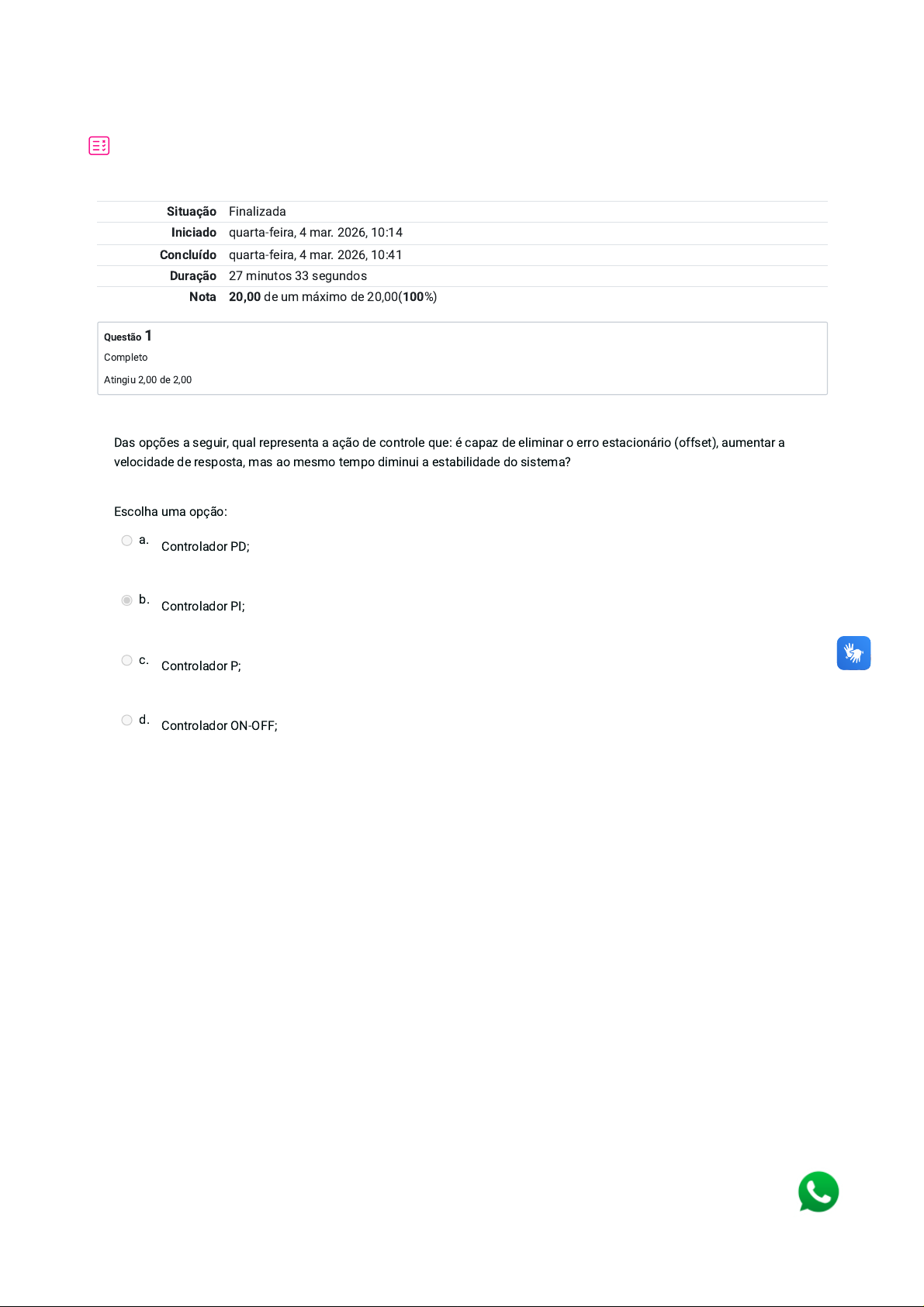 Situação Finalizada Iniciado quarta-feira, 4 mar. 2026, 10:14 Concluído quarta-feira, 4 mar. 2026, 10:41 Duração 27 minutos 33 segundos Nota 20,00 de um máximo de 20,00(100%) Questão 1 Completo Atingiu 2,00 de 2,00 Das opções a seguir, qual representa a ação de controle que: é capaz de eliminar o erro estacionário (offset), aumentar a velocidade de resposta, mas ao mesmo tempo diminui a estabilidade do sistema? Escolha uma opção: a. Controlador PD; b. Controlador PI; c. Controlador P; d. Controlador ON-OFF; Questão 2 Completo Atingiu 2,00 de 2,00 Analise o diagrama de processos apresentado a seguir: Considerando a relação a seguir: I. Controlador programável; II. Sinal pneumático; III. Conversor eletropneumático; IV. Sinal elétrico; V. Válvula de controle pneumática. Quais afirmações são verdadeiras: Escolha uma opção: a. Apenas I, II e IV; b. Todas as afirmações são verdadeiras; c. Apenas II, III, IV e V; d. Apenas III e V; Questão 3 Completo Atingiu 2,00 de 2,00 Qual dispositivo que utilizado junto com uma válvula possui a função de: “Comparar o sinal da saída do controlador com a posição da haste da válvula e proporcionar as devidas correções quando necessário. ” Escolha uma opção: a. Posicionador; b. Solenoide; c. Atuador; d. Booster; Questão 4 Completo Atingiu 2,00 de 2,00 O corpo de válvula visto na figura a seguir pode ser descrito como o de uma válvula: Escolha uma opção: a. Válvula guilhotina; b. Válvula borboleta; c. Válvula globo de sede simples; d. Válvula esfera; Questão 5 Completo Atingiu 2,00 de 2,00 Considere as afirmativas a seguir sobre as principais técnicas de controle de processos: I. O controle feedforward responde diretamente ao distúrbio. O objetivo é antecipar as variações da variável controlada e fazer as correções de forma antecipada. II. Os controladores ON-OFF só permitem duas posições extremas do elemento final. Este tipo de controle não permite que a variável controlada oscile em torno do set point. III. O controle por realimentação utiliza o desvio ou erro para efetuar a ação corretiva. Neste tipo de controlador não se faz necessário conhecer ou ler o distúrbio, pois o controle proporcionará uma ação corretiva automaticamente ao detectar um erro. IV. No controlador ON-OFF é comum a utilização de uma “zona morta”, cujo objetivo é diminuir a frequência de oscilação e o desgaste do elemento final. V. O controle feedforward requer menor conhecimento sobre o processo, necessitando conhecer apenas o distúrbio. Na prática, frequentemente, é utilizado em conjunto com o controle manual. Conclui-se que: Escolha uma opção: a. Apenas as afirmativas I, II, IV e V estão corretas; b. Apenas as afirmativas II, IV e V estão corretas; c. Apenas as afirmativas III e V estão corretas; d. Apenas as afirmativas I, III e IV estão corretas; Questão 6 Completo Atingiu 2,00 de 2,00 Questão 7 Completo Atingiu 2,00 de 2,00 Analise as afirmações a respeito TRANSMISSORES: ( ) Transmissores são dispositivos que permitem que os dados do processo estejam disponíveis em uma sala de controle centralizada, em um formato padronizado. ( ) Nos transmissores a dois fios, a alimentação é proporcionada pelo próprio sinal de 4 a 20 mAcc. Neste esquema, a tensão nominal de alimentação geralmente é de 110/115/127 V ou 220/240 V. ( ) O transmissor converte um sinal não-padrão proveniente do elemento primário em um sinal padrão. Os transmissores utilizam na saída apenas o padrão de 4 a 20 mAcc. ( ) A presença do zero vivo não permite a detecção de erro como a falta de alimentação ou fio partido. ( ) Os transmissores digitais podem se comunicar de forma bidirecional com outros dispositivos digitais com o mesmo protocolo, como: HART, Fieldbus e o Profibus. Analise as afirmativas, identificando com um “V’ quais são VERDADEIRAS e com um “F” quais são FALSAS, assinalado a seguir a alternativa correta, na sequência de cima para baixo: Escolha uma opção: a. V – F – F – F – V; b. F – F – V – F – V; c. F – V – F – V – F; d. V – F – F – V – V; Assinale a alternativa INCORRETA sobre os medidores de temperatura: Escolha uma opção: a. A medição de temperatura por termorresistência baseia seu funcionamento nos fenômenos termoelétricos conhecidos como: Seebeck e Peltier. b. A medição de temperatura por pirômetros de radiação é feita com base na emissão de radiação térmica de um corpo. c. Os termômetros bimetálicos baseiam seu funcionamento no fenômeno da dilatação linear de duas lâminas de metais de diferentes coeficientes de dilatação. d. Nos termômetros de vidro o líquido contido em um bulbo, ao se dilatar com a temperatura, sobe em um tubo capilar graduado. Questão 8 Completo Atingiu 2,00 de 2,00 Considere as afirmativas a seguir sobre a medição de temperatura: I. O termorresistor PT-100 é assim chamado por possuir elemento de platina e resistência padronizada de 0Ω a 100°C. II. Um problema específico da utilização de termopares para a medição de temperatura é a compensação da junta fria. III. Os pirômetros de radiação são instrumentos dedicados à medição de temperatura com contato direto junto ao corpo ou meio cuja temperatura está sendo medida. IV. Dispositivos semicondutores cuja resistência elétrica varia com a temperatura são denominados termistores e podem ter coeficientes de temperatura positivos e negativos. V. Os termopares são sensores de temperatura bimetálicos e seu princípio de funcionamento possui relação direta com a diferença de coeficiente de dilatação entre dois metais. Conclui-se que: Escolha uma opção: a. Apenas as afirmativas I e V estão corretas; b. Apenas as afirmativas II e IV estão corretas; c. Todas as afirmativas estão INCORRETAS; d. Apenas as afirmativas I, II e IV estão corretas; Questão 9 Completo Atingiu 2,00 de 2,00 Questão 10 Completo Atingiu 2