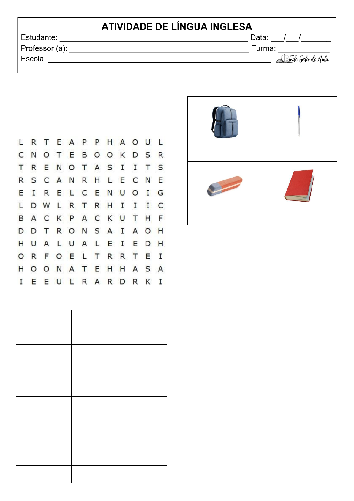 1. Encontre e circule no caça-palavras as palavras listadas abaixo. BACKPACK – BOARD – CHAIR – DESK – ERASER – NOTEBOOK – PENCIL – RULER 2. Faça a tradução dos seguintes itens. BOOK NOTEBOOK PENCIL PEN ERASER BACKPACK RULER BOARD DESK CHAIR 3. Observe os objetos e nomeie em inglês. 4. Associe os locais da escola com as descrições corretas. (A) Bathroom (B) Cafeteria (C) Classroom (D) Computer lab (E) Library (F) Playground (G) Principal’s office (H) Teacher’s room ( ) É o lugar onde os alunos têm aulas com o professor. Nesse espaço, eles estudam, escrevem, leem e aprendem diferentes matérias. ( ) É o lugar onde ficam os livros da escola. Os alunos podem ler, pesquisar e estudar em silêncio. ( ) É o espaço onde os alunos fazem refeições ou lanches durante o intervalo. ( ) É o lugar onde os alunos brincam e se divertem durante o recreio. ( ) É o espaço com computadores usados para pesquisas, aulas de informática e atividades digitais. https://www.tudosaladeaula.com/ https://www.tudosaladeaula.com/ https://www.tudosaladeaula.com/ https://www.tudosaladeaula.com/ https://www.tudosaladeaula.com/ https://www.tudosaladeaula.com/ ( ) É o local utilizado para higiene pessoal, como lavar as mãos e usar o sanitário. ( ) É o espaço onde os professores descansam, planejam aulas e organizam atividades escolares. ( ) É o local onde o diretor trabalha e resolve assuntos importantes da escola. 5. Complete as frases com as palavras do word bank. CLASSROOM PLAYGROUND BACKPACK BATHROOM LIBRARY PENCIL a) I read books in the ______________. b) Students study in the ______________. c) I carry my books in my ______________. d) Children play and have fun in the ______________. e) Students go to the ______________ to wash their hands. f) We write with a ______________. in our notebook. 6. Leia as frases e marque True (T) ou False (F). a) ( ) Os alunos estudam e aprendem in the classroom. b) ( ) The library é um local onde os alunos leem livros. c) ( ) Os alunos almoçam in the cafeteria. d) ( ) The playground é um local onde os alunos brincam. k) ( ) The bathroom é um lugar para ler livros. l) ( ) The playground é um lugar para estudar matemática. 7. Escreva em inglês as ações que ocorrem na escola e que estão ilustradas abaixo. 8. A partir das pistas, complete a cruzadinha. 1. Os alunos fazem isso quando compreendem algo novo. 2. Os alunos fazem isso com um lápis ou caneta em seus cadernos 3. Os alunos fazem isso quando olham para as palavras em um livro. 4. Os alunos fazem isso quando têm uma pergunta para o professor. 5. Os alunos fazem isso para se prepararem para as provas e compreenderem a lição. Responda as questões abaixo. 9. What is your favorite place at school? _________________________________________ _________________________________________ _________________________________________ _________________________________________ 10. What do you study at school? _________________________________________ _________________________________________ _________________________________________ _________________________________________ Tudo Sala de Aula https://www.tudosaladeaula.com/ https://www.tudosaladeaula.com/ https://www.tudosaladeaula.com/ https://www.tudosaladeaula.com/ https://www.tudosaladeaula.com/