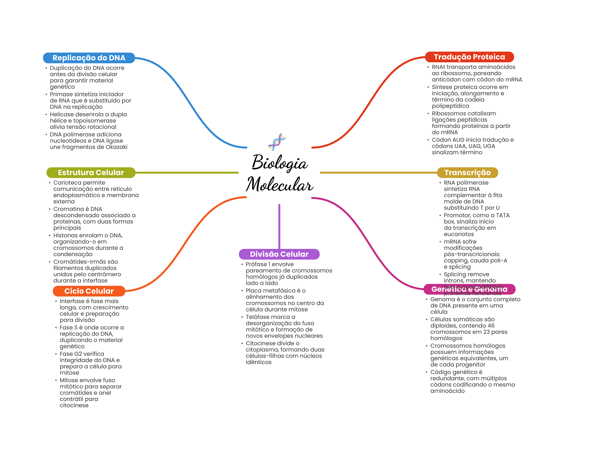 Replicação do DNA Tradução Proteica Duplicação do DNA ocorre RNAt transporta aminoácidos antes da divisão celular ao ribossomo, pareando para garantir material anticódon com códon do mRNA genético Síntese proteica ocorre em Primase sintetiza iniciador iniciação, alongamento e de RNA que é substituído por término da cadeia DNA na replicação polipeptídica Helicase desenrola a dupla Ribossomos catalisam hélice e topoisomerase ligações peptídicas alivia tensão rotacional formando proteínas a partir DNA polimerase adiciona do mRNA nucleotídeos e DNA ligase Códon AUG inicia tradução e une fragmentos de Okazaki códons UAA, UAG, UGA sinalizam término Biologia Estrutura Celular Transcrição Carioteca permite comunicação entre retículo Molecular RNA polimerase sintetiza RNA endoplasmático e membrana complementar à fita externa molde de DNA Cromatina é DNA substituindo T por U descondensado associado a Promotor, como a TATA proteínas, com duas formas box, sinaliza início principais da transcrição em Histonas enrolam DNA, eucariotos organizando-o em mRNA sofre cromossomos durante a modificações condensação Divisão Celular pós-transcricionais: são Prófase 1 envolve capping, cauda poli-A filamentos duplicados e splicing pareamento de cromossomos unidos pelo centrômero homólogos já duplicados Splicing remove durante a interfase lado a lado introns, mantendo Ciclo Celular Placa metafásica é Genetica e Genorna alinhamento dos Interfase é fase mais Genoma é conjunto completo cromossomos no centro da longa, com crescimento de DNA presente em uma célula durante mitose celular e preparação célula Telófase marca a para divisão Células somáticas são desorganização do fuso Fase S é onde ocorre a diploides, contendo 46 mitótico e formação de replicação do DNA, cromossomos em 23 pares novos envelopes nucleares duplicando material homólogos Citocinese divide genético Cromossomos homólogos citoplasma, formando duas Fase G2 verifica possuem informações células-filhas com núcleos integridade do DNA e genéticas equivalentes, um idênticos prepara a célula para de cada progenitor mitose Código genético é Mitose envolve fuso redundante, com múltiplos mitótico para separar códons codificando mesmo cromátides e anel aminoácido contrátil para citocinese