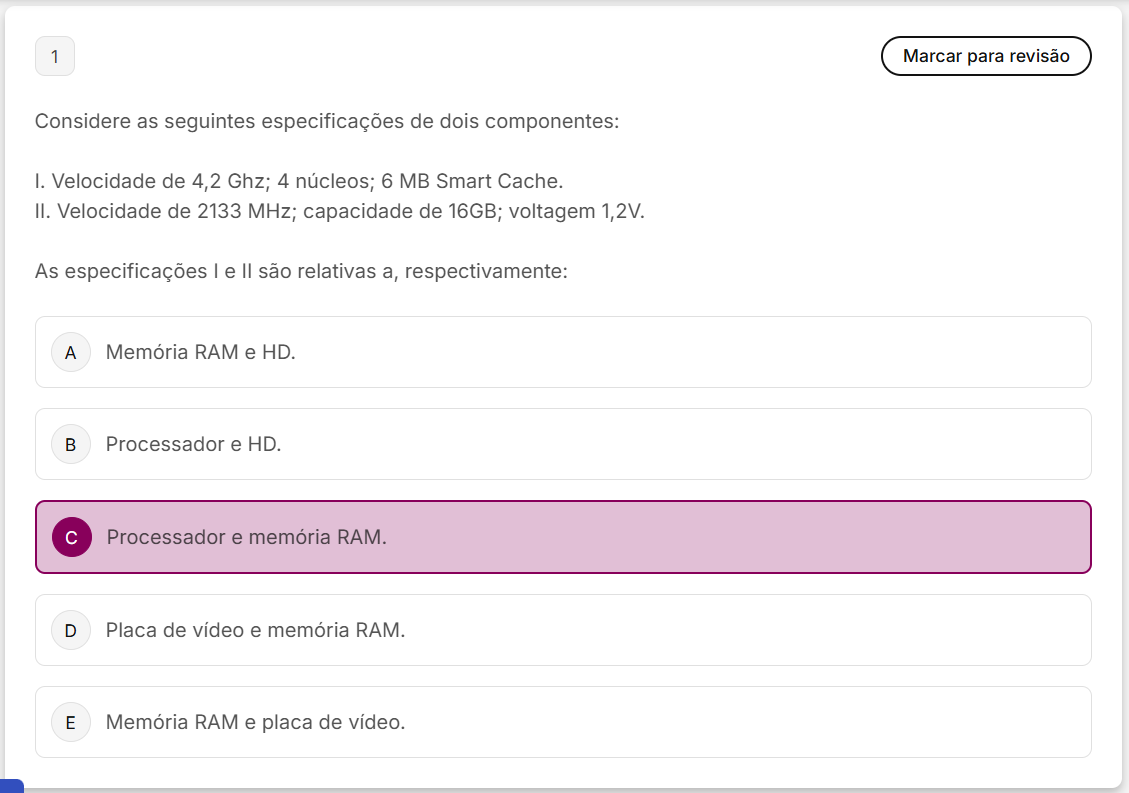 1 Marcar para revisão Considere as seguintes especificações de dois componentes: I. Velocidade de 4,2 Ghz; 4 núcleos; 6 MB Smart Cache. II. Velocidade de 2133 MHz; capacidade de 16GB; voltagem 1,2V. As especificações I e são relativas a, respectivamente: A Memória RAM e HD. B Processador e HD. Processador e memória RAM. D Placa de vídeo e memória RAM. E Memória RAM e placa de vídeo.