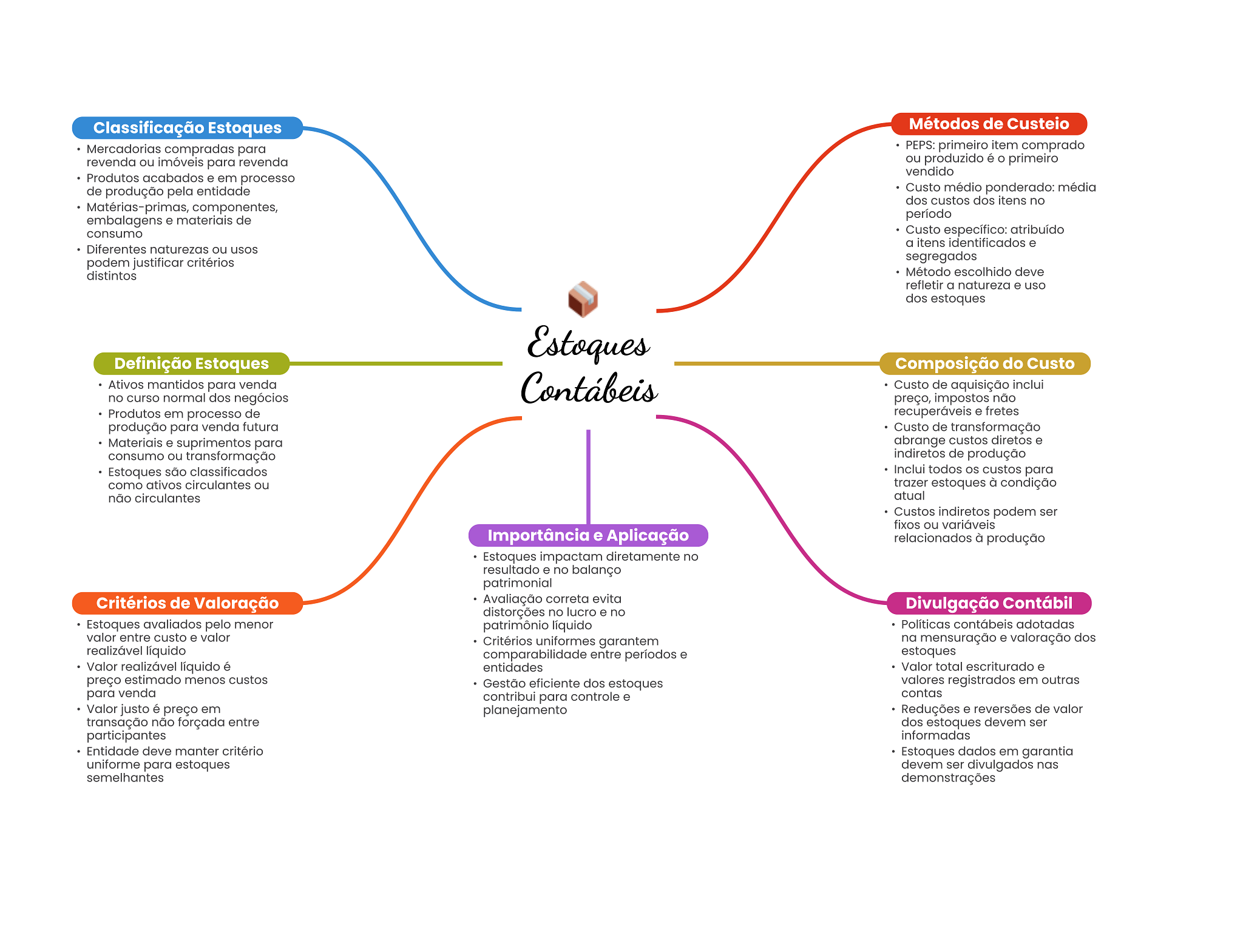 Classificação Estoques Métodos de Custeio Mercadorias compradas para PEPS: primeiro item comprado revenda ou imóveis para revenda ou produzido é primeiro vendido Produtos acabados e em processo de produção pela entidade Custo médio ponderado: média dos custos dos itens no Matérias-primas, componentes, embalagens e materiais de período consumo Custo específico: atribuído a itens identificados e Diferentes naturezas ou usos podem justificar critérios segregados distintos Método escolhido deve refletir a natureza e uso dos estoques Estoques Definição Estoques Composição do Custo Ativos mantidos para venda Contábeis Custo de aquisição inclui no curso normal dos negócios preço, impostos não Produtos em processo de recuperáveis e fretes produção para venda futura Custo de transformação Materiais e suprimentos para abrange custos diretos e consumo ou transformação indiretos de produção Estoques são classificados Inclui todos OS custos para como ativos circulantes ou trazer estoques à condição não circulantes atual Custos indiretos podem ser fixos ou variáveis Importância e Aplicação relacionados à produção Estoques impactam diretamente no resultado e no balanço patrimonial Critérios de Valoração Avaliação correta evita distorções no lucro e no Divulgação Contábil Estoques avaliados pelo menor patrimônio líquido Políticas contábeis adotadas valor entre custo e valor Critérios uniformes garantem na mensuração e valoração dos realizável líquido comparabilidade entre períodos e estoques Valor realizável líquido é entidades Valor total escriturado e preço estimado menos custos Gestão eficiente dos estoques valores registrados em outras para venda contribui para controle e contas Valor justo é preço em planejamento Reduções e reversões de valor transação não forçada entre dos estoques devem ser participantes informadas Entidade deve manter critério Estoques dados em garantia uniforme para estoques devem ser divulgados nas semelhantes demonstrações