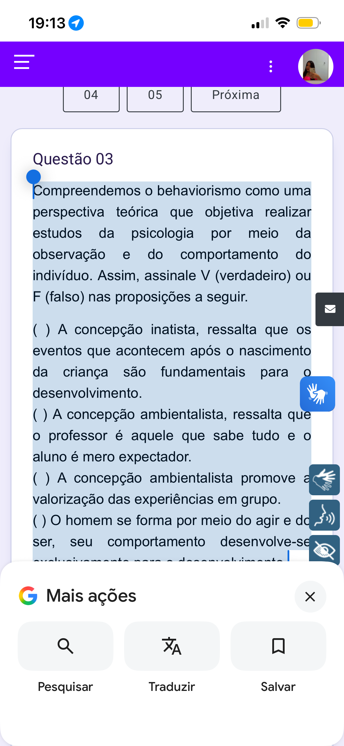 19:13 ... 04 05 Próxima Questão 03 Compreendemos behaviorismo como uma perspectiva teórica que objetiva realizar estudos da psicologia por meio da observação e do comportamento do indivíduo. Assim, assinale V (verdadeiro) ou F (falso) nas proposições a seguir. A concepção inatista, ressalta que os eventos que acontecem após nascimento da criança são fundamentais para desenvolvimento. A concepção ambientalista, ressalta que professor é aquele que sabe tudo e aluno é mero expectador. A concepção ambientalista promove a valorização das experiências em grupo. homem se forma por meio do agir e do ser, seu comportamento desenvolve-se Mais ações X Pesquisar Traduzir Salvar