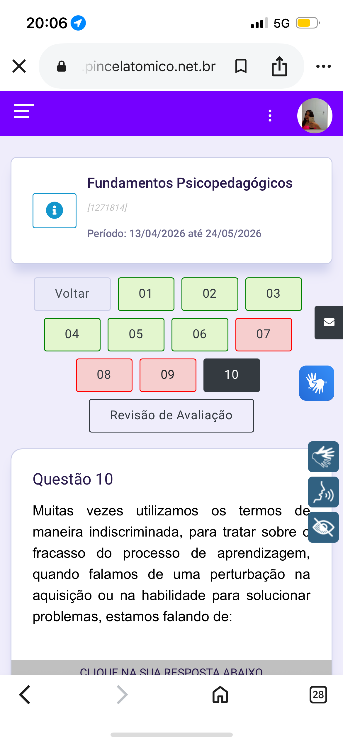 20:06 5G X pincelatomico.net.br Fundamentos Psicopedagógicos i [1271814] Período: 13/04/2026 até 24/05/2026 Voltar 01 02 03 04 05 06 07 08 09 10 Revisão de Avaliação Questão 10 Muitas vezes utilizamos os termos de maneira indiscriminada, para tratar sobre fracasso do processo de aprendizagem, quando falamos de uma perturbação na aquisição ou na habilidade para solucionar problemas, estamos falando de: CLIQUE NA SUA RESPOSTA ABAIXO 28