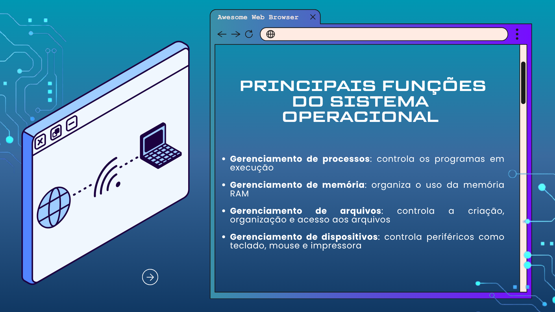 Awesome Web Browser X PRINCIPAIS FUNÇÕES DO SISTEMA OPERACIONAL Gerenciamento de processos: controla os programas em execução Gerenciamento de memória: organiza uso da memória RAM Gerenciamento de arquivos: controla a criação, organização e acesso aos arquivos Gerenciamento de dispositivos: controla periféricos como teclado, mouse e impressora