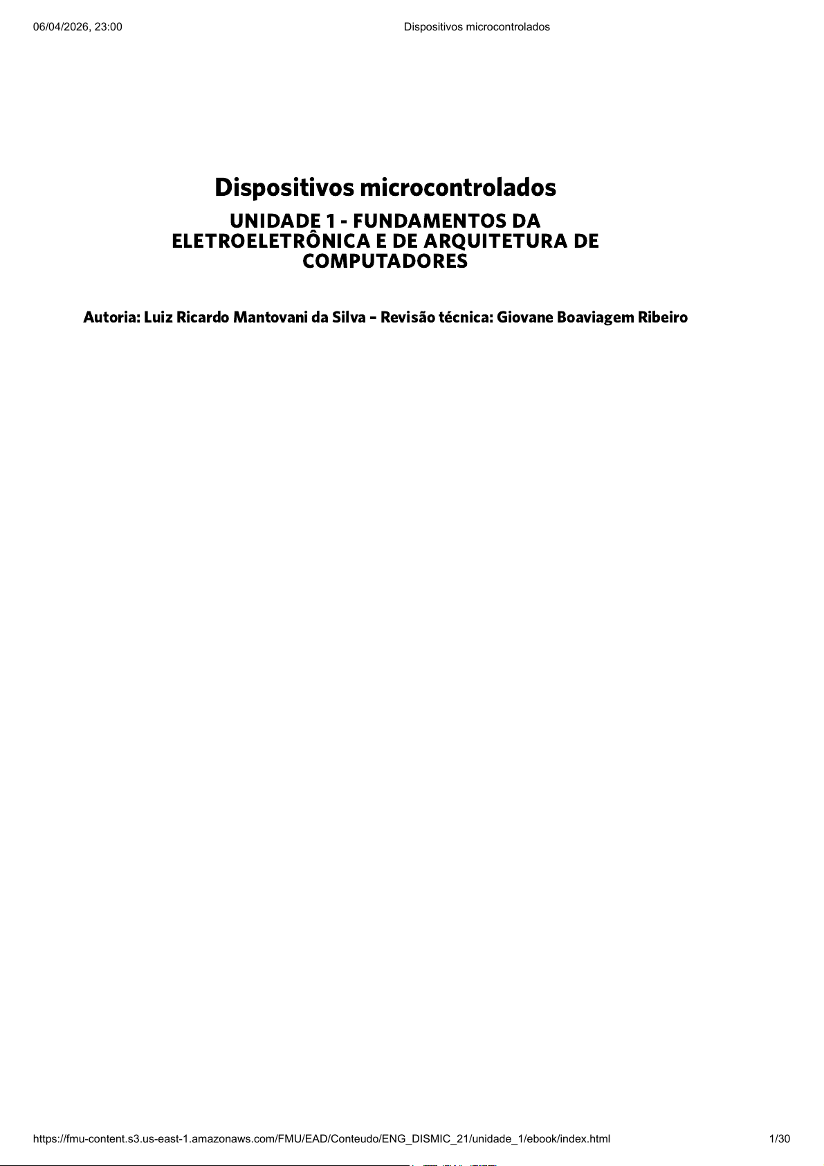 Autoria: Luiz Ricardo Mantovani da Silva – Revisão técnica: Giovane Boaviagem Ribeiro Dispositivos microcontrolados UNIDADE 1 - FUNDAMENTOS DA ELETROELETRÔNICA E DE ARQUITETURA DE COMPUTADORES 06/04/2026, 23:00 Dispositivos microcontrolados https://fmu-content.s3.us-east-1.amazonaws.com/FMU/EAD/Conteudo/ENG_DISMIC_21/unidade_1/ebook/index.html 1/30 O século XXI apresentou à humanidade uma série de inovações tecnológicas, que trouxeram inúmeros benefícios e conforto para as pessoas, como veículos autônomos, computação em nuvem, computação de alto desempenho, avanço da inteligência artificial, entre outros. Um dos motivos do avanço tecnológico certamente foi o aumento da eficiência e redução do tamanho dos componentes que constituem os grandes computadores da atualidade. Os processadores tornaram-se mais eficientes, e os microcontroladores ganharam espaço na indústria de equipamentos eletrônicos, pois passaram a integrar a maioria dos aparelhos comercializados. Os microcontroladores são computadores concentrados em um único chip, ou seja, apresentam processador, memória e portas de entrada e saída, sendo muito úteis na indústria de eletroeletrônicos e em sistemas embarcados. Atualmente, as pessoas vêm tomando consciência de que estão se tornando dependentes da tecnologia, seja por meio do acesso às informações pelos dispositivos móveis ou pelo conforto em poder estar em um veículo autônomo. A realidade está se transformando no que outrora era apenas ficção científica, com dispositivos desde os primeiros microprocessadores 4004 da Intel, até os modernos processadores e microcontroladores, utilizados em equipamentos como sondas e estações espaciais, satélites de comunicação, robôs, naves para exploração interplanetária etc. Enfim, todos esses avanços estão intimamente ligados ao aprimoramento da eletroeletrônica e, consequentemente, ao aumento do poder computacional, que torna a vida mais gratificante e o futuro, emocionante. Bons estudos! Introdução 1.1 Eletroeletrônica e arquitetura de computadores A eletroeletrônica e a arquitetura de computadores sempre caminharam muito próximas, uma influenciando a outra. Serviram, pois, como base tecnológica para o desenvolvimento e criação de muitos equipamentos que revolucionam o modelo de vida das pessoas (TANENBAUM, 2013). Quando falamos em arquitetura de computadores, nos referimos à estrutura física e lógica das máquinas, portanto, é importante que conheçamos seus fundamentos, para que, assim, possamos entender o funcionamento, as possibilidades de aplicações, a estrutura física do equipamento e como as partes se comunicam. Da mesma forma, o conhecimento dos conceitos básicos de eletroeletrônica é necessário, para que possamos entender o fluxo de trabalho e o deslocamento de dados digitais. 06/04/2026, 23:00 Dispositivos microcontrolados https://fmu-content.s3.us-east-1.amazonaws.com/FMU/EAD/Conteudo/ENG_DISMIC_21/unidade_1/ebook/index.html 2/30 1.1.1 Grandezas elétricas e conceitos de eletrônica analógica e digital Na Grécia Antiga, os gregos atribuíam a palavra eléktron à resina que atualmente chamamos de âmbar. Isso, porque observaram que após atritar o âmbar contra a pele de animais ele adquiria propriedades de atração. A partir de então, os gregos começaram a estudar todos os fenômenos que possuíam ligação com o que haviam observado, iniciando-se o estudo da eletricidade. Atualmente a humanidade vive com o conforto oferecido por uma infinidade de equipamentos que funcionam com a eletricidade. É fácil concluir o quão importante a eletricidade é para a humanidade. A eletricidade é o resultado de um fluxo de cargas elétricas. Podemos também dizer que a eletricidade é o ramo da física que estuda os fenômenos resultantes da movimentação das cargas elétricas O estudo da eletricidade está dividido em eletrostática e eletrodinâmica. Agora que estudamos um pouco da história da eletricidade e sua importância, podemos passar para as grandezas elétricas: potência, tensão, corrente e resistência. Os relâmpagos são fenômenos naturais temidos por uns e admirados por outros. O fato é que até o momento não existe uma forma de se captar a grande quantidade de energia criada por esses eventos em tão curto espaço de tempo. Esses fenômenos são capazes de produzir energia equivalente a 500 quilowatts. Você sabia? A eletrostática estuda as cargas elétricas em repouso. A eletrodinâmica estuda as cargas elétricas em movimento. Potência elétrica é a velocidade que o equipamento converte energia elétrica em trabalho. A potência elétrica é representada pela unidade watt (W), conforme o sistema internacional de medidas. Corrente elétrica é o fluxo ordenado de cargas elétricas que pode ocorrer em um meio iônico ou sólido. 06/04/2026, 23:00 Dispositivos microcontrolados https://fmu-content.s3.us-east-1.amazonaws.com/FMU/EAD/Conteudo/ENG_DISMIC_21/unidade_1/ebook/index.html 3/30 O estudo da eletricidade é importante para que se possa compreender os fenômenos e conceitos dela derivados, mas se faz necessário também o estudo da forma como ela é controlada para que se possa obter benefícios. Nesse sentido, a eletrônica é um ramo da eletricidade e estuda a forma como as informações são representadas, transmitidas, processadas, armazenadas por meio de componentes elétricos e eletrônicos que compõem os circuitos. Os trabalhos dessa área estudam o comportamento dos elétrons e são classificados conforme a apresentação dos sinais elétricos, quais sejam, analógicos e digitais. A eletrônica é, portanto, subdividida em eletrônica analógica e digital. A eletrônica analógica cuida do controle das energias físicas, variáveis ou não, que possam ser representadas de forma contínua. Os equipamentos capazes de trabalhar com esse tipo de energia são transistores, resistores, bobinas, capacitores, potenciômetros, 
