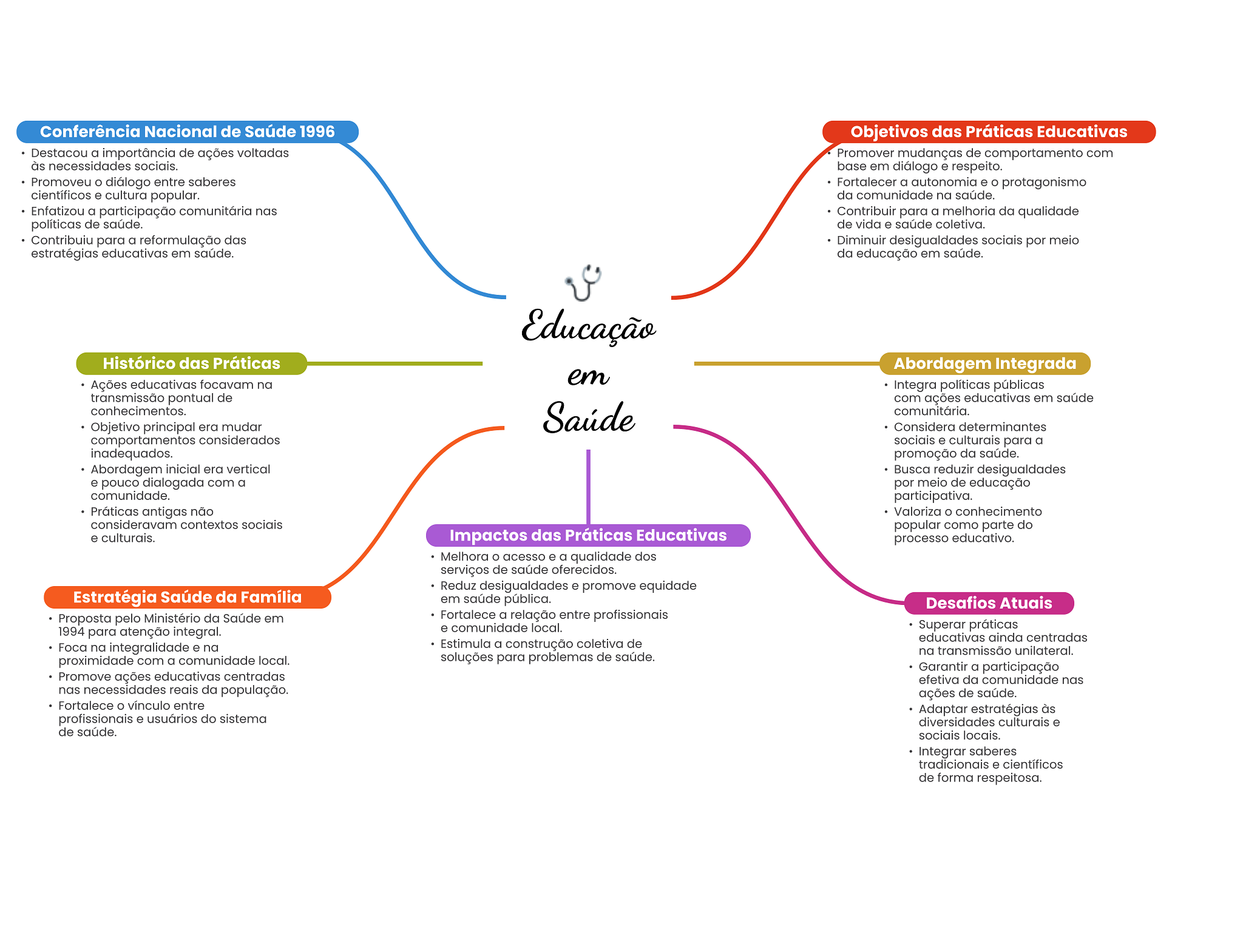Conferência Nacional de Saúde 1996 Objetivos das Práticas Educativas Destacou a importância de ações voltadas Promover mudanças de comportamento com às necessidades sociais. base em diálogo e respeito. Promoveu diálogo entre saberes Fortalecer a autonomia e protagonismo científicos e cultura popular. da comunidade na saúde. Enfatizou a participação comunitária nas Contribuir para a melhoria da qualidade políticas de saúde. de vida e saúde coletiva. Contribuiu para a reformulação das Diminuir desigualdades sociais por meio estratégias educativas em saúde. da educação em saúde. Educação Histórico das Práticas Abordagem Integrada em Ações educativas focavam na Integra políticas públicas transmissão pontual de com ações educativas em saúde conhecimentos. Saúde comunitária. Objetivo principal era mudar Considera determinantes comportamentos considerados sociais e culturais para a inadequados. promoção da saúde. Abordagem inicial era vertical Busca reduzir desigualdades e pouco dialogada com a por meio de educação comunidade. participativa. Práticas antigas não Valoriza O conhecimento consideravam contextos sociais popular como parte do e culturais. Impactos das Práticas Educativas processo educativo. Melhora acesso e a qualidade dos serviços de saúde oferecidos. Reduz desigualdades e promove equidade Estratégia Saúde da Família em saúde pública. Desafios Atuais Proposta pelo Ministério da Saúde em Fortalece a relação entre profissionais 1994 para atenção integral. e comunidade local. Superar práticas educativas ainda centradas Foca na integralidade e na Estimula a construção coletiva de na transmissão unilateral. proximidade com a comunidade local. soluções para problemas de saúde. Garantir a participação Promove ações educativas centradas efetiva da comunidade nas nas necessidades reais da população. ações de saúde. Fortalece o vínculo entre Adaptar estratégias às profissionais e usuários do sistema diversidades culturais e de saúde. sociais locais. Integrar saberes tradicionais e científicos de forma respeitosa.