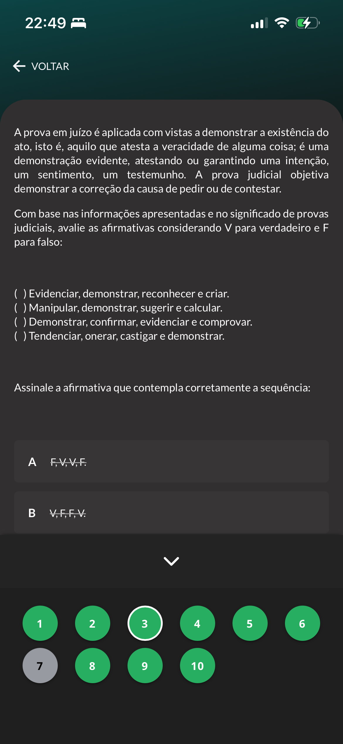 22:49 VOLTAR A prova em juízo é aplicada com vistas a demonstrar a existência do ato, isto é, aquilo que atesta a veracidade de alguma coisa; é uma demonstração evidente, atestando ou garantindo uma intenção, um sentimento, um testemunho. A prova judicial objetiva demonstrar a correção da causa de pedir ou de contestar. Com base nas informações apresentadas e no significado de provas judiciais, avalie as afirmativas considerando V para verdadeiro e F para falso: Evidenciar, demonstrar, reconhecer e criar. Manipular, demonstrar, sugerir e calcular. Demonstrar, confirmar, evidenciar e comprovar. Tendenciar, onerar, castigar e demonstrar. Assinale a afirmativa que contempla corretamente a sequência: A V,F,F,V. 1 2 3 4 5 6 7 8 9 10