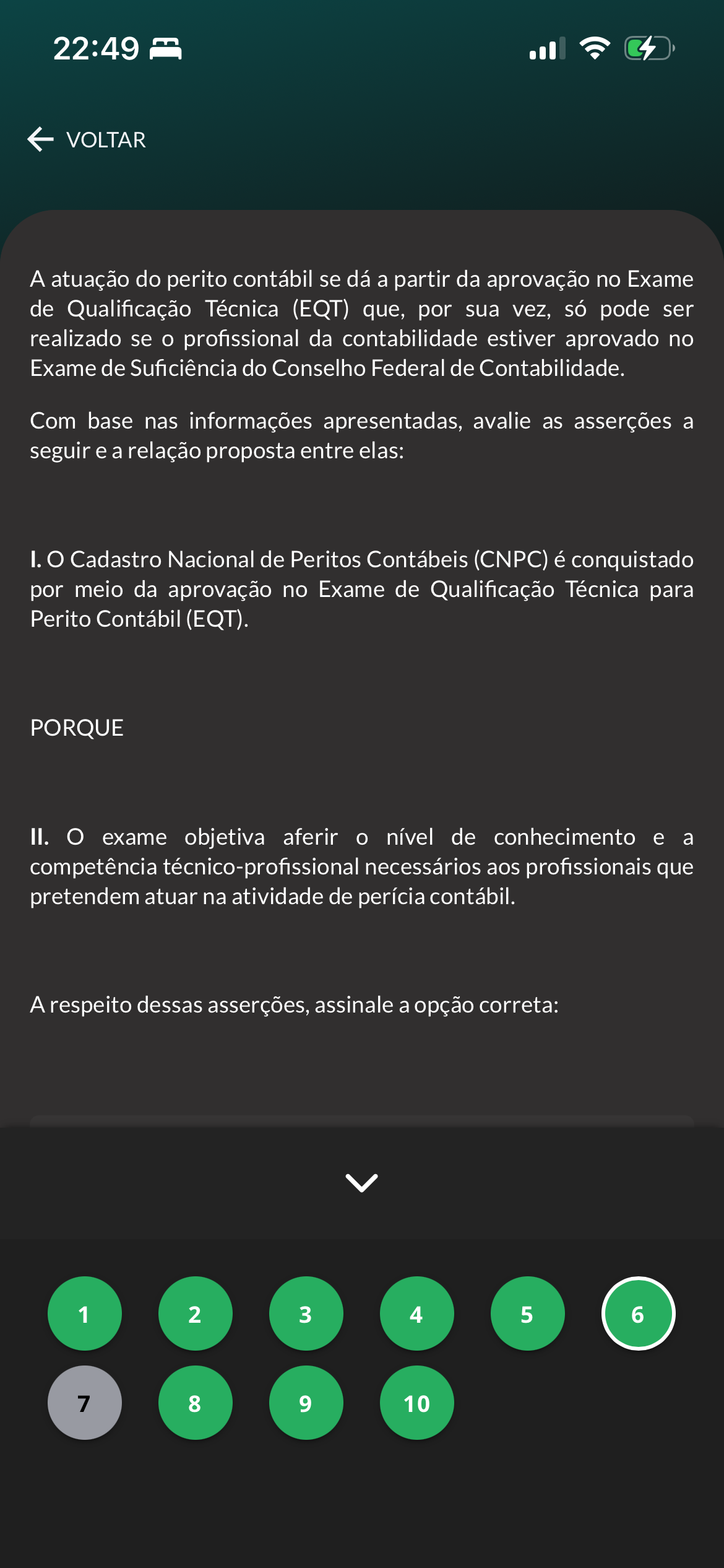 22:49 VOLTAR A atuação do perito contábil se dá a partir da aprovação no Exame de Qualificação Técnica (EQT) que, por sua vez, só pode ser realizado se profissional da contabilidade estiver aprovado no Exame de Suficiência do Conselho Federal de Contabilidade. Com base nas informações apresentadas, avalie as asserções a seguir e a relação proposta entre elas: Cadastro Nacional de Peritos Contábeis (CNPC) é conquistado por meio da aprovação no Exame de Qualificação Técnica para Perito Contábil (EQT). PORQUE II. exame objetiva aferir nível de conhecimento e a competência técnico-profissional necessários aos profissionais que pretendem atuar na atividade de perícia contábil. A respeito dessas asserções, assinale a opção correta: 1 2 3 4 5 6 7 8 9 10
