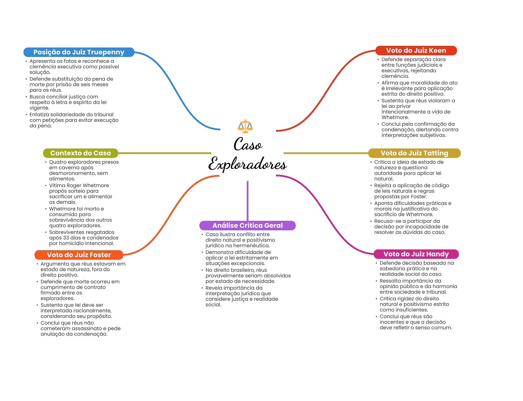 Posição do Juiz Truepenny Voto do Juiz Keen Apresenta fatos e reconhece a Defende separação clara clemência executiva como possível entre funções judiciais e solução. executivas, rejeitando clemência. Defende substituição da pena de morte por prisão de seis meses Afirma que moralidade do ato para réus. é irrelevante para aplicação Busca conciliar justiça com estrita do direito positivo. respeito à letra e espírito da lei Sustenta que réus violaram a vigente. lei ao privar intencionalmente a vida de Enfatiza solidariedade do tribunal Whetmore. com petições para evitar execução da pena. Conclui pela confirmação da condenação, alertando contra interpretações subjetivas. Caso Contexto do Caso Voto do Juiz Tatting Quatro exploradores presos em caverna após Exploradores Critica a ideia de estado de natureza e questiona desmoronamento, sem autoridade para aplicar lei alimentos. natural. Vítima Roger Whetmore Rejeita a aplicação de código propôs sorteio para de leis naturais e regras sacrificar um e alimentar propostas por Foster. demais. Aponta dificuldades práticas e Whetmore foi morto e morais na justificativa do consumido para sacrifício de Whetmore. sobrevivência dos outros Recusa-se a participar da quatro exploradores. Análise Crítica Geral decisão por incapacidade de Sobreviventes resgatados Caso ilustra conflito entre resolver as dúvidas do caso. após 33 dias e condenados direito natural e positivismo por homicídio intencional. jurídico na hermenêutica. Voto do Juiz Foster Demonstra dificuldade de Voto do Juiz Handy aplicar a lei estritamente em Argumenta que réus estavam em situações excepcionais. Defende decisão baseada na estado de natureza, fora do No direito brasileiro, réus sabedoria prática e na direito positivo. provavelmente seriam absolvidos realidade social do caso. Defende que morte ocorreu em por estado de necessidade. Ressalta importância da cumprimento de contrato Revela importância da opinião pública e da harmonia firmado entre interpretação jurídica que entre sociedade e tribunal. exploradores. considere justiça e realidade Critica rigidez do direito Sustenta que lei deve ser social. natural e positivismo estrito interpretada racionalmente, como insuficientes. considerando seu propósito. Conclui que réus são Conclui que réus não inocentes e que a decisão cometeram assassinato e pede deve refletir senso comum. anulação da condenação.