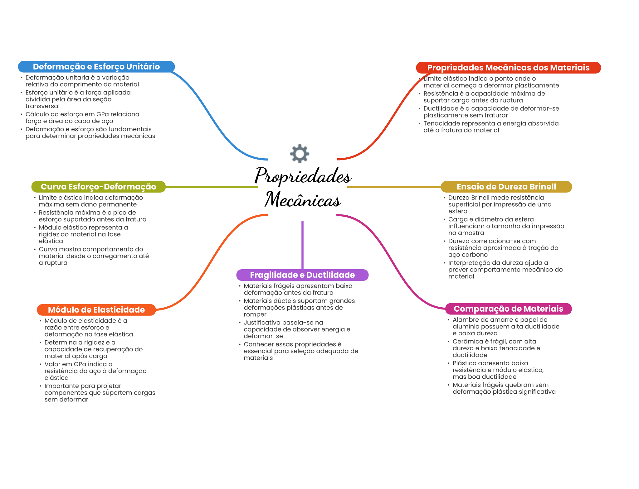 Deformação e Esforço Unitário Propriedades Mecânicas dos Materiais Deformação unitaria é a variação Limite elástico indica ponto onde relativa do comprimento do material material começa a deformar plasticamente Esforço unitário é a força aplicada Resistência é a capacidade máxima de dividida pela área da seção suportar carga antes da ruptura transversal Ductilidade é a capacidade de deformar-se Cálculo do esforço em GPa relaciona plasticamente sem fraturar força e área do cabo de aço Tenacidade representa a energia absorvida Deformação e esforço são fundamentais até a fratura do material para determinar propriedades mecânicas Propriedades Curva Ensaio de Dureza Brinell Limite elástico indica deformação Mecânicas Dureza Brinell mede resistência máxima sem dano permanente superficial por impressão de uma Resistência máxima é pico de esfera esforço suportado antes da fratura Carga e diâmetro da esfera Módulo elástico representa a influenciam tamanho da impressão rigidez do material na fase na amostra elástica Dureza correlaciona-se com Curva mostra comportamento do resistência aproximada à tração do material desde carregamento até aço carbono a ruptura Interpretação da dureza ajuda a prever comportamento mecânico do Fragilidade e Ductilidade material Materiais frágeis apresentam baixa deformação antes da fratura Materiais dúcteis suportam grandes Módulo de Elasticidade deformações plásticas antes de Comparação de Materiais romper Módulo de elasticidade é a Justificativa baseia-se na Alambre de amarre e papel de razão entre esforço e capacidade de absorver energia e alumínio possuem alta ductilidade deformação na fase elástica deformar-se e baixa dureza Determina a rigidez e a Conhecer essas propriedades é Cerâmica é frágil, com alta capacidade de recuperação do dureza e baixa tenacidade e essencial para seleção adequada de material após carga materiais ductilidade Valor em GPa indica a Plástico apresenta baixa resistência do aço à deformação resistência e módulo elástico, elástica mas boa ductilidade Importante para projetar Materiais frágeis quebram sem componentes que suportem cargas deformação plástica significativa sem deformar