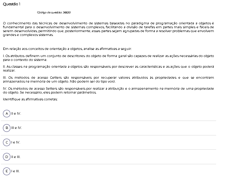 Questão 1 Código da questão: 36630 conhecimento das técnicas de desenvolvimento de sistemas baseadas no paradigma de programação orientada a objetos fundamental para desenvolvimento de sistemas facilitando a divisão de tarefas em partes mais simples e de serem desenvolvidas, permitindo que, posteriormente, essas partes sejam de forma a resolver problemas que envolvem grandes e complexos Em relação conceitos de orientação a objetos, analise as afirmativas a seguir: I. Os atributos definem um conjunto de descritores do objeto de forma geral são capazes de realizar as ações necessárias do objeto para contexto do II. As classes na programação orientada a objetos são responsáveis por descrever as caracteristicas e as ações que objeto poderá realizar. III. Os métodos de acesso Cetters são responsáveis por recuperar valores atribuidos propriedades e que se encontram armazenados na de um objeto. Não podem ser do tipo void. IV. Os métodos de acesso Setters são responsáveis por realizar a atribuição e armazenamento na de uma propriedade do objeto. Se necessário, eles podem retornar Identifique as afirmativas corretas: A II IV. B III e IV. C IV. D II III. III.