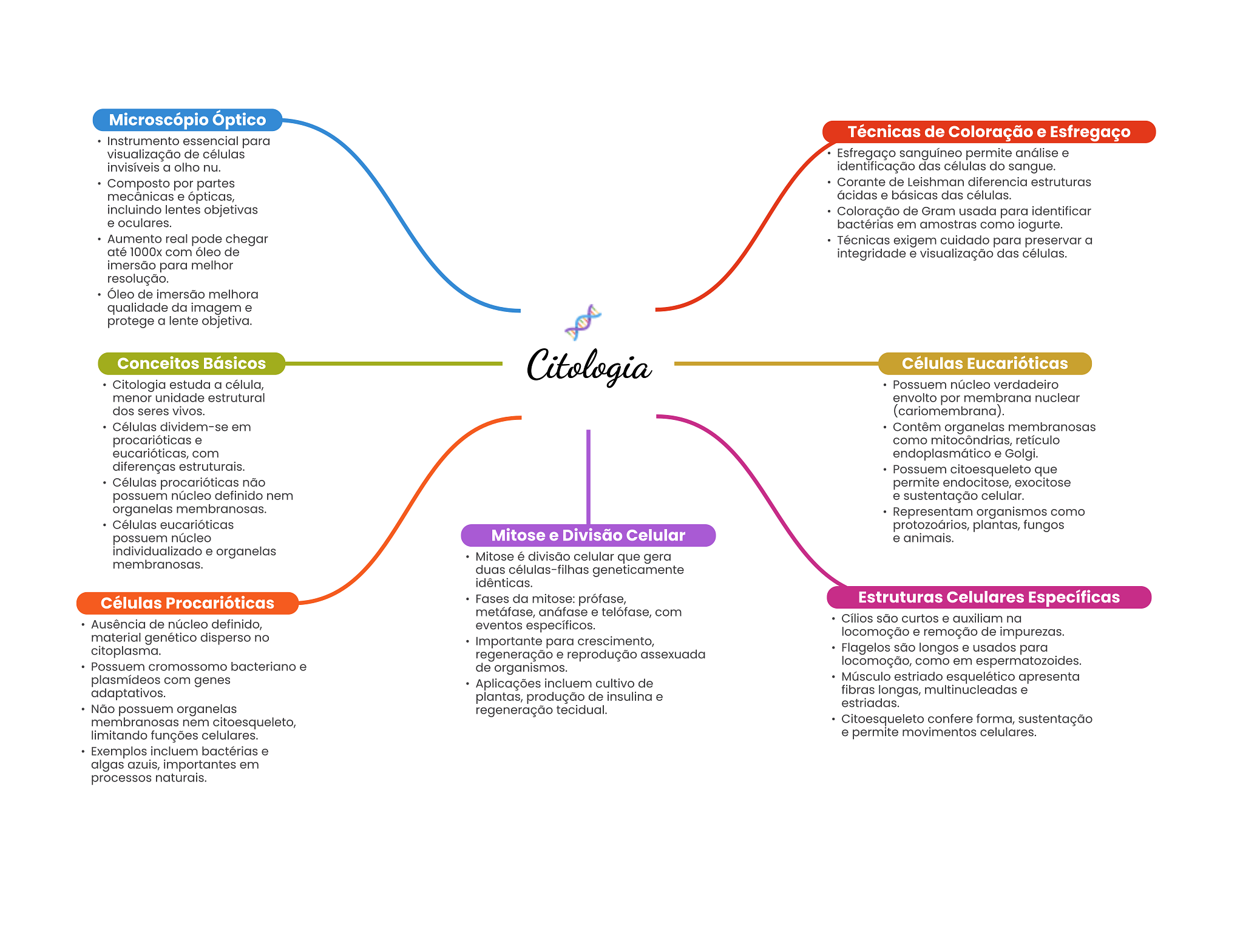 Microscópio Óptico Técnicas de Coloração e Esfregaço Instrumento essencial para visualização de células Esfregaço sanguíneo permite análise e invisíveis a olho nu. identificação das células do sangue. Composto por partes Corante de Leishman diferencia estruturas mecânicas e ópticas, ácidas e básicas das células. incluindo lentes objetivas Coloração de Gram usada para identificar e oculares. bactérias em amostras como iogurte. Aumento real pode chegar Técnicas exigem cuidado para preservar a até 1000x com óleo de integridade e visualização das células. imersão para melhor resolução. Óleo de imersão melhora qualidade da imagem e protege a lente objetiva. Conceitos Básicos Citologia Células Eucarióticas Citologia estuda a célula, Possuem núcleo verdadeiro menor unidade estrutural envolto por membrana nuclear dos seres vivos. (cariomembrana). Células dividem-se em Contêm organelas membranosas procarióticas e como mitocôndrias, retículo eucarióticas, com endoplasmático e Golgi. diferenças estruturais. Possuem citoesqueleto que Células procarióticas não permite endocitose, exocitose possuem núcleo definido nem e sustentação celular. organelas membranosas. Representam organismos como Células eucarióticas protozoários, plantas, fungos possuem núcleo Mitose e Divisão Celular e animais. individualizado e organelas Mitose é divisão celular que gera membranosas. duas células-filhas geneticamente idênticas. Células Procarióticas Fases da mitose: prófase, Estruturas Celulares Específicas metáfase, anáfase e telófase, com Cílios são curtos e auxiliam na Ausência de núcleo definido, eventos específicos. material genético disperso no locomoção e remoção de impurezas. Importante para crescimento, citoplasma. regeneração e reprodução assexuada Flagelos são longos e usados para Possuem cromossomo bacteriano e de organismos. locomoção, como em espermatozoides. plasmídeos com genes Aplicações incluem cultivo de Músculo estriado esquelético apresenta adaptativos. plantas, produção de insulina e fibras longas, multinucleadas e estriadas. Não possuem organelas regeneração tecidual. membranosas nem citoesqueleto, Citoesqueleto confere forma, sustentação limitando funções celulares. e permite movimentos celulares. Exemplos incluem bactérias e algas azuis, importantes em processos naturais.
