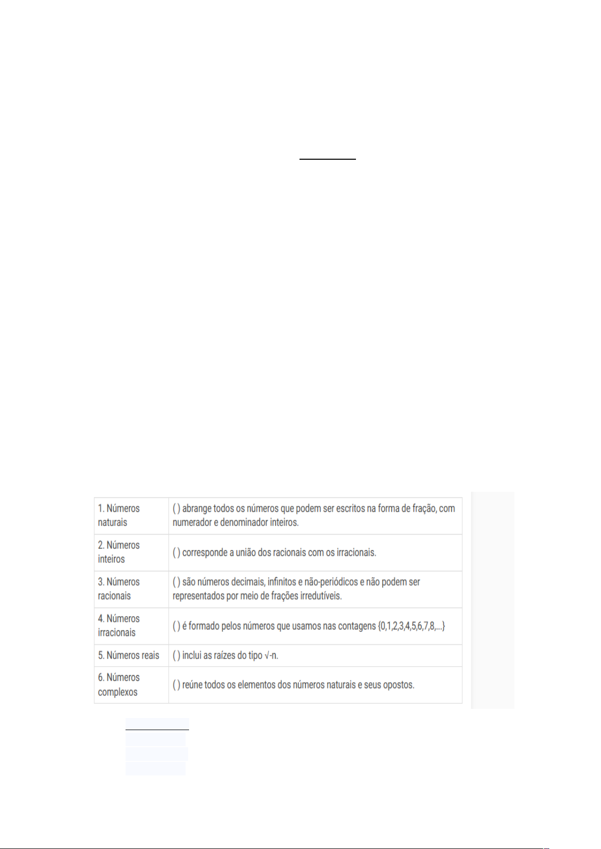 QUESTÃO 26. Os conjuntos numéricos incluem os seguintes conjuntos: Naturais (ℕ), Inteiros (ℤ), Racionais (ℚ), Irracionais (I), Reais (ℝ) e Complexos (ℂ). Sobre os conjuntos citados marque a definição que corresponde a cada um deles.