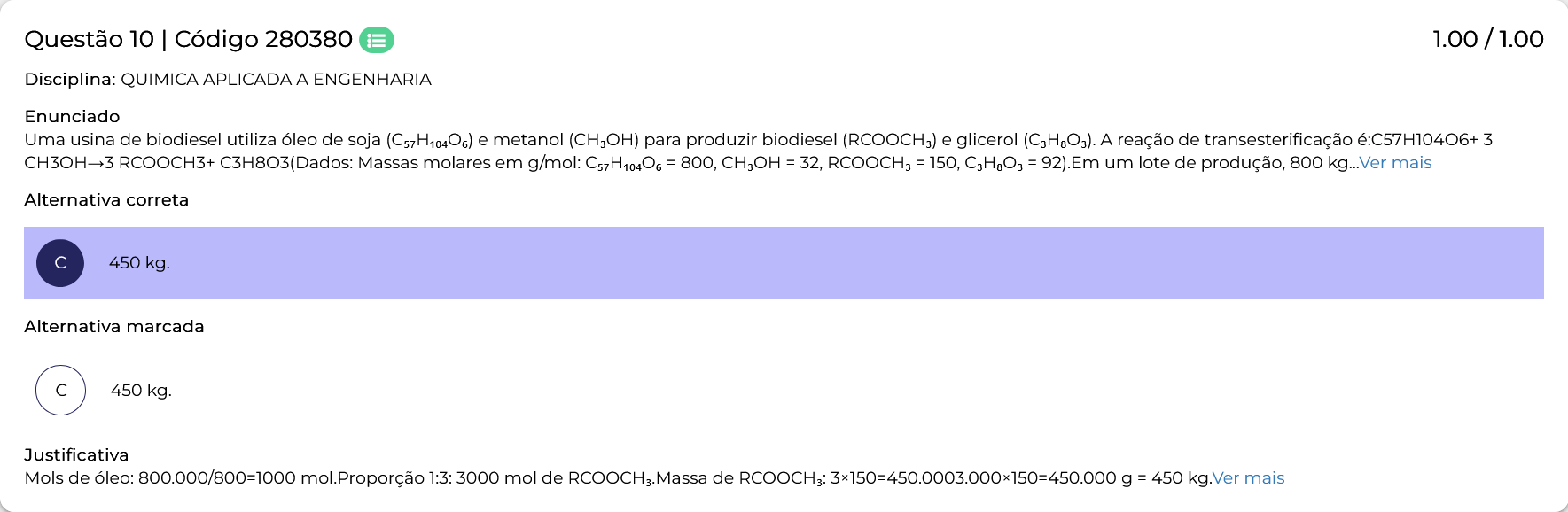 Questão 10 I Código 280380 1.00 / 1.00 Disciplina: QUIMICA APLICADA A ENGENHARIA Enunciado Uma usina de biodiesel utiliza óleo de soja (C₅₇H₁₀₄O₆) e metanol para produzir biodiesel e glicerol (C₃H₈O₃). A reação de transesterificação 3 CH3OH-3 RCOOCH3+ C3H8O3(Dados: Massas molares em g/mol: C₅₇H₁₀₄O₆ = 800, = 32, = 150, C₃H₈O₃ = 92).Em um lote de produção, 800 kg...Ver mais Alternativa correta 450 kg. Alternativa marcada 450 kg. Justificativa Mols de óleo: 800.000/800=1000 mol.Proporção 1:3: 3000 mol de Massa de g = 450 kg.Ver mais
