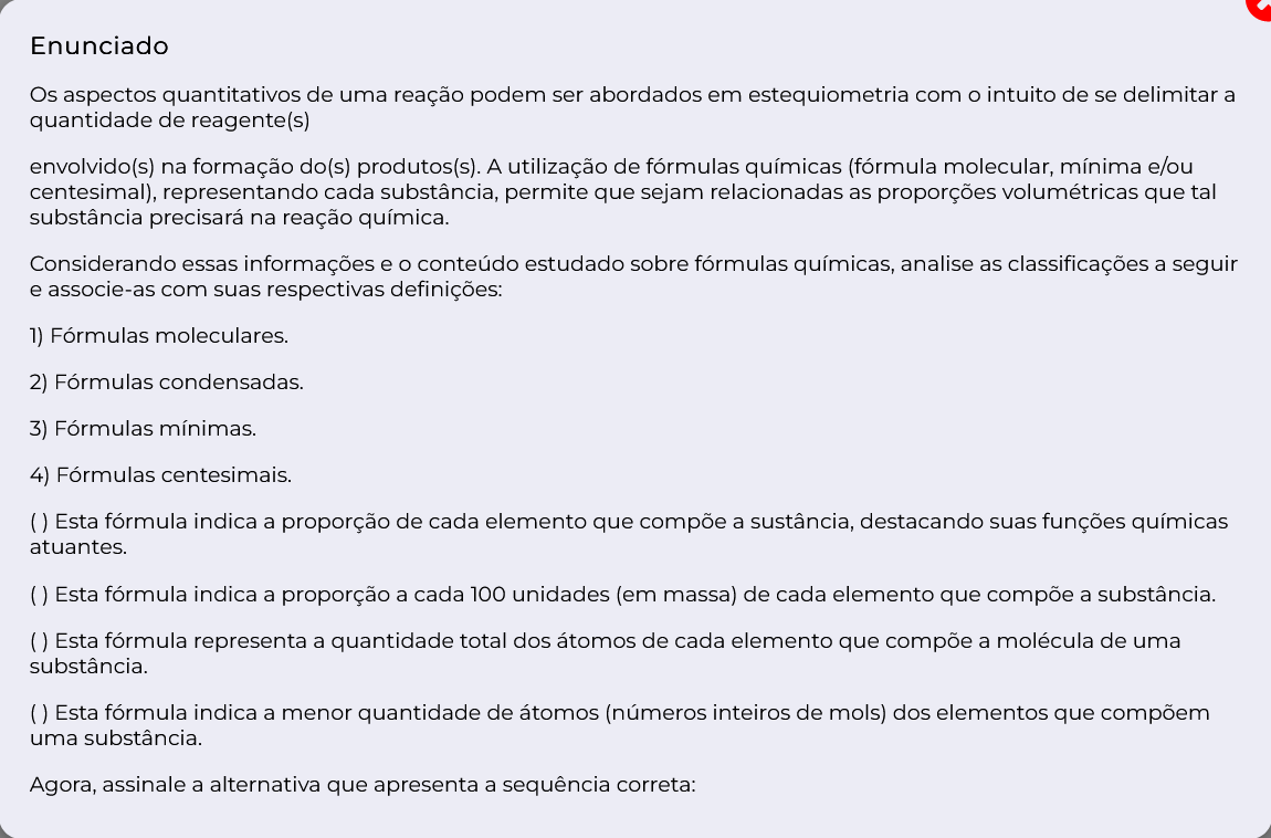 Enunciado Os aspectos quantitativos de uma reação podem ser abordados em estequiometria com intuito de se delimitar a quantidade de reagente(s) envolvido(s) na formação do(s) produtos(s). A utilização de fórmulas químicas (fórmula molecular, mínima e/ou centesimal), representando cada substância, permite que sejam relacionadas as proporções volumétricas que tal substância precisará na reação química. Considerando essas informações e conteúdo estudado sobre fórmulas químicas, analise as classificações a seguir e associe-as com suas respectivas definições: 1) Fórmulas moleculares. 2) Fórmulas condensadas. 3) Fórmulas mínimas. 4) Fórmulas centesimais. () Esta fórmula indica a proporção de cada elemento que compõe a sustância, destacando suas funções químicas atuantes. () Esta fórmula indica a proporção a cada 100 unidades (em massa) de cada elemento que compõe a substância. () Esta fórmula representa a quantidade total dos átomos de cada elemento que compõe a molécula de uma substância. () Esta fórmula indica a menor quantidade de átomos (números inteiros de mols) dos elementos que compõem uma substância. Agora, assinale a alternativa que apresenta a sequência correta: