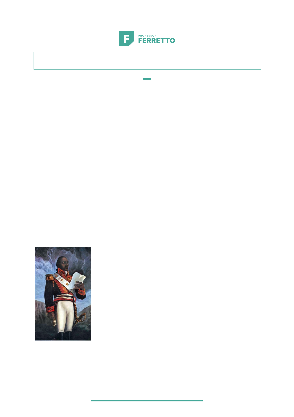 1 Antecedentes: • A Ilha de São Domingos era dominada pelos espanhóis desde o século XV, mas no século XVIII, através de corsários, o lado ocidental foi colonizado franceses e reconhecido por Luís XIV. • Economicamente era baseada no Plantation e rentável para o país que a colonizasse, pois até o século XVIII, representava quase metade do açúcar que abastecia a Europa. • A sociedade na ilha era dividida em três castas, sendo elas os brancos de origem francesa, os mestiços e os escravos de origem africana. A revolução: • Houve uma grande influência da Revolução Francesa de 1789, pois a Declaração de Direitos do Homem e do Cidadão estabelecia que todo homem era igual perante a lei. • Sob a liderança de Toussaint Loverture, que era filho de escravos, os franceses haviam expulsado as ameaças britânicas da ilha de Santo Domingo, com a condição de que libertassem os escravos. • Em 1793, os jacobinos decretaram a abolição da escravidão em todas as colônias francesas, o que desagradou os colonos que viviam na ilha. Revolução Haitiana (1791 – 1804) 2 • Em 1801, Loverture lutou pela autonomia definitiva da ilha, se autodeclarando governador vitalício, o que desagradou o general francês Napoleão Bonaparte, que estava prestes a se tornar imperador. • Napoleão enviou tropas e prometeram a Lovertoure a sua liberdade, caso entregasse as armas e se aliasse novamente aos franceses. Ele aceitou, mas foi enganado, sendo preso e morto em 1802. • A revolução passou a ser conduzida por Jean-Jacques Dessalines. Os franceses haviam enfraquecido com o bloqueio naval da Inglaterra, além da mostra de desinteresse pelas colônias na América, quando Napoleão havia vendido o território da Lousiana para os EUA. • Dessalines proclamou a independência da ilha no dia 1 de janeiro de 1804, se tornando imperador Jacques I e nomeando o território de Haiti (Terra de Montanhas) em homenagem a língua dos nativos Arahuaca, que ali viviam antes da colonização. • A revolução haitiana foi um processo provocado por escravos e ex-escravos, diferente da Independência dos EUA, foi conduzido pela burguesia, e assim, influenciou movimentos separatistas e abolicionistas no continente, incluindo o Brasil, porém, a elite daqui temia o que chamavam de “haititianismo”, que representava uma sublevação popular para o fim da escravização.