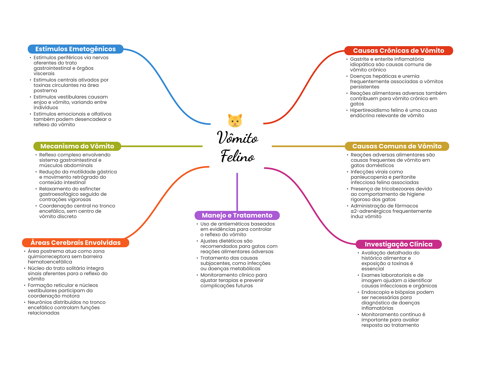 Estímulos Emetogênicos Causas Crônicas de Vômito Estímulos periféricos via nervos Gastrite e enterite inflamatória aferentes do trato idiopática são causas comuns de gastrointestinal e órgãos vômito crônico viscerais Doenças hepáticas e uremia Estímulos centrais ativados por frequentemente associadas a vômitos toxinas circulantes na área persistentes postrema Reações alimentares adversas também Estímulos vestibulares causam contribuem para vômito crônico em enjoo e vômito, variando entre gatos indivíduos Hipertireoidismo felino é uma causa Estímulos emocionais e olfativos endócrina relevante de vômito também podem desencadear reflexo do vômito Vômito Mecanismo do Vômito Causas Comuns de Vômito Reflexo complexo envolvendo Felino Reações adversas alimentares são sistema gastrointestinal e causas frequentes de vômito em músculos abdominais gatos domésticos Redução da motilidade gástrica Infecções virais como e movimento retrógrado do panleucopenia e peritonite conteúdo intestinal infecciosa felina associadas Relaxamento do esfíncter Presença de tricobezoares devido gastroesofágico seguido de ao comportamento de higiene contrações vigorosas rigoroso dos gatos Coordenação central no tronco Administração de fármacos encefálico, sem centro de frequentemente vômito discreto Manejo e Tratamento induz vômito Uso de antieméticos baseados em evidências para controlar reflexo do vômito Áreas Cerebrais Envolvidas Ajustes dietéticos são recomendados para gatos com Investigação Clínica Área postrema atua como zona reações alimentares adversas Avaliação detalhada do quimiorreceptora sem barreira Tratamento das causas histórico alimentar e subjacentes, como infecções exposição a toxinas é Núcleo do trato solitário integra ou doenças metabólicas essencial sinais aferentes para reflexo do Monitoramento clínico para Exames laboratoriais e de vômito ajustar terapias e prevenir imagem ajudam a identificar Formação reticular e núcleos complicações futuras causas infecciosas e orgânicas vestibulares participam da Endoscopia e biópsias podem coordenação motora ser necessárias para Neurônios distribuídos no tronco diagnóstico de doenças encefálico controlam funções inflamatórias relacionadas Monitoramento contínuo é importante para avaliar resposta ao tratamento