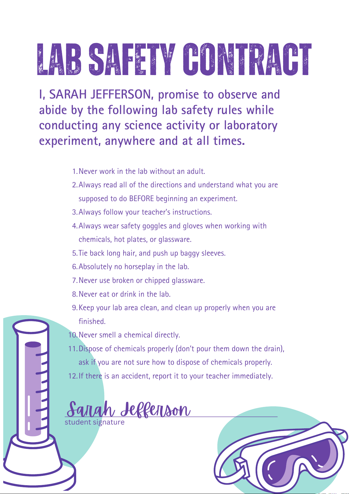I, SARAH JEFFERSON, promise to observe and abide by the following lab safety rules while conducting any science activity or laboratory experiment, anywhere and at all times.