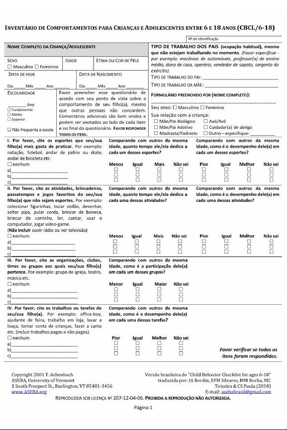 INVENTÁRIO DE COMPORTAMENTOS PARA CRIANÇAS E ADOLESCENTES ENTRE 6 E 18 ANOS (CBCL/6-18) de Identificação NOME COMPLETO DA CRIANÇA/ADOLESCENTE TIPO DE TRABALHO DOS PAIS (ocupação habitual), mesmo que não estejam trabalhando no momento. (Favor especificar SEXO IDADE ETNIA OU COR DE PELE por exemplo: mecânico de automóveis, professor(a) de ensino Masculino Feminino médio, dona de casa, operário, vendedor de sapato, sargento do exército). DATA DE HOJE DATA DE NASCIMENTO TIPO DE TRABALHO DO PAI: Dia Mês Ano Dia Mês Ano TIPO DE TRABALHO DA MÃE: ESCOLARIDADE Favor preencher esse questionário de FORMULÁRIO PREENCHIDO POR (NOME COMPLETO): acordo com seu ponto de vista sobre Ano comportamento de seu filho(a), mesmo Seu sexo: Masculino Feminino Fundamental que outras pessoas não concordem. Médio Comentários adicionais são bem vindos e Sua relação com a criança: Superior podem ser anotados ao lado de cada item Mãe/Pai Biológico Avó/Avô e no final do questionário. FAVOR RESPONDER Mãe/Pai Adotivo Não frequenta a escola Cuidador(a) de abrigo TODOS ITENS. Madrasta/Padrasto Outro especifique: I. Por favor, cite os esportes que seu/sua Comparando com outros da mesma Comparando com outros da mesma filho(a) mais gosta de praticar. Por exemplo: idade, quanto tempo ele/ela dedica a idade, como é desempenho dele(a) em natação, futebol, andar de patins ou skate, cada um desses esportes? cada um desses esportes? andar de bicicleta etc. nenhum Menos Igual Mais Não sei Pior Igual Melhor Não sei a) b) c) II. Por favor, cite as atividades, brincadeiras, Comparando com outros da mesma Comparando com outros da mesma passatempos e jogos favoritos do seu/sua idade, quanto tempo ele/ela dedica a idade, como é desempenho dele(a) em filho(a) que não sejam esportes. Por exemplo: cada uma dessas atividades? cada uma dessas atividades? colecionar figurinhas, tocar violão, desenhar, soltar pipa, pular corda, brincar de boneca, brincar de carrinho, ler, cantar, usar computador, jogar video-game. (Não incluir ouvir rádio ou ver televisão) nenhum Menos Igual Mais Não sei Pior Igual Melhor Não sei a) b) c) III. Por favor, cite as organizações, clubes, Comparando com outros da mesma times ou grupos aos quais seu/sua filho(a) idade, como é a participação dele(a) pertence. Por exemplo: grupo de igreja, teatro, em cada um desses grupos? música etc. nenhum Menor Igual Maior Não sei a) b) c) IV. Por favor, cite os trabalhos ou tarefas de Comparando com outros da mesma seu/sua filho(a). Por exemplo: office-boy, idade, como é o desempenho dele(a) ajudante de feira, trabalho em loja, lavar a em cada uma dessas tarefas? louça, tomar conta de crianças, fazer a cama etc. (incluir trabalhos pagos e não pagos). nenhum Pior Igual Melhor Não sei a) b) Favor verificar se todos os c) itens foram respondidos. Copyright 2001 T. Achenbach Versão brasileira do "Child Behavior Checklist for ages 6-18" ASEBA, University of Vermont traduzida por: IA Bordin, EFM Silvares, MM Rocha, MC 1 South Prospect St., Burlington, VT 05401-3456 Teixeira & CS Paula (2010) www.ASEBA.org E-mail: asebabrasil@gmail.com REPRODUZIDA SOB LICENÇA 207-12-04-06. PROIBIDA A REPRODUÇÃO NÃO AUTORIZADA. Página 1FAVOR RESPONDER TODOS os ITENS. V.1. Quantos amigos próximos seu filho(a) tem? (Não incluir irmãos e irmãs) Nenhum 1 2 ou 3 4 ou mais 2. Quantas vezes por semana seu/sua filho(a) encontra amigos ou colegas fora do horário da escola? (Não incluir irmãos e irmãs) Menos que 1 1 ou 2 3 ou mais VI. Comparando com outros da mesma idade, como seu filho/filha: Pior Igual Melhor a) Se dá com irmãos e irmãs? Não tem irmãos ou irmãs b) Se dá com outras crianças ou adolescentes? c) Se comporta em relação aos pais? d) Brinca ou trabalha sozinho(a)? VII. 1. Desempenho nas matérias escolares: Se a criança ou adolescente não estiver frequentando a escola, favor especificar motivo: Comparando com outros da mesma idade, como é desempenho de seu filho nas matérias escolares? (Só deixe em branco as matérias que seu filho não estiver cursando) Insuficiente para passar Pior Igual Melhor de ano (Abaixo da média exigida pela escola) a) Português ou Literatura b) História ou Estudos Sociais c) Matemática ou Aritmética d) Ciências Outras matérias escolares (por exemplo: geografia, inglês, computação, biologia, física, química etc.) Não incluir educação física e trabalhos manuais. e) f) g) 2. o seu filho(a) frequenta alguma sala de atendimento educacional especial ou instituição especializada? Não Sim Que tipo? 3. o seu filho(a) repetiu de ano? Não Sim Especifique o(s) ano(s) e o(s) motivo(s): 4. o seu filho(a) já teve problemas com desempenho escolar ou outros tipos de problema na escola? Não Sim Descreva-os, por favor: Quando esses problemas começaram? Esses problemas já foram resolvidos? Não Sim quando? seu filho(a) tem alguma doença ou deficiência (física ou mental)? Não Sim Descreva-a, por favor: Qual é a sua maior preocupação em relação a seu filho(a)? Por favor, descreva as principais qualidades e pontos positivos de seu filho(a). FAVOR CONFERIR SUAS RESPOSTAS E VERIFICAR SE TODOS os ITENS FORAM RESPONDIDOS. VERSÃO BRASILEIRA DO "CHILD BEHAVIOR CHECKLIST FOR AGES 6-18", TRADUZIDA POR: IA BORDIN, EFM SILVARES, MM ROCHA, MCTEIXEIRA & CS PAULA (2010). E-mail: asebabrasil@gmail.com REPRODUZIDA SOB LICENÇA 207-12-04-06. PROIBIDA A REPRODUÇÃO NÃO AUTORIZADA. Página 2FAVOR RESPONDER TODOS os ITENS. Logo abaixo, você encontrará uma lista de afirmações que descrevem crianças e adolescentes. Para cada afirmação que descreve seu filho(a) neste momento ou nos últimos seis meses, circule 2 se a afirmação é muito verdadeira ou frequentemente verdadeira em relação a seu filho(a). Circule 1 se a afirmação é um pouco verdadeira ou algumas vezes verdadeira em relação a seu filho(a). Se a afirmação não é verdadeira em relação a seu filho(a), circule 0. Por favor, r