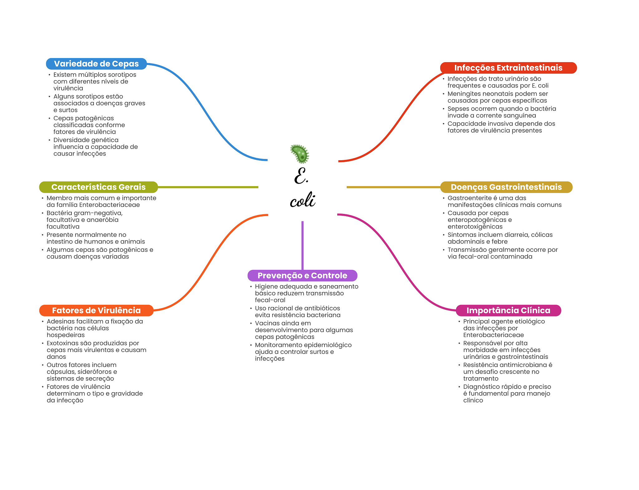 Variedade de Cepas Infecções Extraintestinais Existem múltiplos sorotipos com diferentes níveis de Infecções do trato urinário são virulência frequentes e causadas por E. coli Alguns sorotipos estão Meningites neonatais podem ser associados a doenças graves causadas por cepas específicas e surtos Sepses ocorrem quando a bactéria Cepas patogênicas invade a corrente sanguínea classificadas conforme Capacidade invasiva depende dos fatores de virulência fatores de virulência presentes Diversidade genética influencia a capacidade de causar infecções Características Gerais Doenças Gastrointestinais Membro mais comum e importante coli Gastroenterite é uma das da família Enterobacteriaceae manifestações clínicas mais comuns Bactéria gram-negativa, Causada por cepas facultativa e anaeróbia enteropatogênicas e facultativa enterotoxigênicas Presente normalmente no Sintomas incluem diarreia, cólicas intestino de humanos e animais abdominais e febre Algumas cepas são patogênicas e Transmissão geralmente ocorre por causam doenças variadas via fecal-oral contaminada Prevenção e Controle Higiene adequada e saneamento básico reduzem transmissão fecal-oral Fatores de Virulência Uso racional de antibióticos evita resistência bacteriana Importância Clínica Adesinas facilitam a fixação da Vacinas ainda em Principal agente etiológico bactéria nas células desenvolvimento para algumas das infecções por hospedeiras cepas patogênicas Exotoxinas são produzidas por Monitoramento epidemiológico Responsável por alta cepas mais virulentas e causam ajuda a controlar surtos e morbidade em infecções danos infecções urinárias e gastrointestinais Outros fatores incluem Resistência antimicrobiana é cápsulas, sideróforos e um desafio crescente no sistemas de secreção tratamento Fatores de virulência Diagnóstico rápido e preciso determinam tipo e gravidade é fundamental para manejo da infecção clínico