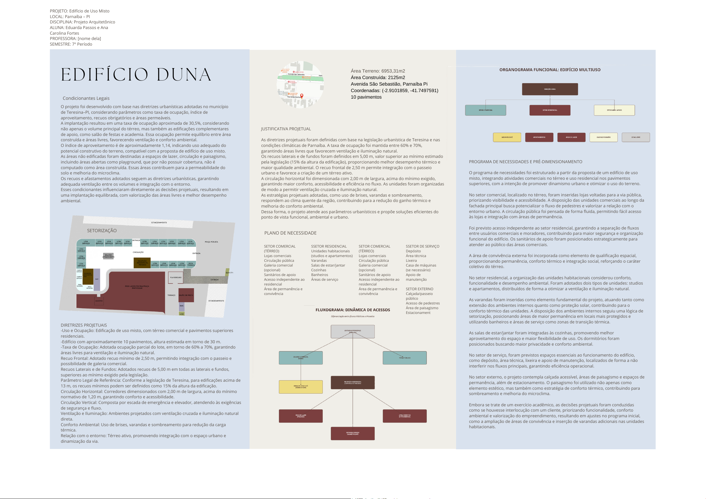 E D I F Í C I O D U N A SETOR COMERCIAL (TÉRREO) Lojas comerciais Circulação pública Galeria comercial (opcional) Sanitários de apoio Acesso independente ao residencial Área de permanência e convivência SSETOR RESIDENCIAL Unidades habitacionais (studios e apartamentos) Varandas Salas de estar/jantar Cozinhas Banheiros Áreas de serviço SSETOR DE SERVIÇO Depósito Área técnica Lixeira Casa de máquinas (se necessário) Apoio de manutenção SETOR EXTERNO Calçada/passeio público Acesso de pedestres Área de paisagismo Estacionament SETOR COMERCIAL (TÉRREO) Lojas comerciais Circulação pública Galeria comercial (opcional) Sanitários de apoio Acesso independente ao residencial Área de permanência e convivência PROJETO: Edifício de Uso Misto LOCAL: Parnaíba – PI DISCIPLINA: Projeto Arquitetônico ALUNA: Eduarda Passos e Ana Carolina Fortes PROFESSORA: [nome dela] SEMESTRE: 7º Período PLANO DE NECESSIDADE O projeto foi desenvolvido com base nas diretrizes urbanísticas adotadas no município de Teresina–PI, considerando parâmetros como taxa de ocupação, índice de aproveitamento, recuos obrigatórios e áreas permeáveis. A implantação resultou em uma taxa de ocupação aproximada de 30,5%, considerando não apenas o volume principal do térreo, mas também as edificações complementares de apoio, como salão de festas e academia. Essa ocupação permite equilíbrio entre área construída e áreas livres, favorecendo ventilação e conforto ambiental. O índice de aproveitamento é de aproximadamente 1,14, indicando uso adequado do potencial construtivo do terreno, compatível com a proposta de edifício de uso misto. As áreas não edificadas foram destinadas a espaços de lazer, circulação e paisagismo, incluindo áreas abertas como playground, que por não possuir cobertura, não é computado como área construída. Essas áreas contribuem para a permeabilidade do solo e melhoria do microclima. Os recuos e afastamentos adotados seguem as diretrizes urbanísticas, garantindo adequada ventilação entre os volumes e integração com o entorno. Esses condicionantes influenciaram diretamente as decisões projetuais, resultando em uma implantação equilibrada, com valorização das áreas livres e melhor desempenho ambiental. JUSTIFICATIVA PROJETUAL As diretrizes projetuais foram definidas com base na legislação urbanística de Teresina e nas condições climáticas de Parnaíba. A taxa de ocupação foi mantida entre 60% e 70%, garantindo áreas livres que favorecem ventilação e iluminação natural. Os recuos laterais e de fundos foram definidos em 5,00 m, valor superior ao mínimo estimado pela legislação (15% da altura da edificação), proporcionando melhor desempenho térmico e maior qualidade ambiental. O recuo frontal de 2,50 m permite integração com o passeio urbano e favorece a criação de um térreo ativo. A circulação horizontal foi dimensionada com 2,00 m de largura, acima do mínimo exigido, garantindo maior conforto, acessibilidade e eficiência no fluxo. As unidades foram organizadas de modo a permitir ventilação cruzada e iluminação natural. As estratégias projetuais adotadas, como uso de brises, varandas e sombreamento, respondem ao clima quente da região, contribuindo para a redução do ganho térmico e melhoria do conforto ambiental. Dessa forma, o projeto atende aos parâmetros urbanísticos e propõe soluções eficientes do ponto de vista funcional, ambiental e urbano. Condicionantes Legais DIRETRIZES PROJETUAIS -Uso e Ocupação: Edificação de uso misto, com térreo comercial e pavimentos superiores residenciais. -Edifício com aproximadamente 10 pavimentos, altura estimada em torno de 30 m. -Taxa de Ocupação: Adotada ocupação parcial do lote, em torno de 60% a 70%, garantindo áreas livres para ventilação e iluminação natural. Recuo Frontal: Adotado recuo mínimo de 2,50 m, permitindo integração com o passeio e possibilidade de galeria comercial. Recuos Laterais e de Fundos: Adotados recuos de 5,00 m em todas as laterais e fundos, superiores ao mínimo exigido pela legislação. Parâmetro Legal de Referência: Conforme a legislação de Teresina, para edificações acima de 13 m, os recuos mínimos podem ser definidos como 15% da altura da edificação. Circulação Horizontal: Corredores dimensionados com 2,00 m de largura, acima do mínimo normativo de 1,20 m, garantindo conforto e acessibilidade. Circulação Vertical: Composta por escada de emergência e elevador, atendendo às exigências de segurança e fluxo. Ventilação e Iluminação: Ambientes projetados com ventilação cruzada e iluminação natural direta. Conforto Ambiental: Uso de brises, varandas e sombreamento para redução da carga térmica. Relação com o entorno: Térreo ativo, promovendo integração com o espaço urbano e dinamização da via. SETORIZAÇÃO PROGRAMA DE NECESSIDADES E PRÉ-DIMENSIONAMENTO O programa de necessidades foi estruturado a partir da proposta de um edifício de uso misto, integrando atividades comerciais no térreo e uso residencial nos pavimentos superiores, com a intenção de promover dinamismo urbano e otimizar o uso do terreno. No setor comercial, localizado no térreo, foram inseridas lojas voltadas para a via pública, priorizando visibilidade e acessibilidade. A disposição das unidades comerciais ao longo da fachada principal busca potencializar o fluxo de pedestres e valorizar a relação com o entorno urbano. A circulação pública foi pensada de forma fluida, permitindo fácil acesso às lojas e integração com áreas de permanência. Foi previsto acesso independente ao setor residencial, garantindo a separação de fluxos entre usuários comerciais e moradores, contribuindo para maior segurança e organização funcional do edifício. Os sanitários de apoio foram posicionados estrategicamente para atender ao público das áreas comerciais. A área de convivência externa foi incorporad