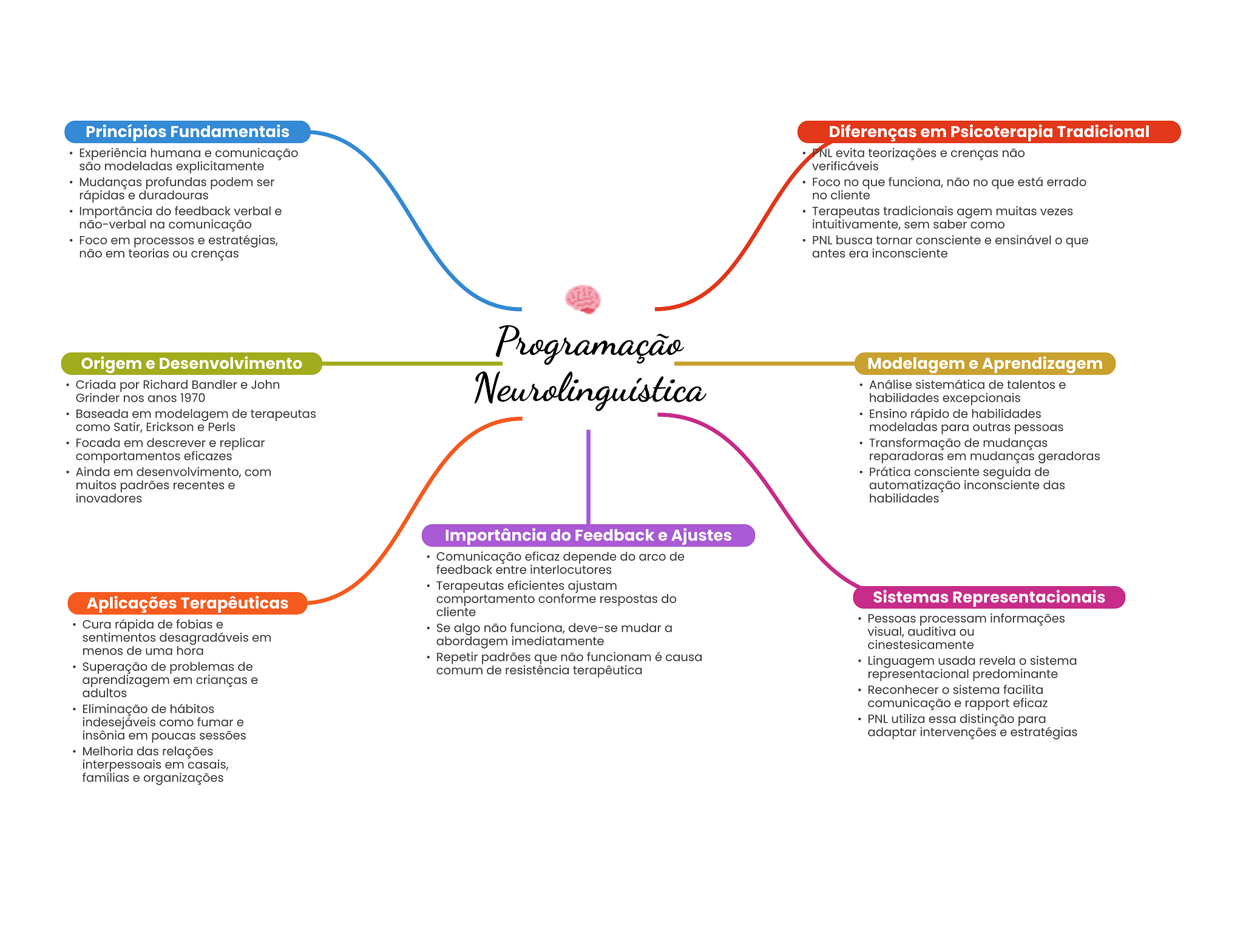 Princípios Fundamentais Diferenças em Psicoterapia Tradicional Experiência humana e comunicação NL evita teorizações e crenças não são modeladas explicitamente verificáveis Mudanças profundas podem ser Foco no que funciona, não no que está errado rápidas e duradouras no cliente Importância do feedback verbal e Terapeutas tradicionais agem muitas vezes não-verbal na comunicação intuitivamente, sem saber como Foco em processos e estratégias, PNL busca tornar consciente e ensinável que não em teorias ou crenças antes era inconsciente Programação Origem e Desenvolvimento Modelagem e Aprendizagem Criada por Richard Bandler e John Grinder nos anos 1970 Neurolinguística Análise sistemática de talentos e habilidades excepcionais Baseada em modelagem de terapeutas Ensino rápido de habilidades como Satir, Erickson e Perls modeladas para outras pessoas Focada em descrever e replicar Transformação de mudanças comportamentos eficazes reparadoras em mudanças geradoras Ainda em desenvolvimento, com Prática consciente seguida de muitos padrões recentes e automatização inconsciente das inovadores habilidades Importância do Feedback e Ajustes Comunicação eficaz depende do arco de feedback entre interlocutores Terapeutas eficientes ajustam Aplicações Terapêuticas comportamento conforme respostas do Sistemas Representacionais cliente Cura rápida de fobias e Pessoas processam informações Se algo não funciona, deve-se mudar a sentimentos desagradáveis em visual, auditiva ou abordagem imediatamente menos de uma hora cinestesicamente Repetir padrões que não funcionam é causa Superação de problemas de Linguagem usada revela sistema comum de resistência terapêutica aprendizagem em crianças e representacional predominante adultos Reconhecer sistema facilita Eliminação de hábitos comunicação e rapport eficaz indesejáveis como fumar e PNL utiliza essa distinção para insônia em poucas sessões adaptar intervenções e estratégias Melhoria das relações interpessoais em casais, famílias e organizações
