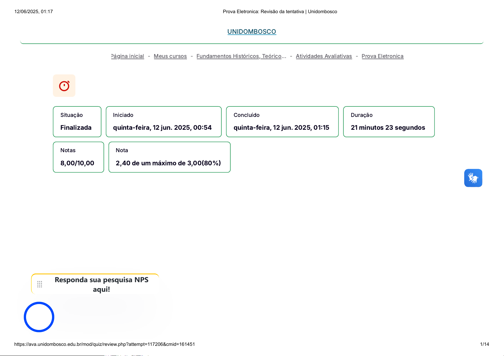 - - - - Situação Finalizada Iniciado quinta-feira, 12 jun. 2025, 00:54 Concluído quinta-feira, 12 jun. 2025, 01:15 Duração 21 minutos 23 segundos Notas 8,00/10,00 Nota 2,40 de um máximo de 3,00(80%) Página inicial Meus cursos Fundamentos Históricos, Teórico… Atividades Avaliativas Prova Eletronica Responda sua pesquisa NPS aqui! UNIDOMBOSCO 12/06/2025, 01:17 Prova Eletronica: Revisão da tentativa | Unidombosco https://ava.unidombosco.edu.br/mod/quiz/review.php?attempt=117206&cmid=161451 1/14 https://ava.unidombosco.edu.br/ https://ava.unidombosco.edu.br/my/courses.php https://ava.unidombosco.edu.br/course/view.php?id=9810 https://ava.unidombosco.edu.br/course/section.php?id=40316 https://ava.unidombosco.edu.br/mod/quiz/view.php?id=161451 https://ava.unidombosco.edu.br/ https://accessibility-widget.pages.dev/ Questão 1 Correto Atingiu 1,00 de 1,00 Marcar questão Em uma sociedade democrática obtemos diversos projetos societários. A inserção desta sociedade no modo de produção capitalista gera projetos societários classistas. Diante dessa afirmação assinale a alternativa correta: Escolha uma opção: a. Os projetos societários dentro da sociedade capitalistas se conversam entre si. Seus interesses múltiplos, porem todos se concentram nos interesses da classe trabalhadora. b. Atualmente os projetos societários se fundem e todos estão voltados aos interesses da classe trabalhadora. c. Os projetos societários na sociedade capitalista irão atender os interesses do capital, não havendo projetos societários de interesses da classe trabalhadora, visto que está se conforma com a exploração e dominação da classe burguesa d. Projetos societários que imprimam os interesses da classe trabalhadora, sofrerão resistência por aqueles que fomentam os interesses da classe burguesa e sua manutenção no poder. e. Os projetos societários inseridos em uma sociedade capitalista,se percebe em projetos de classes, sendo conflitantes entre si. Porem o Serviço Social como projeto profissional tem o dever de amenizar os conflitos atendendo aos interesses da classe burguesa e garantindo que os projetos societários vinculados ao capital sejam alcançados. UNIDOMBOSCO 12/06/2025, 01:17 Prova Eletronica: Revisão da tentativa | Unidombosco https://ava.unidombosco.edu.br/mod/quiz/review.php?attempt=117206&cmid=161451 2/14 https://ava.unidombosco.edu.br/ https://accessibility-widget.pages.dev/ UNIDOMBOSCO 12/06/2025, 01:17 Prova Eletronica: Revisão da tentativa | Unidombosco https://ava.unidombosco.edu.br/mod/quiz/review.php?attempt=117206&cmid=161451 3/14 https://ava.unidombosco.edu.br/ https://accessibility-widget.pages.dev/ Questão 2 Correto Atingiu 1,00 de 1,00 Marcar questão O objeto real, o aparente, precisa a de um processo de construção do conhecimento para se chegar a totalidade. O movimento para a construção do conhecimento se dá para alem daquilo que é aparente, levando ao concreto abstrato e por fim ao concreto pensado. Para sairmos da aparência e chegarmos à essência dos fenômenos sociais este se dá através de mediações. Assinale a alternativa correta Escolha uma opção: a. O método da aparência b. O método do abstrato c. O método dialetico hegeliano d. O método histórico dialético de Marx e. O método do concreto pensado UNIDOMBOSCO 12/06/2025, 01:17 Prova Eletronica: Revisão da tentativa | Unidombosco https://ava.unidombosco.edu.br/mod/quiz/review.php?attempt=117206&cmid=161451 4/14 https://ava.unidombosco.edu.br/ https://accessibility-widget.pages.dev/ Questão 3 Incorreto Atingiu 0,00 de 1,00 Marcar questão A partir da intenção de ruptura, a aproximação com a teoria social critica de Marx e mediante as discussões já propostas no Congresso da Virada, a categoria profissional debateu sobre um novo currículo mínimo. Sendo este deferido pelo antigo CFASS ( atual CFESS) em: Escolha uma opção: a. 1979 b. 1983 c. 1982 d. 1988 e. 1986 UNIDOMBOSCO 12/06/2025, 01:17 Prova Eletronica: Revisão da tentativa | Unidombosco https://ava.unidombosco.edu.br/mod/quiz/review.php?attempt=117206&cmid=161451 5/14 https://ava.unidombosco.edu.br/ https://accessibility-widget.pages.dev/ Questão 4 Correto Atingiu 1,00 de 1,00 Marcar questão O projeto Etico Politico do Serviço Social perpassa por diversos momentos até sua fase de consolidação. A partir do movimento de reconceituação, a aproximação com a teoria social critica, possibilitaram a maturação e em conseqüência a consolidação do Projeto Etico Politico. Para fundamentar o projeto profissional, a partir de 1990 obtivemos 3 grandes legislações que foram fundamentais para a efetivação do Projeto Etico Politico. Assinale a alternativa correta Escolha uma opção: a. As legislações que contribuíram para a efetivação do Projeto Ético Político do Serviço Social o qual direciona e publiciza os interesses da categoria profissional para a sociedade é o tripé da Seguridade Social. b. As legislações que direcionam e complementam o Projeto Ético Politico são a criação da LOAS - Lei Organica do Assistente Social e Lei de regulamentação profissional e o Codigo de ética de 1993. c. As legislações que consolidam o Projeto Ético Politico profissional foram primeiramente a Constituição Federal de 1988 que garantiu novos espaços de atuação da profissão, a lei de regulamentação da Profissão e o Código de Ética já aprovado em 1986. UNIDOMBOSCO 12/06/2025, 01:17 Prova Eletronica: Revisão da tentativa | Unidombosco https://ava.unidombosco.edu.br/mod/quiz/review.php?attempt=117206&cmid=161451 6/14 https://ava.unidombosco.edu.br/ https://accessibility-widget.pages.dev/ d. As legislações que foram fundamentais para a consolidação do Projeto ÉticoPolitico do Serviço Social foram: Lei de regulamentação da profissão, Código de Etica alem das nova matrizes curriculares que foi aprovada em Assembleia pela categoria. e. As legislações que contribuíram para a efeti