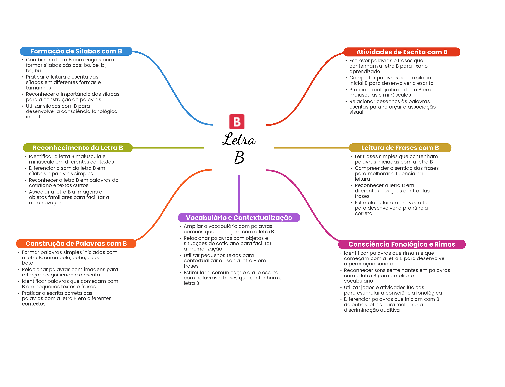 Formação de Sílabas com Atividades de Escrita com Combinar a letra com vogais para Escrever palavras e frases que formar sílabas básicas: ba, be, bi, contenham a letra B para fixar bo, bu aprendizado Praticar a leitura e escrita das Completar palavras com a sílaba sílabas em diferentes formas e inicial para desenvolver a escrita tamanhos Praticar a caligrafia da letra em Reconhecer a importância das sílabas maiúsculas e minúsculas para a construção de palavras Relacionar desenhos às palavras Utilizar sílabas com para escritas para reforçar a associação desenvolver a consciência fonológica visual inicial B Letra da Letra B Leitura de Frases com Identificar a letra maiúscula e Ler frases simples que contenham minúscula em diferentes contextos palavras iniciadas com a letra Diferenciar som da letra em Compreender sentido das frases sílabas e palavras simples para melhorar a fluência na Reconhecer a letra em palavras do leitura cotidiano e textos curtos Reconhecer a letra B em Associar a letra a imagens e diferentes posições dentro das objetos familiares para facilitar a frases aprendizagem Estimular a leitura em alta para desenvolver a pronúncia correta Vocabulário e Contextualização Ampliar vocabulário com palavras comuns que começam com a letra Relacionar palavras com objetos e Construção de Palavras com situações do cotidiano para facilitar Consciência Fonológica e Rimas a memorização Formar palavras simples iniciadas com a letra B, como bola, bebê, bico, Utilizar pequenos textos para Identificar palavras que rimam e que bota contextualizar O uso da letra B em começam com a letra para desenvolver frases a percepção sonora Relacionar palavras com imagens para Estimular a comunicação oral e escrita Reconhecer sons semelhantes em palavras reforçar significado e a escrita com palavras e frases que contenham a com a letra B para ampliar Identificar palavras que começam com letra vocabulário em pequenos textos e frases Utilizar jogos e atividades lúdicas Praticar a escrita correta das para estimular a consciência fonológica palavras com a letra em diferentes Diferenciar palavras que iniciam com contextos de outras letras para melhorar a discriminação auditiva