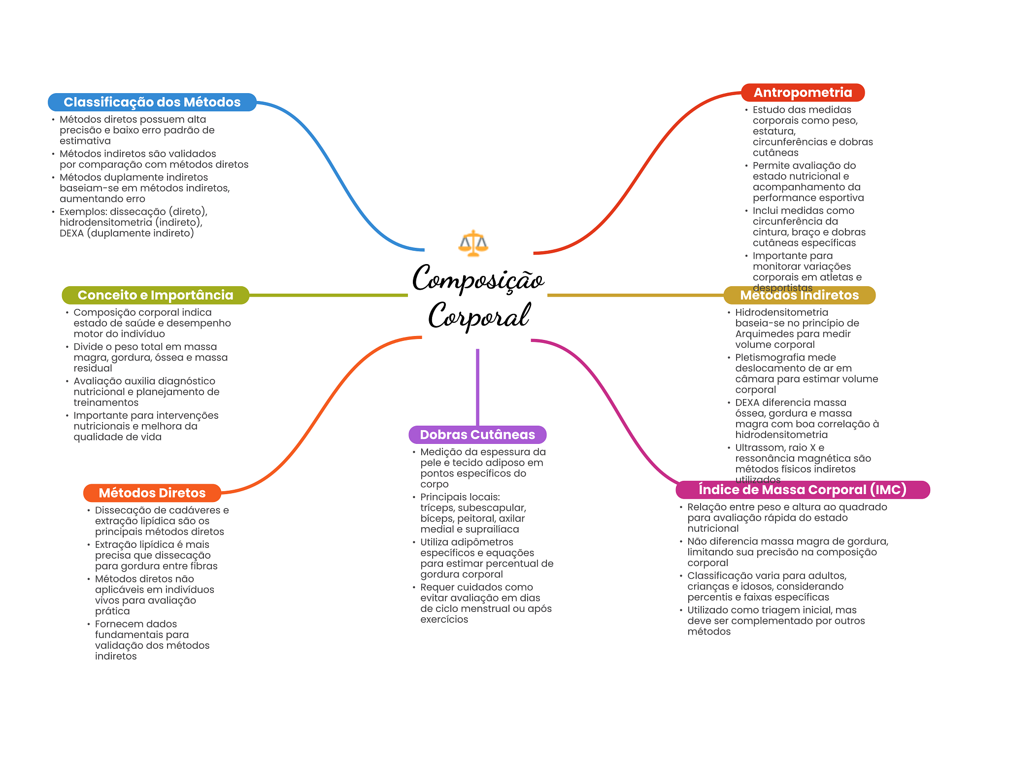Antropometria Classificação dos Métodos Estudo das medidas Métodos diretos possuem alta corporais como peso, precisão e baixo erro padrão de estatura, estimativa circunferências e dobras Métodos indiretos são validados cutâneas por comparação com métodos diretos Permite avaliação do Métodos duplamente indiretos estado nutricional e baseiam-se em métodos indiretos, acompanhamento da aumentando erro performance esportiva Exemplos: dissecação (direto), Inclui medidas como (indireto), circunferência da DEXA (duplamente indireto) cintura, braço e dobras cutâneas específicas Importante para monitorar variações Composição corporais em atletas e Conceito e Importância Metodos desportistas Indiretos Composição corporal indica Corporal Hidrodensitometric estado de saúde e desempenho baseia-se no princípio de motor do indivíduo Arquimedes para medir Divide peso total em massa volume corporal magra, gordura, óssea e massa Pletismografia mede residual deslocamento de ar em Avaliação auxilia diagnóstico câmara para estimar volume nutricional e planejamento de corporal treinamentos DEXA diferencia massa Importante para intervenções óssea, gordura e massa nutricionais e melhora da magra com boa correlação à qualidade de vida Dobras Cutâneas hidrodensitometric Medição da espessura da Ultrassom, raio X e pele e tecido adiposo em ressonância magnética são pontos específicos do métodos físicos indiretos utilizados corpo Métodos Diretos Indice de Massa Corporal (IMC) Principais locais: Dissecação de cadáveres e tríceps, subescapular, Relação entre peso e altura ao quadrado extração lipídica são bíceps, peitoral, axilar para avaliação rápida do estado principais métodos diretos medial e suprailíaca nutricional Extração lipídica é mais Utiliza adipômetros Não diferencia massa magra de gordura, precisa que dissecação específicos e equações limitando sua precisão na composição para gordura entre fibras para estimar percentual de corporal Métodos diretos não gordura corporal Classificação varia para adultos, aplicáveis em indivíduos Requer cuidados como crianças e idosos, considerando vivos para avaliação evitar avaliação em dias percentis e faixas específicas prática de ciclo menstrual ou após Utilizado como triagem inicial, mas Fornecem dados exercícios deve ser complementado por outros fundamentais para métodos validação dos métodos indiretos