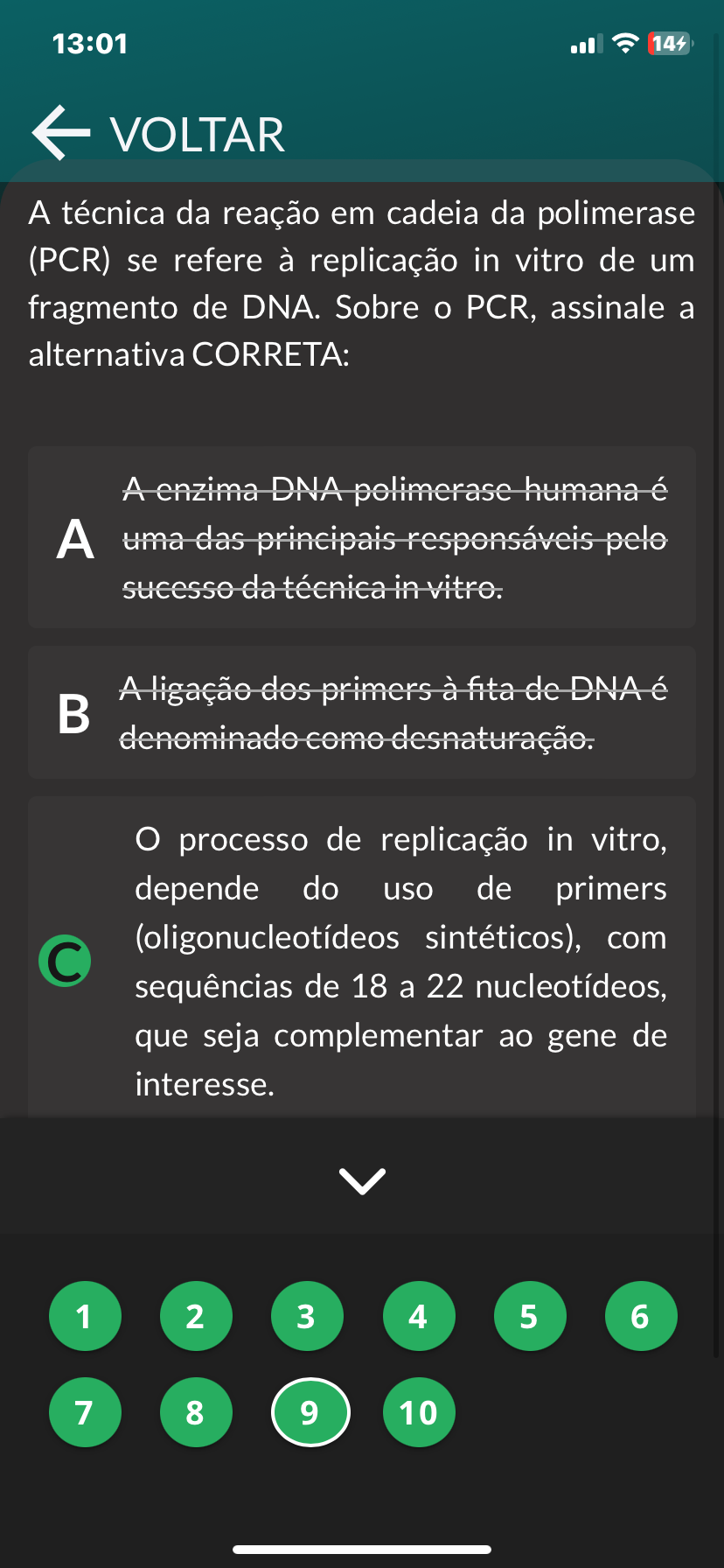 13:01 144 VOLTAR A técnica da reação em cadeia da polimerase (PCR) se refere à replicação in vitro de um fragmento de DNA. Sobre PCR, assinale a alternativa CORRETA: A enzima DNA polimerase humana é A uma das principais responsáveis pelo sucesso da técnica in vitro. A ligação dos primers à fita de DNA é denominado como desnaturação. processo de replicação in vitro, depende do uso de primers (oligonucleotídeos sintéticos), com sequências de 18 a 22 nucleotídeos, que seja complementar ao gene de interesse. 1 2 3 4 5 6 7 8 9 10