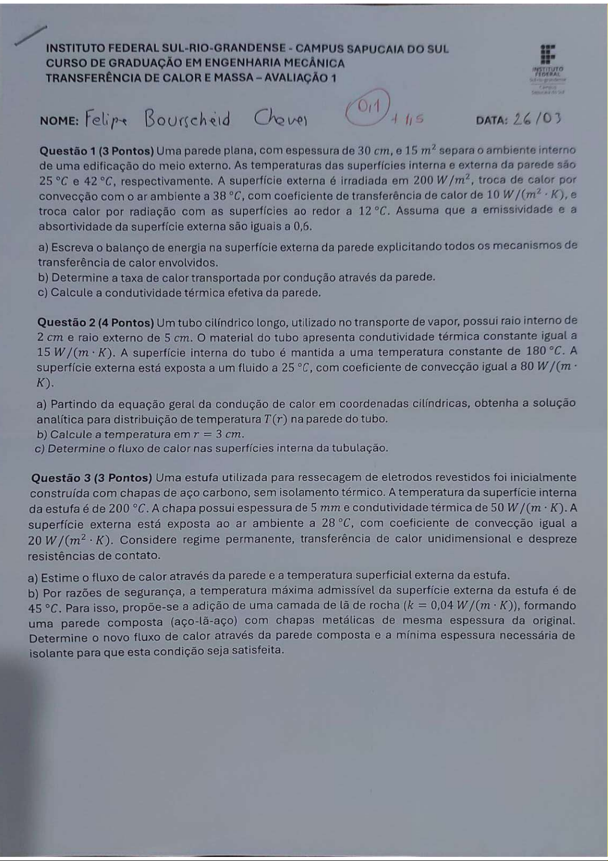 INSTITUTO FEDERAL SUL-RIO-GRANDENSE CAMPUS SAPUCAIA DO SUL CURSO DE GRADUAÇÃO EM ENGENHARIA MECÂNICA INSTITUTO TRANSFERÊNCIA DE CALOR E MASSA AVALIAÇÃO 1 FEDERAL NOME: Felipe Bourscheid DATA: Questão 1 (3 Pontos) Uma parede plana, com espessura de 30 cm, e 15 m² separa ambiente interno de uma edificação do meio externo. As temperaturas das superfícies interna e externa da parede são 25 °C e respectivamente. A superfície externa é irradiada em 200 troca de calor por convecção com o ar ambiente a 38 °C, com coeficiente de transferência de calor de 10 K), e troca calor por radiação com as superfícies ao redor a 12 Assuma que a emissividade e a absortividade da superfície externa são iguais a 0,6. a) Escreva o balanço de energia na superfície externa da parede explicitando todos os mecanismos de transferência de calor envolvidos. b) Determine a taxa de calor transportada por condução através da parede. c) Calcule a condutividade térmica efetiva da parede. Questão 2 (4 Pontos) Um tubo cilíndrico longo, utilizado no transporte de vapor, possui raio interno de 2 cm e raio externo de 5 material do tubo apresenta condutividade térmica constante igual a 15 W/(m K). A superfície interna do tubo é mantida a uma temperatura constante de 180 A superfície externa está exposta a um fluido a 25 °C, com coeficiente de convecção igual a 80 W/(m K). a) Partindo da equação geral da condução de calor em coordenadas cilíndricas, obtenha a solução analítica para distribuição de temperatura T(r) na parede do tubo. b) Calcule a temperatura em r = 3 c) Determine fluxo de calor nas superfícies interna da tubulação. Questão 3 (3 Pontos) Uma estufa utilizada para ressecagem de eletrodos revestidos foi inicialmente construída com chapas de aço carbono, sem isolamento térmico. A temperatura da superfície interna da estufa é de 200 °C. A chapa possui espessura de 5 mm e condutividade térmica de 50 W/(m K). A superfície externa está exposta ao ar ambiente a com coeficiente de convecção igual a 20 K). Considere regime permanente, transferência de calor unidimensional e despreze resistências de contato. a) Estime o fluxo de calor através da parede e a temperatura superficial externa da estufa. b) Por razões de segurança, a temperatura máxima admissível da superfície externa da estufa é de 45 °C. Para isso, propõe-se a adição de uma camada de lã de rocha (k = 0,04 W/(m K)), formando uma parede composta (aço-lã-aço) com chapas metálicas de mesma espessura da original. Determine o novo fluxo de calor através da parede composta e a mínima espessura necessária de isolante para que esta condição seja satisfeita.