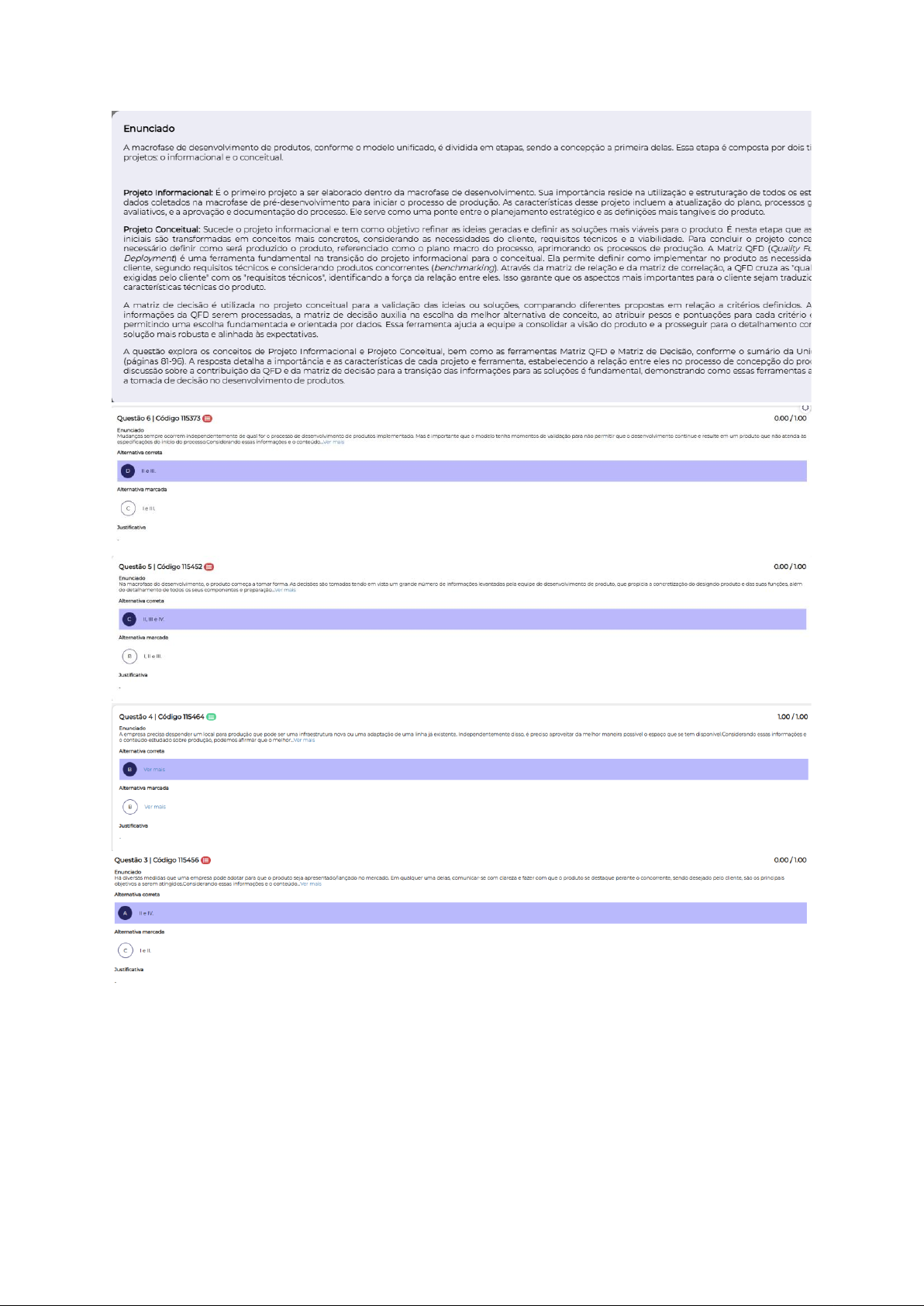 Enunciado A macrofase de desenvolvimento de produtos, conforme modelo unificado, é dividida em etapas, sendo a concepção a primeira delas. Essa etapa é composta por dois ti projetos: informacional e conceitual. Projeto Informacional: É primeiro projeto a ser elaborado dentro da macrofase de Sua importância reside na utilização e estruturação de todos est dados coletados na macrofase de pré-desenvolvimento para iniciar o processo de produção. As características desse projeto incluem a atualização do plano, processos g avaliativos, e a aprovação e documentação do processo. Ele serve como uma ponte entre planejamento estratégico e as definições mais tangíveis do produto. Projeto Conceitual: Sucede projeto informacional e tem como objetivo refinar as ideias geradas e definir as soluções mais viáveis para produto. É nesta etapa que as iniciais são transformadas em conceitos mais concretos, considerando as necessidades do cliente, requisitos técnicos e a viabilidade. Para concluir projeto conce necessário definir como será produzido o produto, referenciado como o plano macro do processo, aprimorando processos de produção. A Matriz QFD (Quality Deployment) é uma ferramenta fundamental na transição do projeto informacional para conceitual. Ela permite definir como implementar no produto as necessida cliente, segundo requisitos técnicos e considerando produtos concorrentes (benchmarking). Através da matriz de relação e da matriz de correlação, a QFD cruza as "qual exigidas pelo cliente" com "requisitos técnicos", identificando a força da relação entre eles. Isso garante que aspectos mais importantes para cliente sejam traduzic características técnicas do produto. A matriz de decisão é utilizada no projeto conceitual para a validação das ideias ou soluções, comparando diferentes propostas em relação a critérios definidos. A informações da QFD serem processadas, a matriz de decisão auxilia na escolha da melhor alternativa de conceito, ao atribuir pesos e pontuações para cada critério permitindo uma escolha fundamentada e orientada por dados. Essa ferramenta ajuda a equipe a consolidar a visão do produto e a prosseguir para detalhamento cor solução mais robusta e alinhada às expectativas. A questão explora os conceitos de Projeto Informacional e Projeto Conceitual, bem como as ferramentas Matriz QFD e Matriz de Decisão, conforme o sumário da Uni (páginas 81-96). A resposta detalha a importância e as características de cada projeto e ferramenta, estabelecendo a relação entre eles no processo de concepção do discussão sobre a contribuição da QFD e da matriz de decisão para a transição das informações para as soluções é fundamental, demonstrando como essas ferramentas a a tomada de decisão no desenvolvimento de produtos. Questão 6 Código 115373 Enunciado Mudanças sempre ocorrem de qual for processo de desenvolviment de produtos implementado Mas importante que modelo tenha momentos de validação para não permitir que desenvolvimento continue resulte em um produto que não atenda as especificações do inicio do processo.Considerando essas informações Ver mais Alternativa correta D Alternativa marcada Justificativa Questão 5 Código 115452 0.00/1.00 Enunciado Na macrofase do produto começa tomar forma As decisões são tomadas tendo em vista um grande de informações levantadas pela equipe de desenvolvimento de que concretização do designdo produto das suas além do detalhamento de todos seus componentes Ver mais Alternativa correta Alternativa marcada Justificativa Questão 4 Código 115464 1.00/1.00 Enunciado empresa precisa despender um local para produção que pode ser uma infraestrutura nova ou uma adaptação de uma linha já Independentemente disso, preciso aproveitar da melhor maneira espaço que se tem Considerando essas informações estudado sobre produção, podemos afirmar que melhor. mais Alternativa correta Alternativa marcada Ver Justificativa Questão 3 Código 115456 Enunciado diversas medidas que uma empresa pode adotar para que produto seja apresentado/lançado no Em qualquer uma delas comunicar se com clareza fazer com que produto se destaque perante sendo desejado pelo são principais objetivos serem Considerando essas informações Ver mais Alternativa correta A Alternativa marcada JustificativaQuestão 21 Código 115413 1.00/1.00 Enunciado Apesar de vários já terem sido analisados no planejamento estratégico do portfólio, quando produto entrar na etapa do planejamento do projeto do produto passará por um percurso em que novas verificações e um aprofundamento dessas análises serão feitas para minimizar riscos do Considerando essas informações e mais Alternativa correta Uma maneira de fazer a estrutura analitica do projeto é em Alternativa marcada C Uma maneira de fazer a estrutura analitica do projeto é em niveis Justificativa Questão Código 115406 Enunciado Leia trecho a seguir:"Ela [a ferramenta Análise da Oportunidade de Negócio] é útil para guiar empreendedor para refletir sobre suas vontades e necessidades e relacioná-las a aspectos internos e externos do de nada adianta ter uma boa ideia de negócio, mas não querer trabalhar exatamente...Ver mais Alternativa correta A asserção uma proposição verdadeira ea é uma proposição falsa. Alternativa marcada E As asserções le são proposições verdadeiras, mas a não é uma justificativa correta da Justificativa