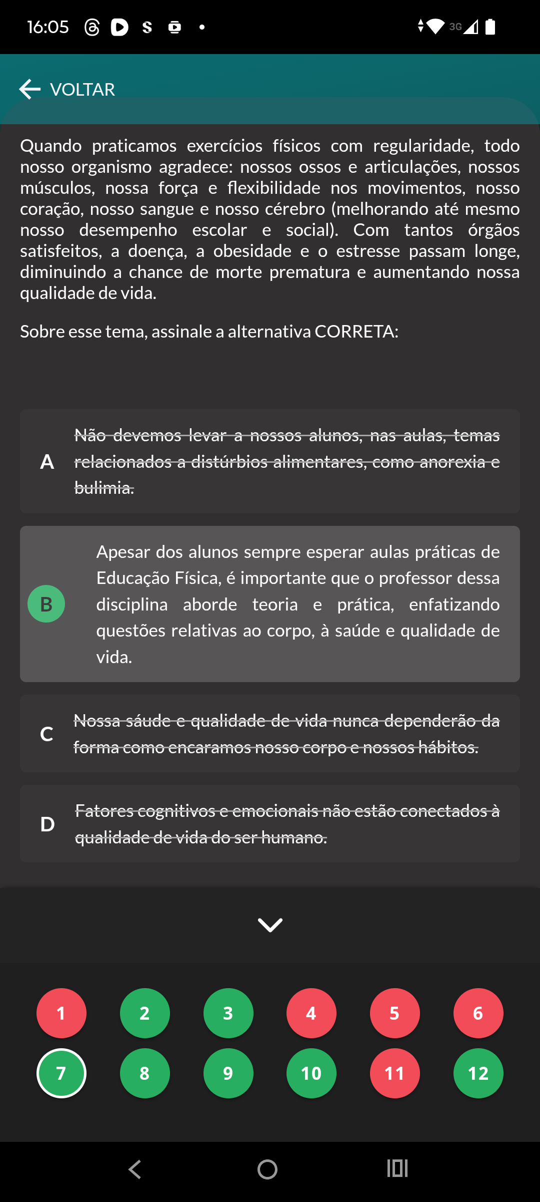 16:05 S 3G VOLTAR Quando praticamos exercícios físicos com regularidade, todo nosso organismo agradece: nossos ossos e articulações, nossos músculos, nossa força e flexibilidade nos movimentos, nosso coração, nosso sangue e nosso cérebro (melhorando até mesmo nosso desempenho escolar e social). Com tantos órgãos satisfeitos, a doença, a obesidade e estresse passam longe, diminuindo a chance de morte prematura e aumentando nossa qualidade de vida. Sobre esse tema, assinale a alternativa CORRETA: Não devemos levar a nossos alunos, nas aulas, temas relacionados a distúrbios alimentares, como anorexia e bulimia. Apesar dos alunos sempre esperar aulas práticas de Educação Física, é importante que professor dessa disciplina aborde teoria e prática, enfatizando questões relativas ao corpo, à saúde e qualidade de vida. Nossa sáude e qualidade de vida nunca dependerão da c forma como encaramos nosso corpo e nossos hábitos. Fatores cognitivos e emocionais não estão conectados à D qualidade de vida do ser humano. 1 2 3 4 5 6 7 8 9 10 11 12
