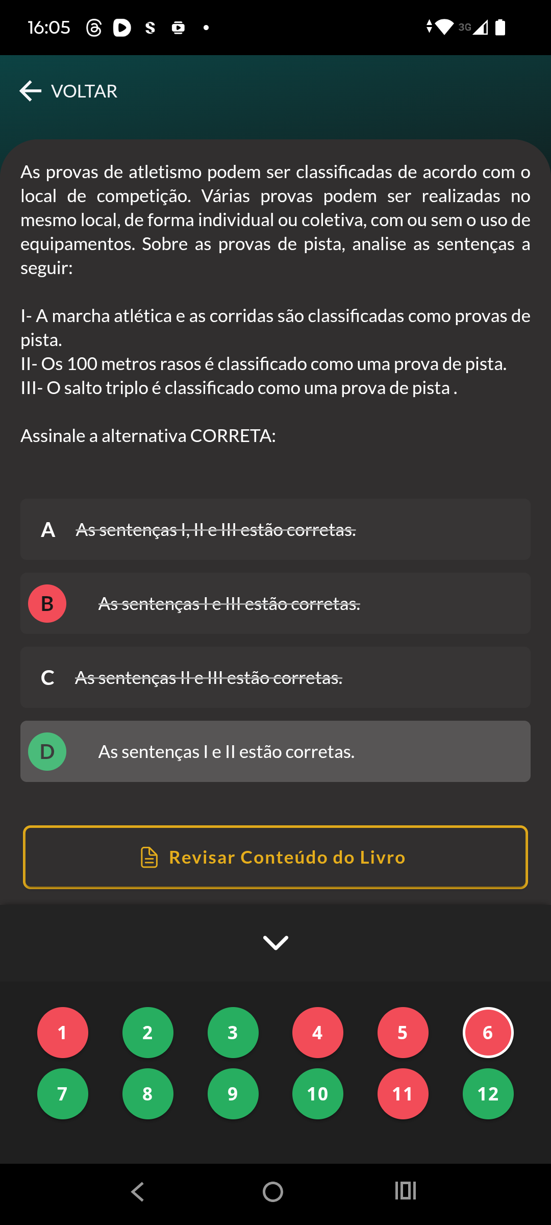 16:05 a S . 3G VOLTAR As provas de atletismo podem ser classificadas de acordo com o local de competição. Várias provas podem ser realizadas no mesmo local, de forma individual ou coletiva, com ou sem uso de equipamentos. Sobre as provas de pista, analise as sentenças a seguir: I- A marcha atlética e as corridas são classificadas como provas de pista. II- Os 100 metros rasos é classificado como uma prova de pista. III- salto triplo é classificado como uma prova de pista Assinale a alternativa CORRETA: As sentenças I, estão corretas. B As sentenças le estão corretas. c As sentenças estão corretas. D As sentenças e estão corretas. Revisar Conteúdo do Livro 1 2 3 4 5 6 7 8 9 10 11 12