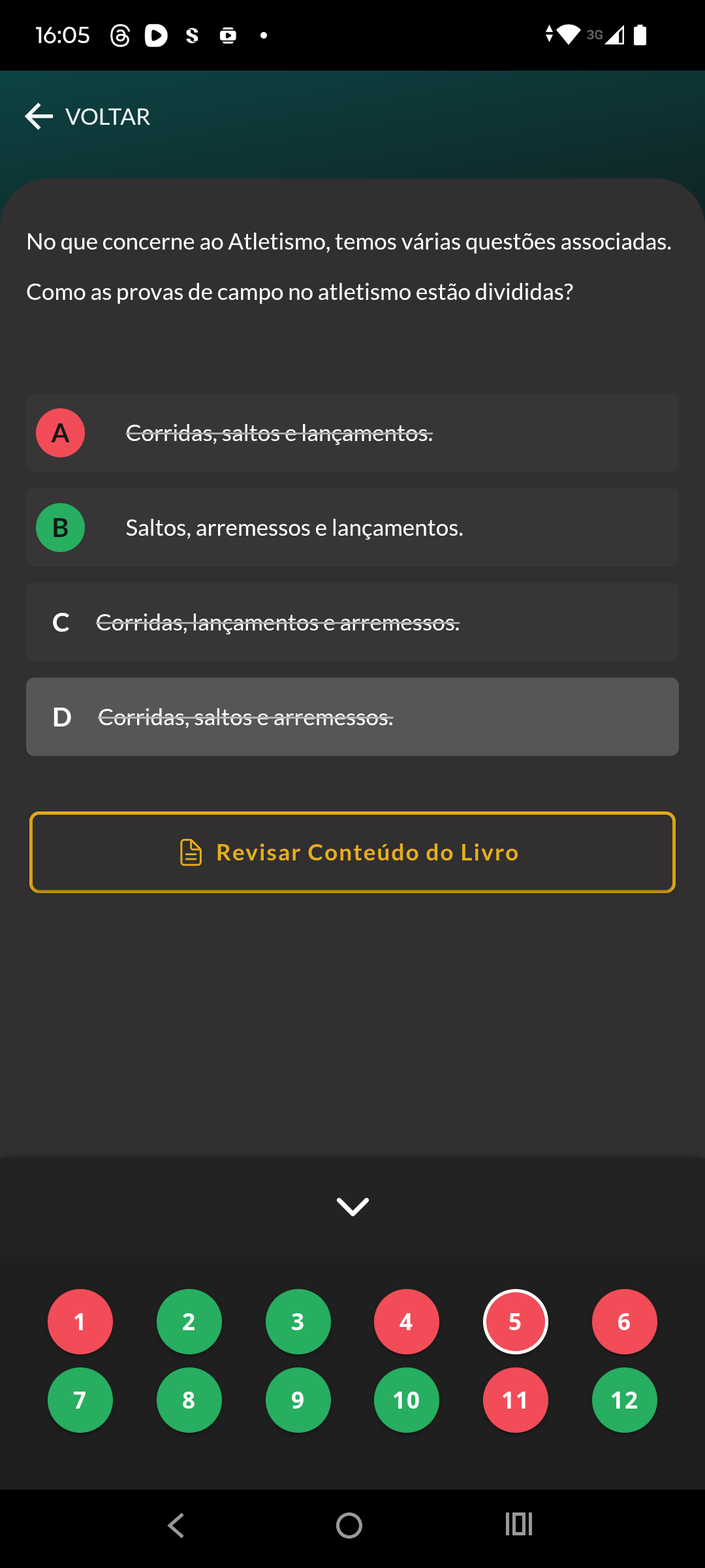 16:05 S . 3G VOLTAR No que concerne ao Atletismo, temos várias questões associadas. Como as provas de campo no atletismo estão divididas? A Corridas, saltos e lançamentos. B Saltos, arremessos e lançamentos. c Corridas, lançamentos e arremessos. D Corridas, saltos e arremessos. Revisar Conteúdo do Livro 1 2 3 4 5 6 7 8 9 10 11 12