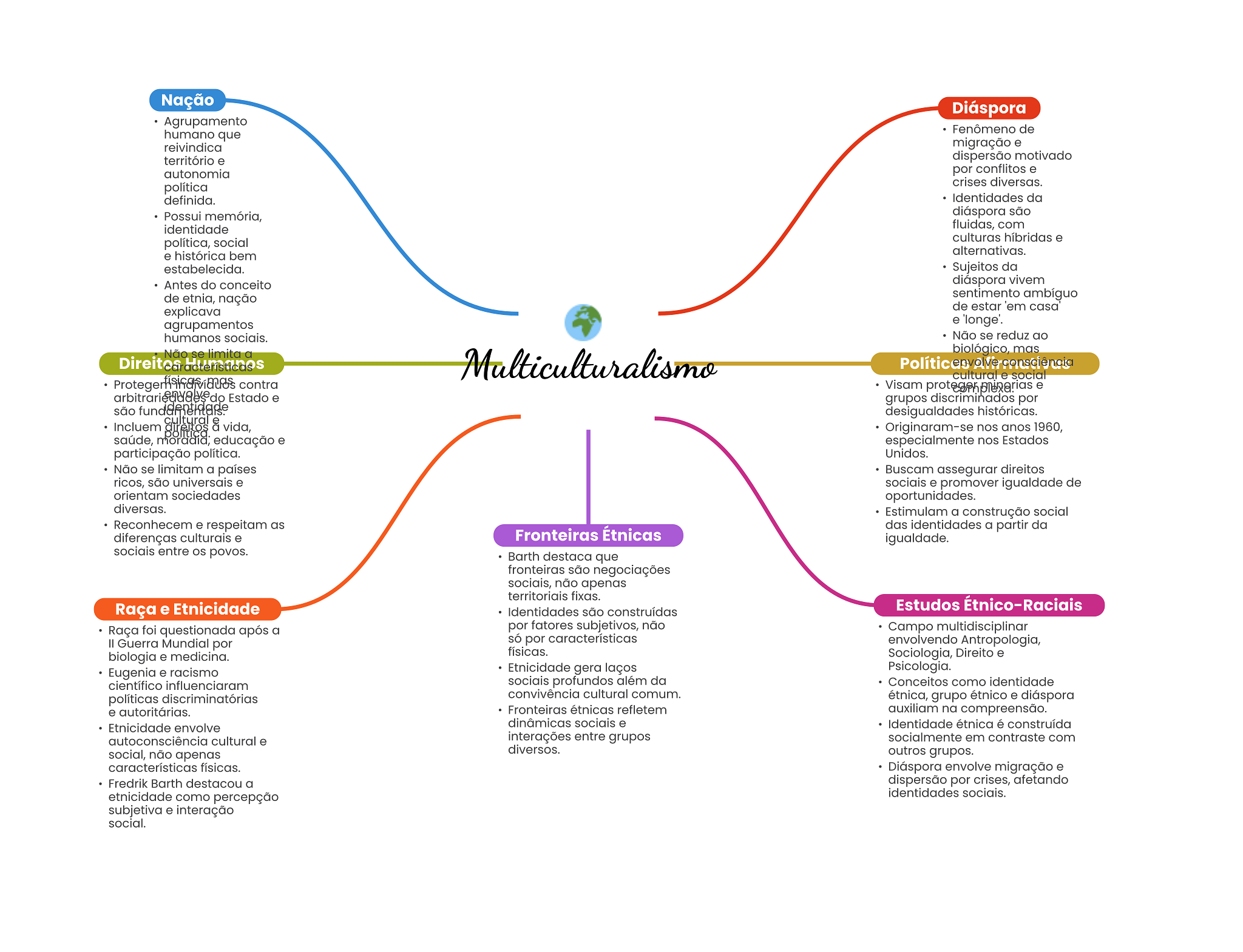 Nação Diáspora Agrupamento Fenômeno de humano que reivindica migração e território e dispersão motivado autonomia por conflitos e crises diversas. política definida. Identidades da Possui memória, diáspora são identidade fluidas, com política, social culturas híbridas e e histórica bem alternativas. estabelecida. Sujeitos da Antes do conceito diáspora vivem de etnia, nação sentimento ambíguo de estar casa explicava agrupamentos e 'longe'. humanos sociais. Não se reduz ao Não se limita biológico, mas Direitos Humanos Multiculturalismo consciência cultural e social contra Visam proteger e do Estado e grupos discriminados por são desigualdades históricas. Incluem direitos & vida, cultural Originaram-se nos anos 1960, saúde, educação e especialmente nos Estados participação política. Unidos. Não se limitam a países Buscam assegurar direitos ricos, são universais e sociais e promover igualdade de orientam sociedades oportunidades. diversas. Estimulam a construção social Reconhecem e respeitam as das identidades a partir da diferenças culturais e Fronteiras Étnicas igualdade. sociais entre os povos. Barth destaca que fronteiras são negociações sociais, não apenas territoriais fixas. Raça e Etnicidade Estudos Étnico-Raciais Identidades são construídas Raça foi questionada após a por fatores subjetivos, não Campo multidisciplinar II Guerra Mundial por só por características envolvendo Antropologia, biologia e medicina. físicas. Sociologia, Direito e Eugenia e racismo Etnicidade gera laços Psicologia. científico influenciaram sociais profundos além da Conceitos como identidade políticas discriminatórias convivência cultural comum. étnica, grupo étnico e diáspora e autoritárias. Fronteiras étnicas refletem auxiliam na compreensão. Etnicidade envolve dinâmicas sociais e Identidade étnica é construída autoconsciência cultural e interações entre grupos socialmente em contraste com social, não apenas diversos. outros grupos. características físicas. Diáspora envolve migração e Fredrik Barth destacou a dispersão por crises, afetando etnicidade como percepção identidades sociais. subjetiva e interação social.