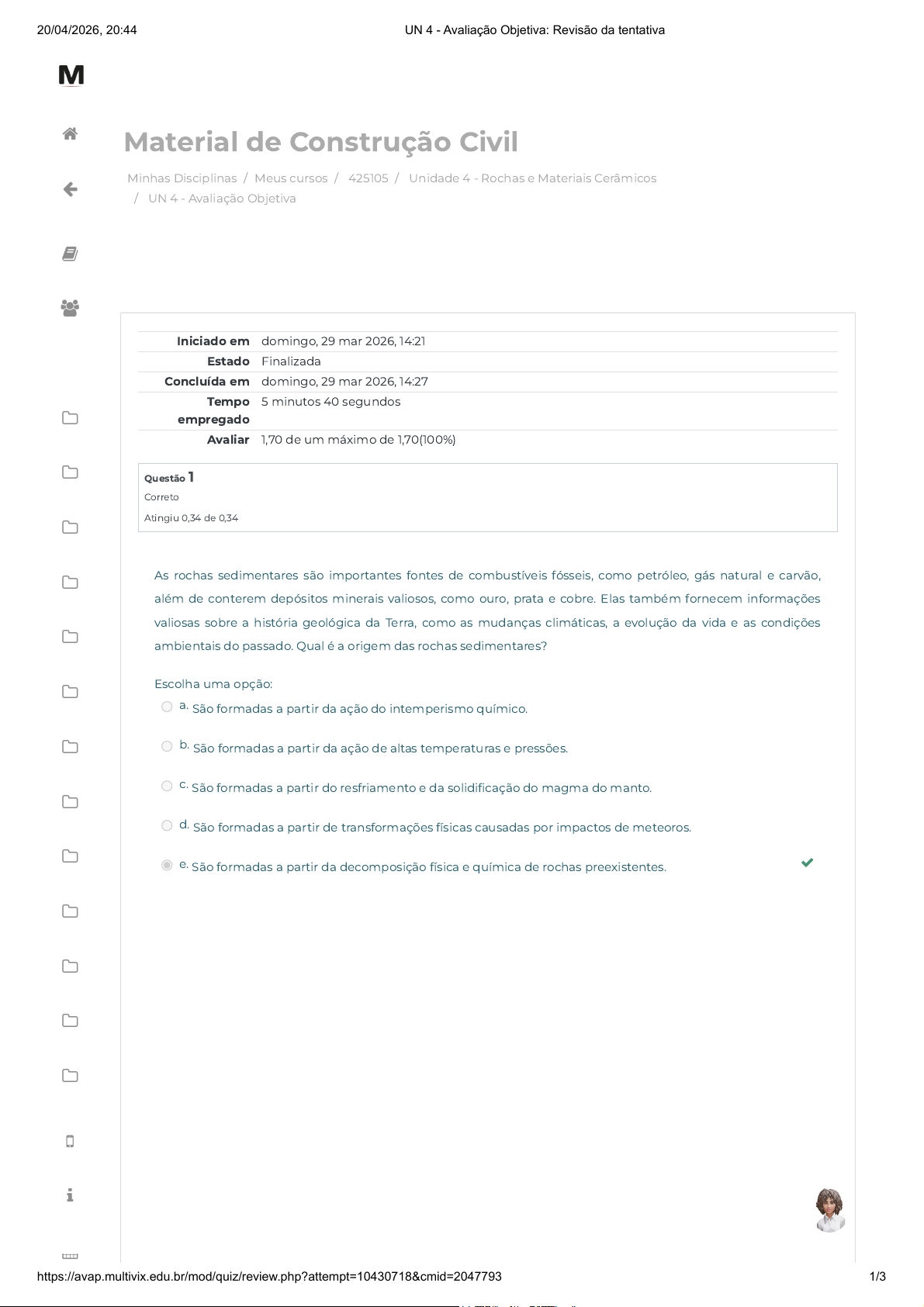 Minhas Disciplinas / Meus cursos / 425105 / Unidade 4 - Rochas e Materiais Cerâmicos / UN 4 - Avaliação Objetiva Material de Construção Civil Iniciado em domingo, 29 mar 2026, 14:21 Estado Finalizada Concluída em domingo, 29 mar 2026, 14:27 Tempo empregado 5 minutos 40 segundos Avaliar 1,70 de um máximo de 1,70(100%) Questão 1 Correto Atingiu 0,34 de 0,34 As rochas sedimentares são importantes fontes de combustíveis fósseis, como petróleo, gás natural e carvão, além de conterem depósitos minerais valiosos, como ouro, prata e cobre. Elas também fornecem informações valiosas sobre a história geológica da Terra, como as mudanças climáticas, a evolução da vida e as condições ambientais do passado. Qual é a origem das rochas sedimentares? Escolha uma opção: a. São formadas a partir da ação do intemperismo químico. b. São formadas a partir da ação de altas temperaturas e pressões. c. São formadas a partir do resfriamento e da solidificação do magma do manto. d. São formadas a partir de transformações físicas causadas por impactos de meteoros. e. São formadas a partir da decomposição física e química de rochas preexistentes. 20/04/2026, 20:44 UN 4 - Avaliação Objetiva: Revisão da tentativa https://avap.multivix.edu.br/mod/quiz/review.php?attempt=10430718&cmid=2047793 1/3 https://avap.multivix.edu.br/my/ https://avap.multivix.edu.br/course/view.php?id=38946 https://avap.multivix.edu.br/course/view.php?id=38946§ion=5 https://avap.multivix.edu.br/mod/quiz/view.php?id=2047793 https://avap.multivix.edu.br/my/ https://avap.multivix.edu.br/course/view.php?id=38946 https://avap.multivix.edu.br/user/index.php?id=38946 https://avap.multivix.edu.br/course/view.php?id=38946§ion=1 https://avap.multivix.edu.br/course/view.php?id=38946§ion=2 https://avap.multivix.edu.br/course/view.php?id=38946§ion=3 https://avap.multivix.edu.br/course/view.php?id=38946§ion=4 https://avap.multivix.edu.br/course/view.php?id=38946§ion=5 https://avap.multivix.edu.br/course/view.php?id=38946§ion=6 https://avap.multivix.edu.br/course/view.php?id=38946§ion=7 https://avap.multivix.edu.br/course/view.php?id=38946§ion=8 https://avap.multivix.edu.br/course/view.php?id=38946§ion=9 https://avap.multivix.edu.br/course/view.php?id=38946§ion=10 https://avap.multivix.edu.br/course/view.php?id=38946§ion=11 https://avap.multivix.edu.br/course/view.php?id=38946§ion=12 https://avap.multivix.edu.br/course/view.php?id=38946§ion=13 https://avap.multivix.edu.br/hooks/portal/ https://avap.multivix.edu.br/mod/page/view.php?id=1252%2F%22%20target%3D%22_blank https://avap.multivix.edu.br/calendar/view.php/ https://avap.multivix.edu.br/ https://avap.multivix.edu.br/ https://avap.multivix.edu.br/ https://avap.multivix.edu.br/ Questão 2 Correto Atingiu 0,34 de 0,34 Questão 3 Correto Atingiu 0,34 de 0,34 A crosta terrestre é a camada mais superficial e externa da Terra, composta principalmente de rochas e minerais. Ela é formada por placas tectônicas que se movem lentamente, causando terremotos, vulcões e a formação de montanhas. A crosta terrestre é dividida em duas categorias: a crosta continental, que é mais espessa e composta de rochas ígneas, metamórficas e sedimentares, e a crosta oceânica, que é mais fina e predominantemente formada por basalto. Qual é o elemento mais abundante na crosta terrestre? Escolha uma opção: a. Ferro (Fe). b. Cálcio (Ca). c. Silício (Si). d. Oxigênio (O). e. Alumínio (Al). Os materiais cerâmicos são amplamente utilizados na construção civil devido à sua alta durabilidade, à resistência e ao baixo custo. Eles são utilizados em diversos produtos, como telhas, tijolos, pisos, revestimentos e elementos de decoração. As telhas cerâmicas, por exemplo, são um tipo de cobertura muito comum em construções residenciais e comerciais, pois oferecem proteção contra intempéries e são resistentes a altas temperaturas. Qual é a ordem correta das etapas de fabricação dos materiais cerâmicos de acordo com Bauer (2019)? Escolha uma opção: a. Preparação da matéria-prima, moldagem, queima, esfriamento, inspeção, extração da matéria-prima, estocagem, expedição. b. Extração da matéria-prima, preparação da matéria-prima, moldagem, secagem, queima, esfriamento, inspeção, estocagem, expedição. c. Queima, moldagem, preparação da matéria-prima, extração da matéria-prima, esfriamento, inspeção, estocagem, expedição, secagem. d. Estocagem, extração da matéria-prima, preparação da matéria-prima, moldagem, queima, esfriamento, inspeção, secagem, expedição. e. Inspeção, preparação da matéria-prima, moldagem, queima, esfriamento, extração da matéria-prima, estocagem, secagem, expedição. 20/04/2026, 20:44 UN 4 - Avaliação Objetiva: Revisão da tentativa https://avap.multivix.edu.br/mod/quiz/review.php?attempt=10430718&cmid=2047793 2/3 https://avap.multivix.edu.br/my/ https://avap.multivix.edu.br/course/view.php?id=38946 https://avap.multivix.edu.br/user/index.php?id=38946 https://avap.multivix.edu.br/course/view.php?id=38946§ion=1 https://avap.multivix.edu.br/course/view.php?id=38946§ion=2 https://avap.multivix.edu.br/course/view.php?id=38946§ion=3 https://avap.multivix.edu.br/course/view.php?id=38946§ion=4 https://avap.multivix.edu.br/course/view.php?id=38946§ion=5 https://avap.multivix.edu.br/course/view.php?id=38946§ion=6 https://avap.multivix.edu.br/course/view.php?id=38946§ion=7 https://avap.multivix.edu.br/course/view.php?id=38946§ion=8 https://avap.multivix.edu.br/course/view.php?id=38946§ion=9 https://avap.multivix.edu.br/course/view.php?id=38946§ion=10 https://avap.multivix.edu.br/course/view.php?id=38946§ion=11 https://avap.multivix.edu.br/course/view.php?id=38946§ion=12 https://avap.multivix.edu.br/course/view.php?id=38946§ion=13 https://avap.multivix.edu.br/hooks/portal/ https://avap.multivix.edu.br/mod/page/view.php?id=1252%2F%22%20target%3D%22_blank https://avap.multivix.