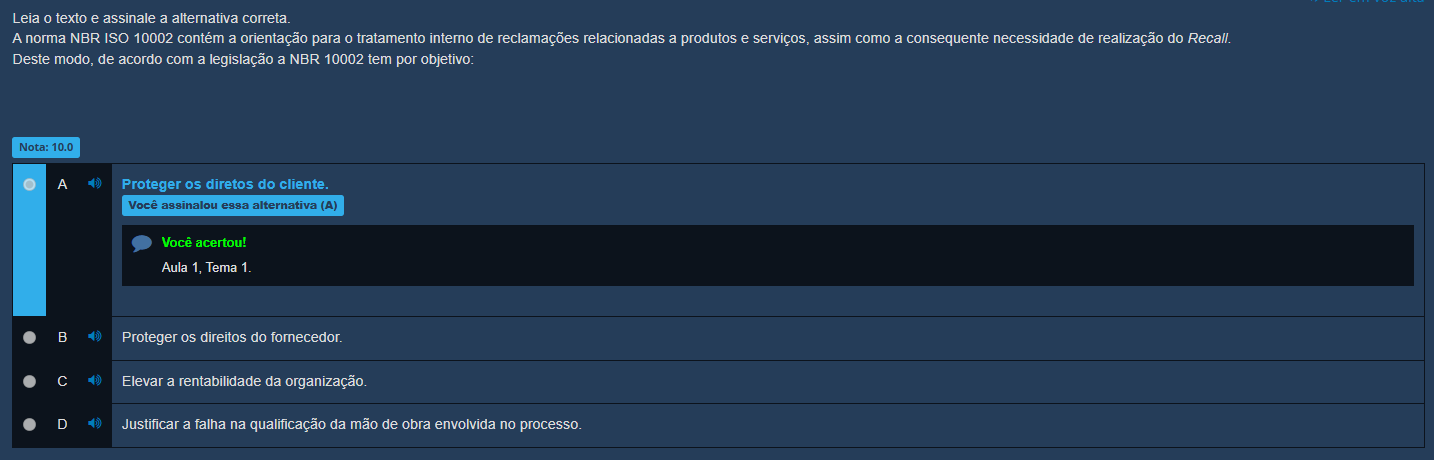 Leia 0 texto e assinale a alternativa correta. A norma NBR ISO 10002 contém a orientação para 0 tratamento interno de reclamações relacionadas a produtos e serviços, assim como a consequente necessidade de realização do Recall. Deste modo, de acordo com a legislação a NBR 10002 tem por objetivo: Nota: 10.0 A Proteger os diretos do cliente. Você assinalou essa alternativa (A) Você acertou! Aula 1, Tema 1. B Proteger direitos do fornecedor. C Elevar a rentabilidade da organização. D Justificar a falha na qualificação da mão de obra envolvida no processo.