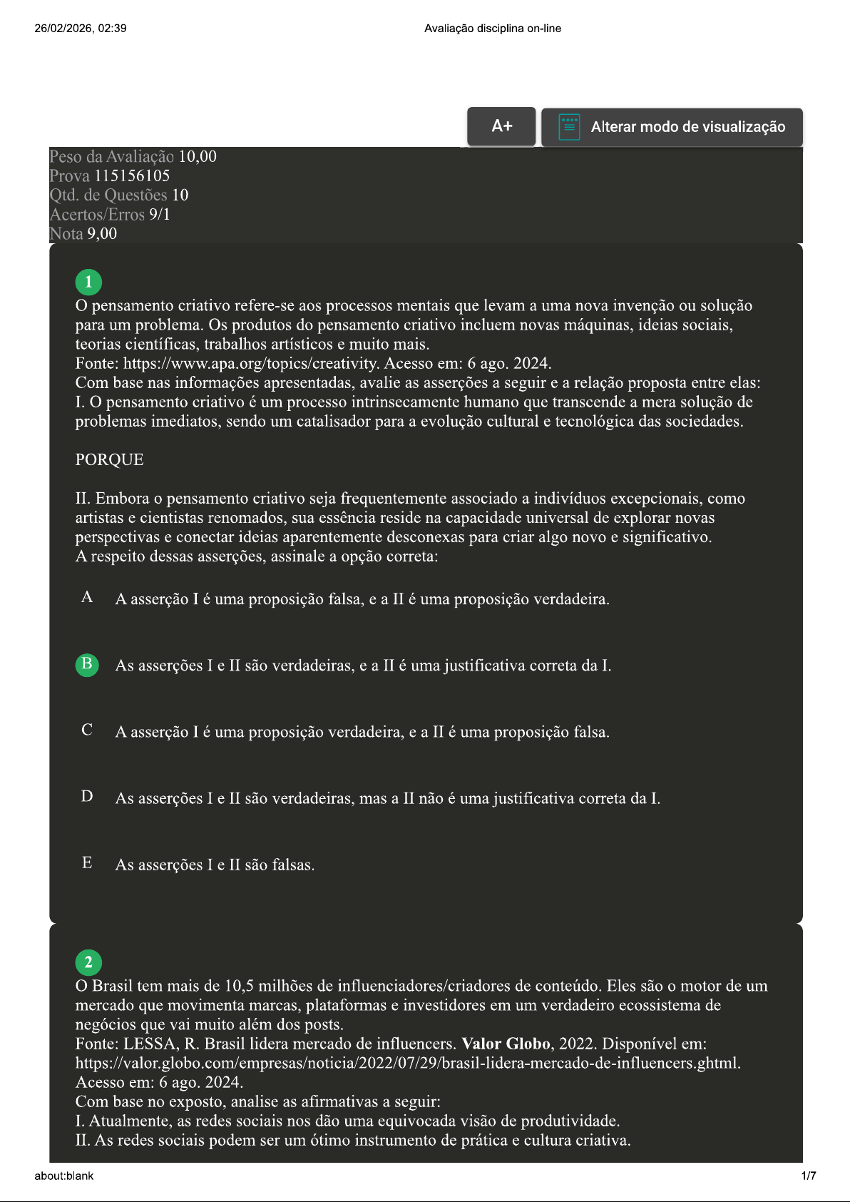 26/02/2026, 02:39 Avaliação disciplina on-line A+ Alterar modo de visualização Peso da Avaliação 10,00 Prova 115156105 Qtd. de Questões 10 Acertos/Erros 9/1 Nota 9,00 1 pensamento criativo refere-se aos processos mentais que levam a uma nova invenção ou solução para um problema. Os produtos do pensamento criativo incluem novas máquinas, ideias sociais, teorias científicas, trabalhos artísticos e muito mais. Fonte: https://www.apa.org/topics/creativity. Acesso em: 6 ago. 2024. Com base nas informações apresentadas, avalie as asserções a seguir e a relação proposta entre elas: I. pensamento criativo é um processo intrinsecamente humano que transcende a mera solução de problemas imediatos, sendo um catalisador para a evolução cultural e tecnológica das sociedades. PORQUE II. Embora o pensamento criativo seja frequentemente associado a indivíduos excepcionais, como artistas e cientistas renomados, sua essência reside na capacidade universal de explorar novas perspectivas e conectar ideias aparentemente desconexas para criar algo novo e significativo. A respeito dessas asserções, assinale a opção correta: A A asserção I é uma proposição falsa, e a II é uma proposição verdadeira. B As asserções I e II são verdadeiras, e a II é uma justificativa correta da I. A asserção I é uma proposição verdadeira, e a II é uma proposição falsa. D As asserções I e II são verdadeiras, mas a II não é uma justificativa correta da I. E As asserções I e II são falsas. 2 Brasil tem mais de 10,5 milhões de influenciadores/criadores de conteúdo. Eles são o motor de um mercado que movimenta marcas, plataformas e investidores em um verdadeiro ecossistema de negócios que vai muito além dos posts. Fonte: LESSA, R. Brasil lidera mercado de influencers. Valor Globo, 2022. Disponível em: https://valor.globo.com/empresas/noticia/2022/07/29/brasil-lidera-mercado-de-influencers.ghtml Acesso em: 6 ago. 2024. Com base no exposto, analise as afirmativas a seguir: I. Atualmente, as redes sociais nos dão uma equivocada visão de produtividade. II. As redes sociais podem ser um ótimo instrumento de prática e cultura criativa. about:blank 1/726/02/2026, 02:39 Avaliação disciplina on-line III. Os conteúdos postados em redes sociais são apenas um recorte da realidade e não refletem a real produtividade do criador. IV. Os criadores de conteúdo precisam usar da criatividade caso queiram se diferenciar e aumentar suas chances de negócios através das redes sociais. É correto o que se afirma em: A I, II, III e IV. B IV, apenas. I, II e III, apenas. D III e IV, apenas. E I e II, apenas. 3 As ações preditivas de mercado, embasadas em análises prospectivas, constituem um substrato vital para a tomada de decisões estratégicas no panorama econômico contemporâneo. Essas estratégias, intrinsecamente complexas, transcendem o mero escrutínio das tendências passadas, em favor de uma abordagem prospectiva, baseada em modelos estatísticos e algoritmos de aprendizado de máquina. Mediante a síntese de vastos conjuntos de dados e a aplicação de técnicas analíticas sofisticadas, tais ações buscam antecipar dinâmicas futuras dos mercados financeiros, delineando cenários plausíveis e identificando oportunidades latentes. Fonte: adaptado de: MARCONI, M. A.; LAKATOS, E. M. Técnicas de Pesquisa. 9. ed. São Paulo: Atlas, 2021. Com base nas informações apresentadas, avalie as asserções a seguir e a relação proposta entre elas: I. A utilização de ferramentas de pesquisa e inteligência artificial estão atreladas ao pensamento de antecipação. PORQUE II. As ferramentas foram desenvolvidas para enfatizar com precisão e celeridade os indicadores- chaves de negócios. A respeito dessas asserções, assinale a opção correta: A A asserção I é uma proposição falsa, e a II é uma proposição verdadeira. B As asserções I e II são falsas. As asserções I e II são verdadeiras, e a II é uma justificativa correta da I. D A asserção I é uma proposição verdadeira, e a II é uma proposição falsa. about:blank 2/726/02/2026, 02:39 Avaliação disciplina on-line E As asserções I e II são verdadeiras, mas a II não é uma justificativa correta da I. 4 A criatividade é a capacidade de utilizar recursos mentais para propor soluções e gerar novas possibilidades, não sendo sinônimo de inteligência, embora ambas possam atuar de forma complementar. Como explica Abrantes (2013), a inteligência fornece base cognitiva, mas a criatividade diz respeito à capacidade de imaginar, reinterpretar e transformar ideias, impactando desde tarefas cotidianas até grandes inovações. Fonte: ABRANTES, T. Os mitos de criatividade que muita gente segue e não deveria. Exame, 2013. Disponível em: deveria/. Acesso em 18 nov. 2025. Considerando esse entendimento, analise as afirmativas a seguir: I. A inteligência pode fornecer as bases cognitivas que apoiam o pensamento criativo, mas a criatividade é o que permite transformar essas capacidades em soluções originais e relevantes. II. A criatividade envolve mais do que resolver problemas; ela permite reimaginar situações, romper padrões e desenvolver inovações que vão além das soluções convencionais. III. A genialidade, frequentemente associada à criatividade, pode ser entendida como uma expressão extraordinária dessa capacidade, capaz de gerar novos paradigmas e transformar áreas do conhecimento. IV. A criatividade não se limita às artes ou à inovação tecnológica; ela está presente na vida diária e é fundamental para o progresso coletivo, ao ampliar as formas de pensar e agir. É correto o que se afirma em: A II, III e IV, apenas. B II e IV, apenas. I, II e IV, apenas. D I, II, III e IV. E I e II, apenas. 5 Para que um indivíduo desenvolva seu potencial criativo, é necessário ter a mentalidade certa, procurando aderir a algumas características e práticas geralmente percebidas em pessoas 