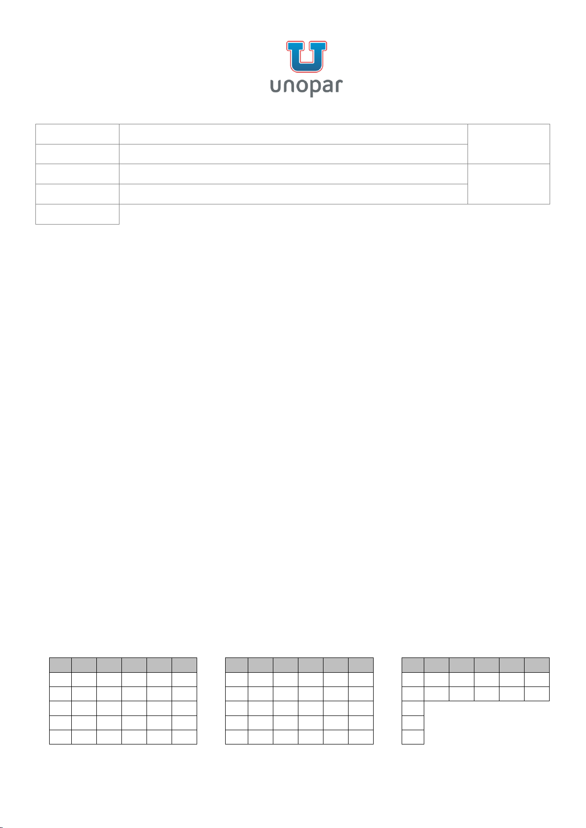 Disciplina: Clínica Integrada de Reabilitação Oral II Data 07/04/2026 Docente: Regis Jhonatan Brachtvogel Curso: Odontologia Nota Discente: Avaliação Oficial - 1º BIM | Valor: 1.000 pontos INSTRUÇÕES 1. Leia atentamente cada uma das questões; a interpretação é parte do processo de avaliação. 2. Não são permitidos consultas, empréstimos e comunicação, tampouco o uso de livros, celulares e equipamentos eletrônicos. 3. Os gabaritos devem ser preenchidos totalmente com caneta azul ou preta. Não são permitidas rasuras ou o uso de corretivo. 4. As notas serão publicadas no Portal do Aluno até a data especificada pelo Calendário Acadêmico. 5. O não comparecimento na vista de prova indica a concordância do aluno com a nota. O acadêmico terá até 48 horas para requerer revisão da avaliação, conforme Regimento Geral da Universidade. Declaro ter ciência das informações acima: _____________________________________ Assinatura do Aluno GABARITO DAS QUESTÕES OBJETIVAS Nº A B C D E 1 2 3 4 5 Nº A B C D E 6 7 8 9 10 Nº A B C D E 11 12 13 14 15 unopar 2 QUESTÃO 1 Durante o preparo para coroa total em um molar inferior, o clínico observa dificuldade na inserção do provisório devido à presença de áreas retentivas. Considerando os princípios biomecânicos do preparo periférico total, assinale a alternativa correta: A) Margens irregulares aumentam a retenção e devem ser mantidas B) Convergência próxima de 0° maximiza retenção sem comprometer inserção C) A expulsividade adequada depende de paredes axiais levemente convergentes D) O eixo de inserção pode variar entre as paredes do preparo E) A adaptação marginal independe da qualidade do preparo QUESTÃO 2 Na execução de preparos para prótese fixa unitária e múltipla, a técnica da silhueta é empregada com o objetivo de: A) Melhorar a reprodução de detalhes na moldagem com silicone B) Orientar o desgaste axial e definir o eixo de inserção protética C) Facilitar a confecção de provisórios anatômicos D) Determinar contatos oclusais estáticos e dinâmicos E) Otimizar o escoamento do cimento durante cimentação QUESTÃO 3 Em relação às coroas provisórias, especialmente em reabilitações extensas, assinale a alternativa correta: A) São essenciais para proteção pulpar, manutenção periodontal e função oclusal. B) Podem ser dispensadas quando o preparo apresenta boa retenção C) Seu papel é exclusivamente estético. D) Não interferem na arquitetura gengival E) Não necessitam adaptação cervical precisa QUESTÃO 4 A técnica direta de confecção de provisórios apresenta como principal vantagem clínica: A) Maior controle anatômico extraoral B) Eliminação de riscos térmicos ao complexo dentino-pulpar C) Independência de materiais resinosos D) Superior adaptação marginal em comparação à indireta E) Execução rápida, com menor tempo clínico QUESTÃO 5 Sobre a técnica indireta de provisórios, assinale a alternativa correta: A) É realizada exclusivamente em ambiente intraoral B) Dispensa a obtenção de molde ou escaneamento prévio C) Apresenta menor custo e tempo clínico D) Permite melhor controle de contorno, anatomia e adaptação marginal E) Não requer etapa laboratorial. QUESTÃO 6 Um dente tratado endodonticamente com grande destruição coronária necessita de reabilitação. Sobre o uso de retentores intrarradiculares, assinale a alternativa correta: A) São indicados quando há perda significativa de estrutura coronária B) Reforçam mecanicamente o remanescente dentário C) São indicados para dentes com estrutura coronária preservada D) Substituem a necessidade de coroa protética E) Podem ser utilizados sem tratamento endodôntico prévio QUESTÃO 7 Quanto ao planejamento do retentor intrarradicular, o comprimento ideal deve: A) Ser equivalente à altura da coroa clínica B) Corresponder a menos de 1/3 do comprimento radicular C) Aproximar-se de 2/3 do comprimento da raiz, preservando selamento apical D) Ocupar toda a extensão do canal E) Ser determinado apenas pela largura do canal QUESTÃO 8 A resina acrílica do tipo Duralay é amplamente utilizada na reabilitação oral para: A) Moldagem funcional definitiva B) Obtenção do padrão do núcleo metálico fundido C) Confecção de moldeiras individuais D) Cimentação provisória E) Selamento imediato da dentina. QUESTÃO 9 A cimentação provisória em prótese fixa tem como principal característica: A) Promover retenção definitiva B) Impedir a remoção da restauração C) Não exercer função protetora. D) Ser idêntica à cimentação definitiva E) Utilizar cimentos de menor resistência mecânica QUESTÃO 10 A cimentação definitiva de próteses fixas visa principalmente: A) Permitir remoção futura da restauração B) Garantir retenção, estabilidade e vedamento marginal C) Atender apenas à demanda estética D) Corrigir falhas do preparo E) Eliminar ajustes oclusais QUESTÃO 11 Um dos erros clínicos mais frequentes na cimentação de próteses fixas, com impacto periodontal significativo, é: A) Limpeza adequada do preparo B) Controle de umidade C) Remoção incompleta dos excessos de cimento D) Ajuste oclusal pós-cimentação E) Uso de isolamento relativo QUESTÃO 12 Os silicones de adição são considerados materiais de escolha para moldagens de alta precisão devido a: A) Elevada estabilidade dimensional e reprodução de detalhes B) Instabilidade dimensional ao longo do tempo C) Liberação de subprodutos voláteis D) Alta contração de polimerização E) Exclusivamente baixo custo QUESTÃO 13 Descreva os princípios biomecânicos do preparo periférico total para prótese fixa. QUESTÃO 14 Compare as técnicas direta e indireta de confecção de provisórios: QUESTÃO 15 Descreva a sequência de confecção de um núcleo metálico fundido com padrão em Duralay.