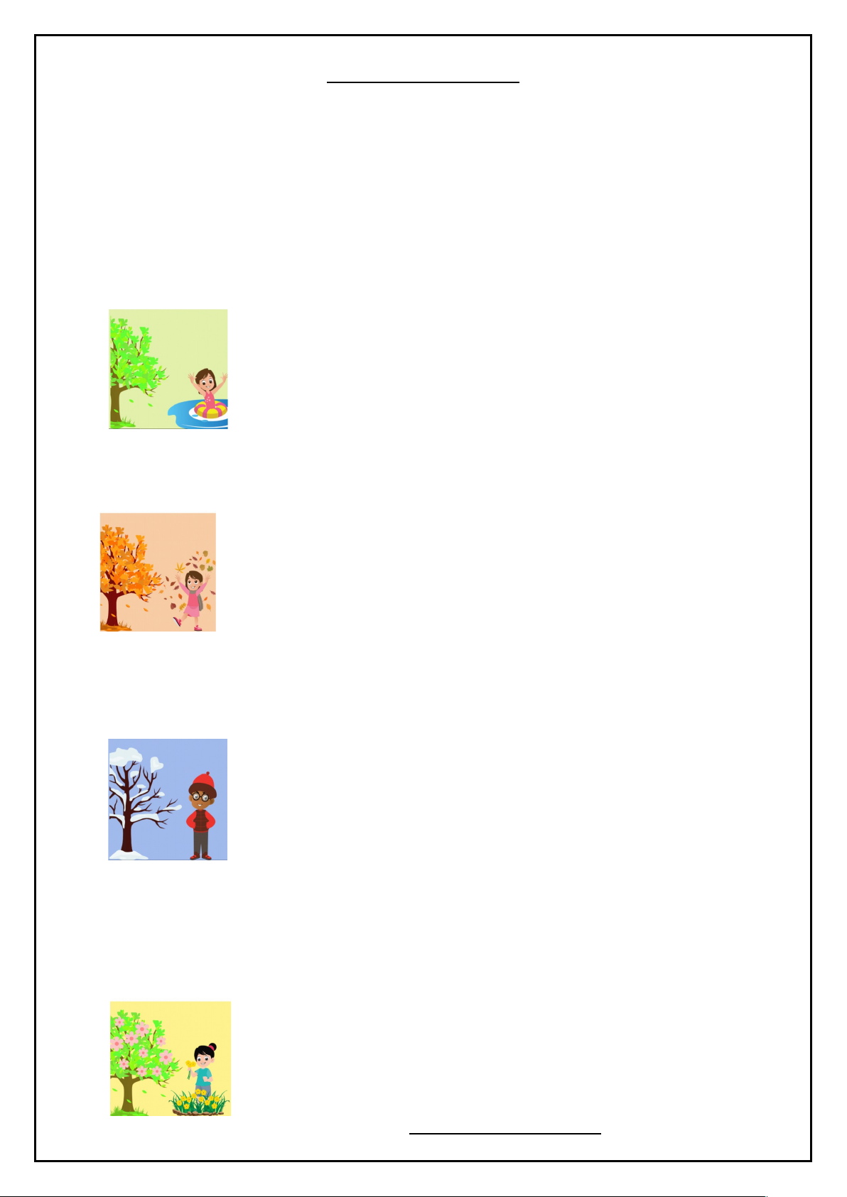 As Estações do Ano As estações do ano são períodos do ano que têm características climáticas distintas. Existem quatro estações: primavera, verão, outono e inverno. Cada uma delas traz mudanças na temperatura, na quantidade de chuva e na natureza ao nosso redor. · Verão - 22 de dezembro a 20 de março O verão é a estação mais quente do ano. É o momento em que as temperaturas podem ficar muito elevadas e a luz do sol é intensa. Muitas pessoas aproveitam essa época para ir à praia, fazer piqueniques e se relaxar ao ar livre. · Outono - 20 de março a 21 de junho No outono, as folhas das árvores começam a mudar de cor e a cair. As temperaturas diminuem gradualmente, preparando os animais e as plantas para o inverno. Essa estação é marcada pela colheita de muitos frutos, como maçãs e abóboras. · Inverno - 21 de junho a 23 de setembro O inverno é a estação mais fria do ano. Muitas regiões experimentam quedas de temperatura e, em alguns lugares, até mesmo a neve. É comum usar roupas quentinhas, como casacos, e desfrutar de bebidas quentes. Algumas plantas entram em dormência para sobreviver ao frio. · Primavera - 23 de setembro a 22 de dezembro A primavera é conhecida como a estação das flores. Nela, as temperaturas começam a subir, e as plantas florescem, trazendo cores e aromas agradáveis. É um tempo de renovação e crescimento. As Estações do Ano As estações do ano são períodos do ano que têm características climáticas distintas. Existem quatro estações: primavera, verão, outono e inverno. Cada uma delas traz mudanças na temperatura, na quantidade de chuva e na natureza ao nosso redor. · Verão - 22 de dezembro a 20 de março O verão é a estação mais quente do ano. É o momento em que as temperaturas podem ficar muito elevadas e a luz do sol é intensa. Muitas pessoas aproveitam essa época para ir à praia, fazer piqueniques e se relaxar ao ar livre. · Outono - 20 de março a 21 de junho No outono, as folhas das árvores começam a mudar de cor e a cair. As temperaturas diminuem gradualmente, preparando os animais e as plantas para o inverno. Essa estação é marcada pela colheita de muitos frutos, como maçãs e abóboras. · Inverno - 21 de junho a 23 de setembro O inverno é a estação mais fria do ano. Muitas regiões experimentam quedas de temperatura e, em alguns lugares, até mesmo a neve. É comum usar roupas quentinhas, como casacos, e desfrutar de bebidas quentes. Algumas plantas entram em dormência para sobreviver ao frio. · Primavera - 23 de setembro a 22 de dezembro A primavera é conhecida como a estação das flores. Nela, as temperaturas começam a subir, e as plantas florescem, trazendo cores e aromas agradáveis. É um tempo de renovação e crescimento. image1.png image2.png image3.png image4.png