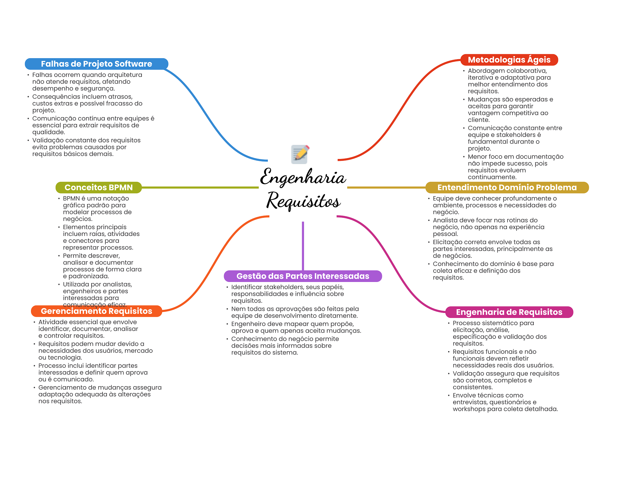 Falhas de Projeto Software Metodologias Ágeis Abordagem colaborativa, Falhas ocorrem quando arquitetura iterativa e adaptativa para não atende requisitos, afetando melhor entendimento dos desempenho e segurança. requisitos. Consequências incluem atrasos, Mudanças são esperadas e custos extras e possível fracasso do aceitas para garantir projeto. vantagem competitiva ao Comunicação contínua entre equipes é cliente. essencial para extrair requisitos de Comunicação constante entre qualidade. equipe e stakeholders é Validação constante dos requisitos fundamental durante evita problemas causados por projeto. requisitos básicos demais. Menor foco em documentação não impede sucesso, pois Engenharia requisitos evoluem continuamente. Conceitos BPMN Entendimento Domínio Problema BPMN é uma notação gráfica padrão para Requisitos Equipe deve conhecer profundamente ambiente, processos e necessidades do modelar processos de negócio. negócios. Analista deve focar nas rotinas do Elementos principais negócio, não apenas na experiência incluem raias, atividades pessoal. e conectores para Elicitação correta envolve todas as representar processos. partes interessadas, principalmente as Permite descrever, de negócios. analisar e documentar Conhecimento do domínio é base para processos de forma clara coleta eficaz e definição dos e padronizada. Gestão das Partes Interessadas requisitos. Utilizada por analistas, Identificar stakeholders, seus papéis, engenheiros e partes responsabilidades e influência sobre interessadas para requisitos. comunicação eficaz Gerenciamento Requisitos Nem todas as aprovações são feitas pela equipe de desenvolvimento diretamente. Engenharia de Requisitos Atividade essencial que envolve Engenheiro deve mapear quem propõe, Processo sistemático para identificar, documentar, analisar aprova e quem apenas aceita mudanças. elicitação, análise, e controlar requisitos. Conhecimento do negócio permite especificação e validação dos Requisitos podem mudar devido a decisões mais informadas sobre requisitos. necessidades dos usuários, mercado requisitos do sistema. Requisitos funcionais e não ou tecnologia. funcionais devem refletir Processo inclui identificar partes necessidades reais dos usuários. interessadas e definir quem aprova Validação assegura que requisitos ou é comunicado. são corretos, completos e Gerenciamento de mudanças assegura consistentes. adaptação adequada às alterações Envolve técnicas como nos requisitos. entrevistas, questionários e workshops para coleta detalhada.